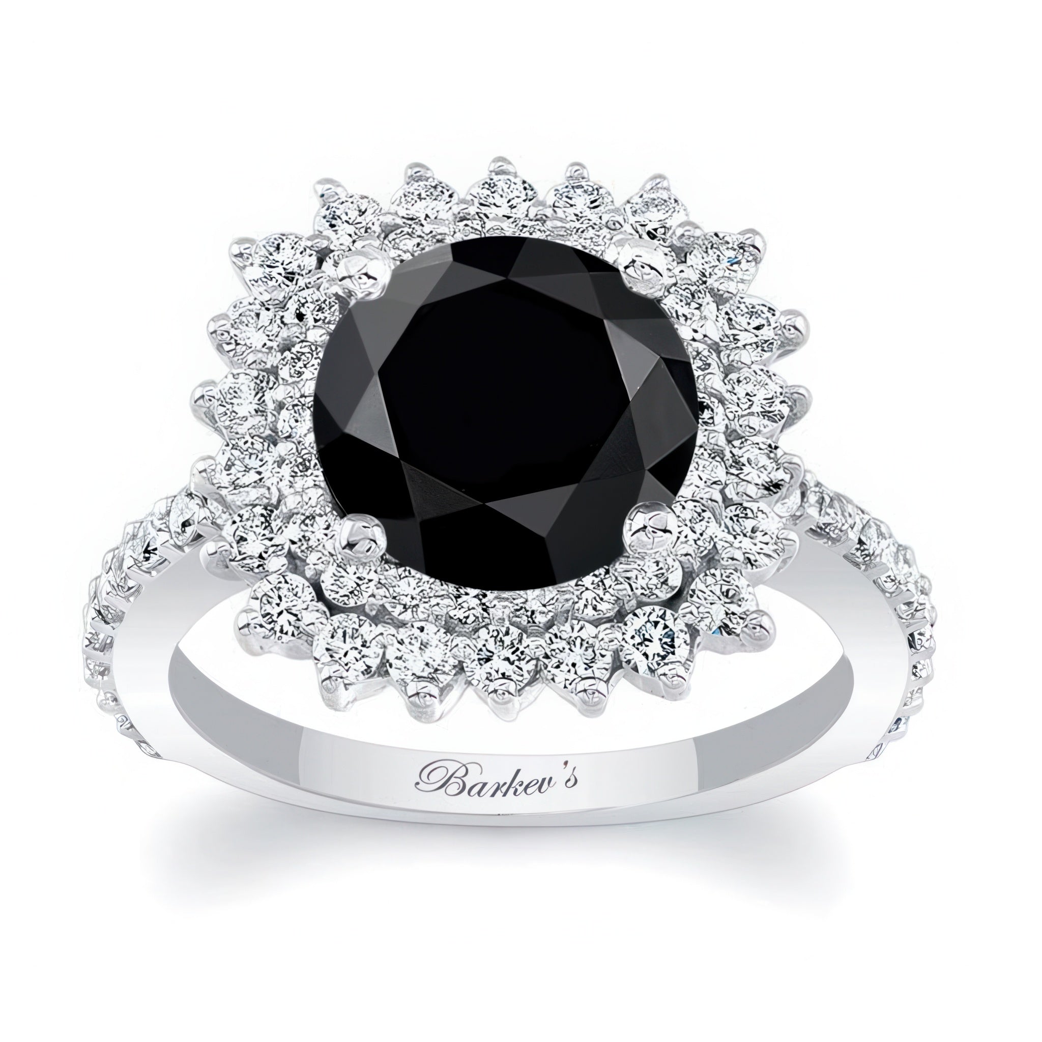 This 3 carat black and white diamond engagement ring features a prong set round center framed by a diamond halo forming a starburst pattern with shared prong set diamond melees running down the shoulders for an added touch of glamour.