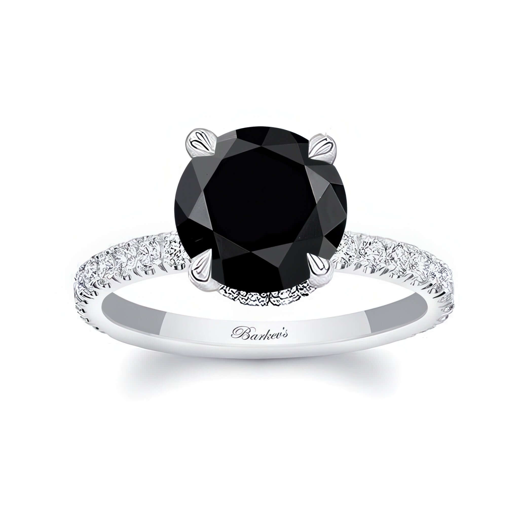 A brilliant 3 carat black and white diamond halo engagement ring featuring a prong set round center with a french cut pave diamond halo underneath it and more diamonds cascading down the shank.