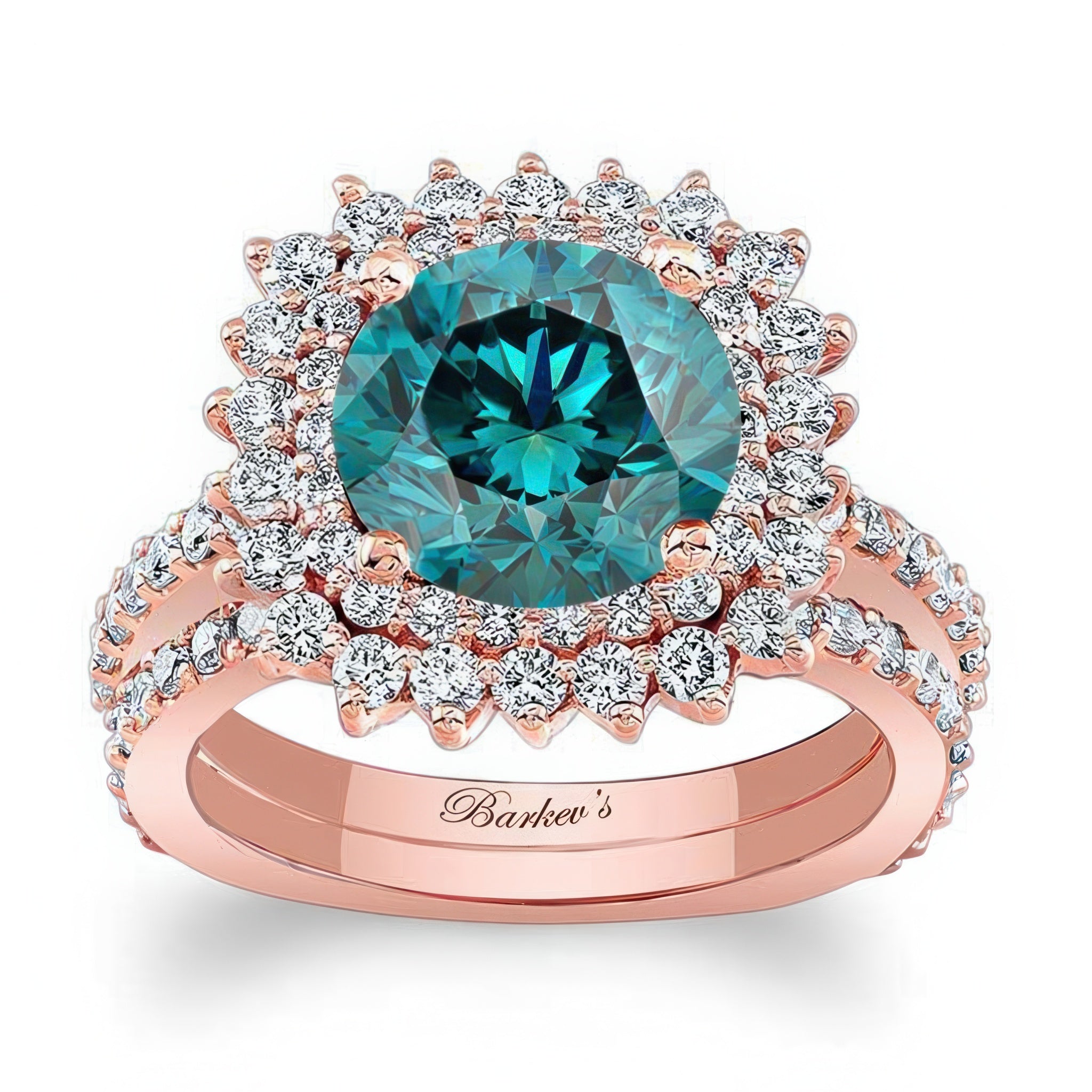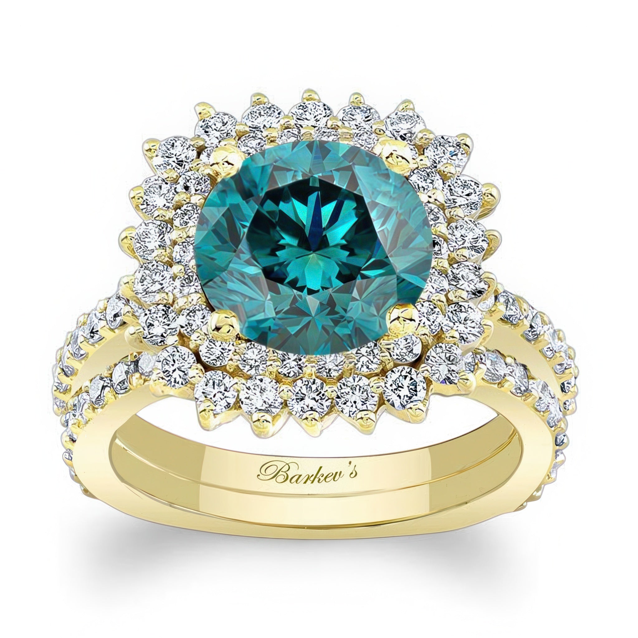 This 3 carat blue and white diamond engagement ring set features a prong set round center framed by a diamond halo forming a starburst pattern with shared prong set diamond melees running down the shoulders and wedding band for an added touch of glamour.