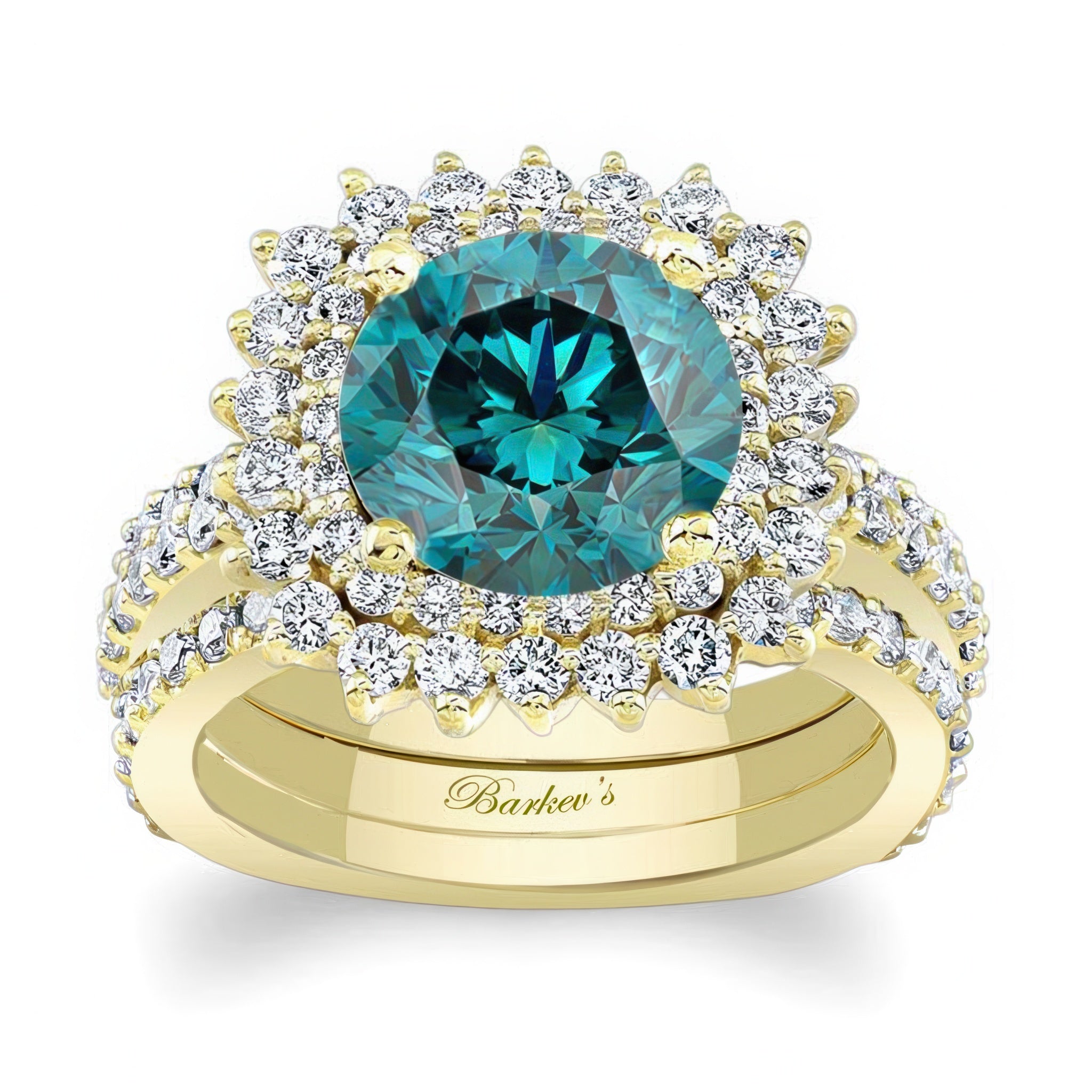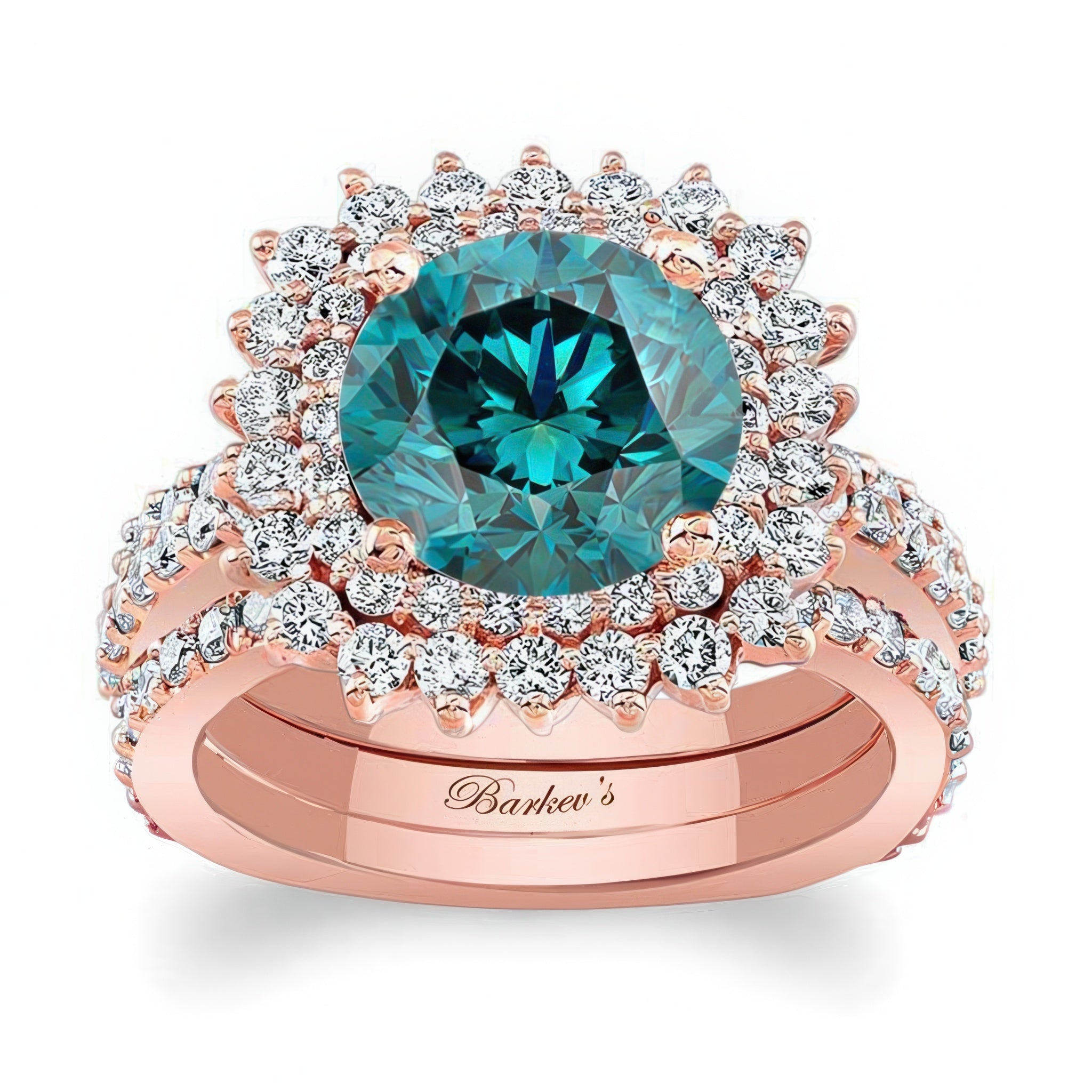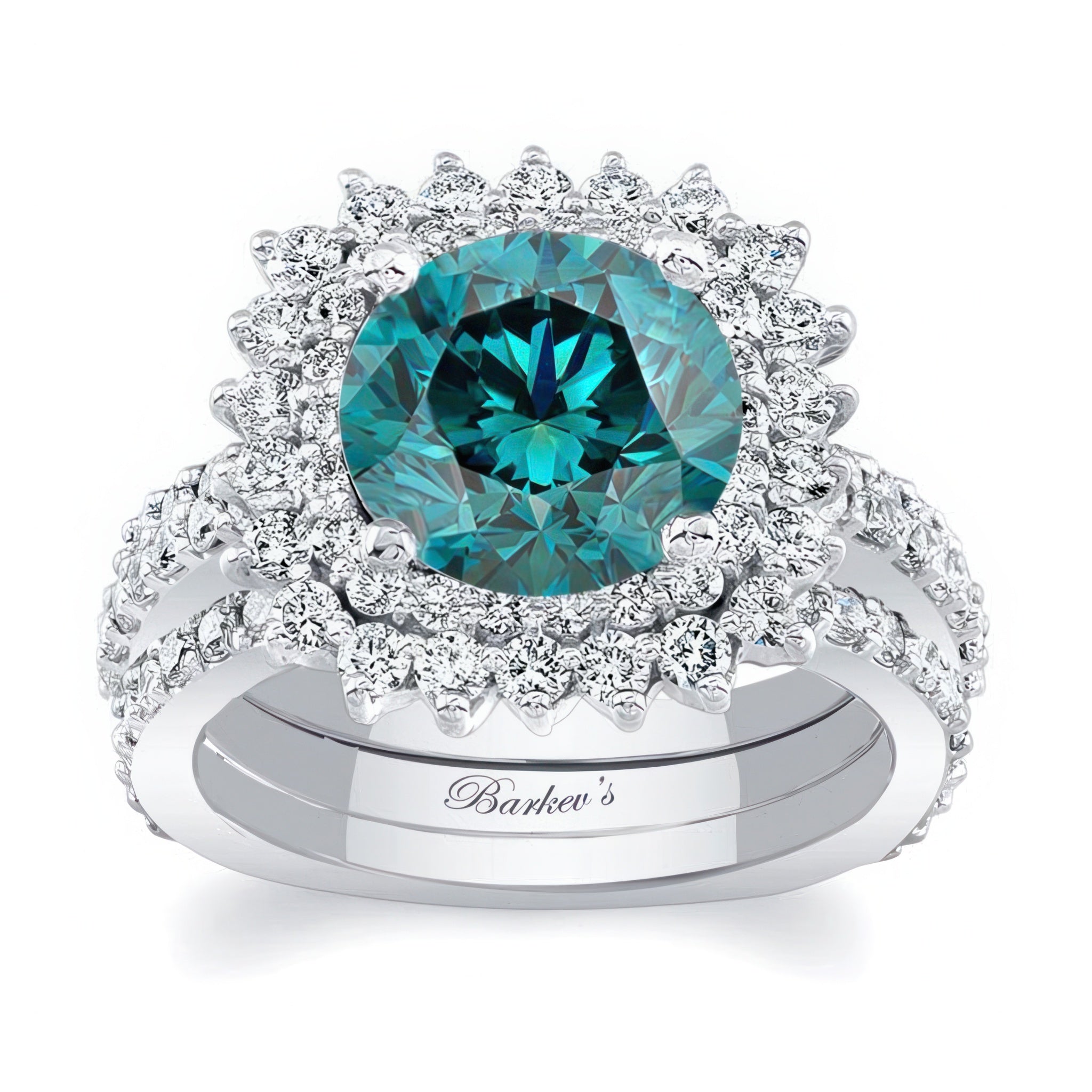 This 3 carat blue and white diamond engagement ring set with 2 bands features a prong set round center framed by a diamond halo forming a starburst pattern with shared prong set diamond melees running down the shoulders and wedding bands for an added touch of glamour.