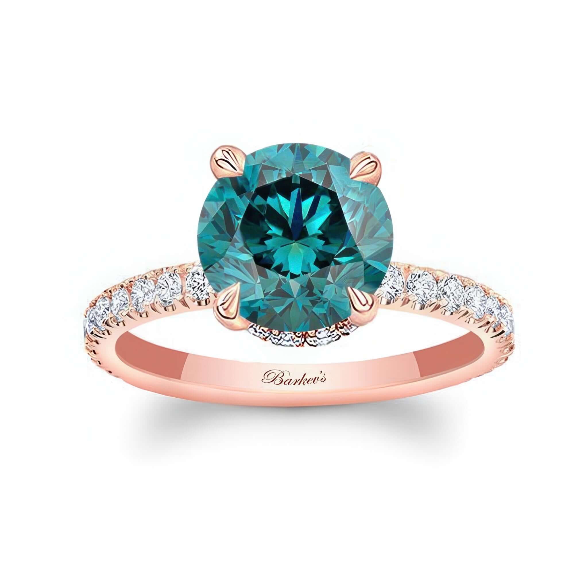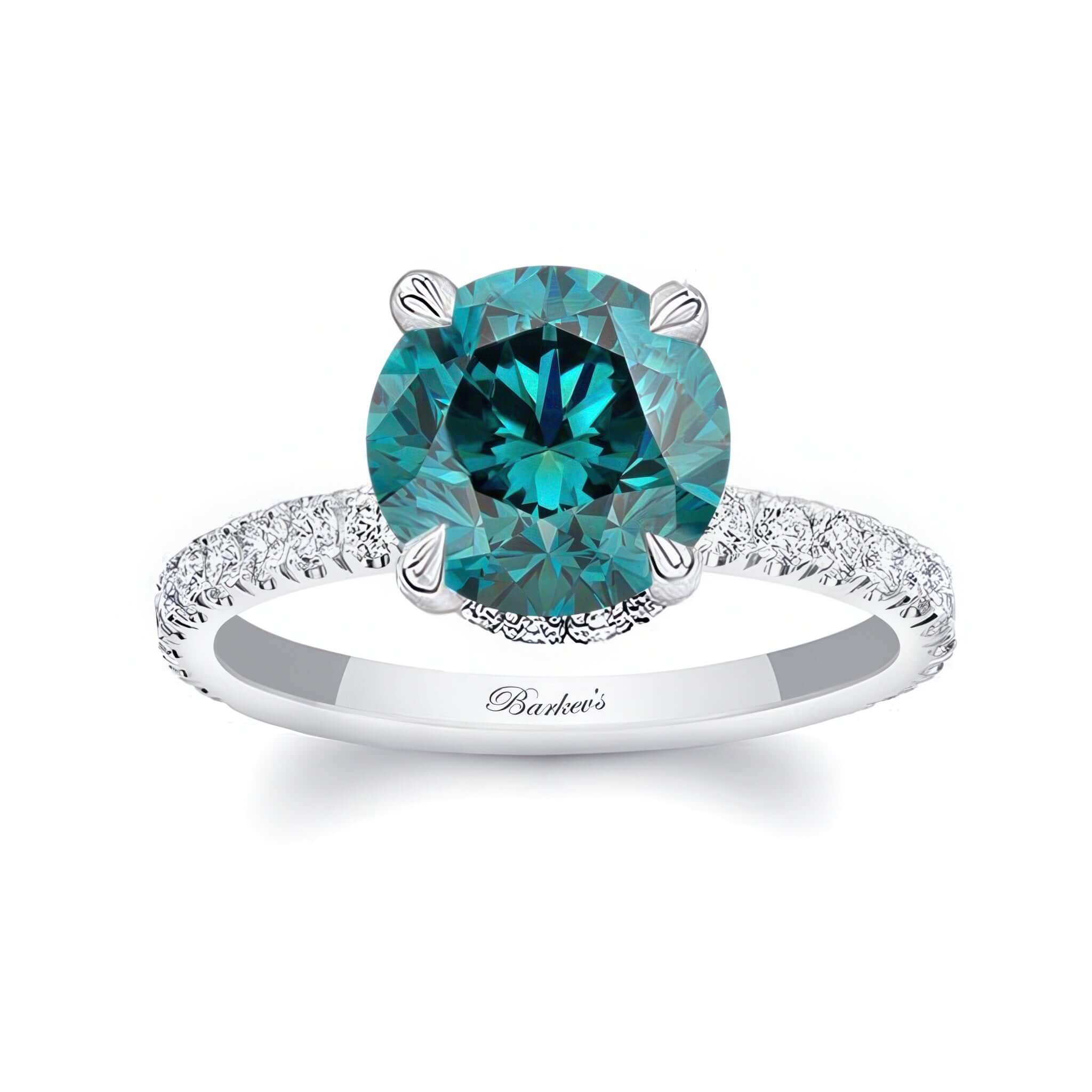 A brilliant 3 carat blue and white diamond halo engagement ring featuring a prong set round center with a french cut pave diamond halo underneath it and more diamonds cascading down the shank.