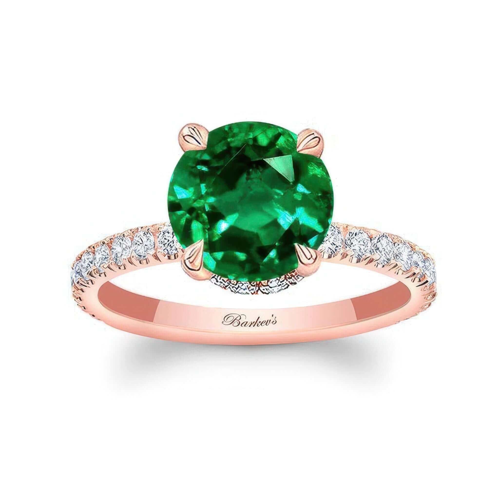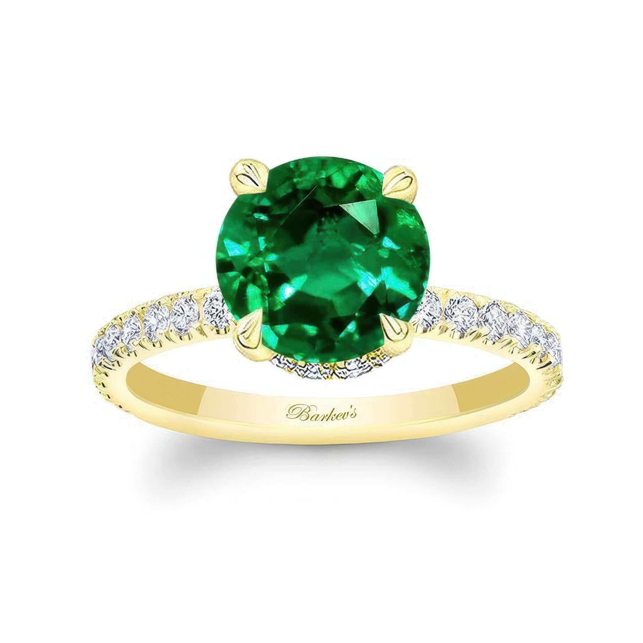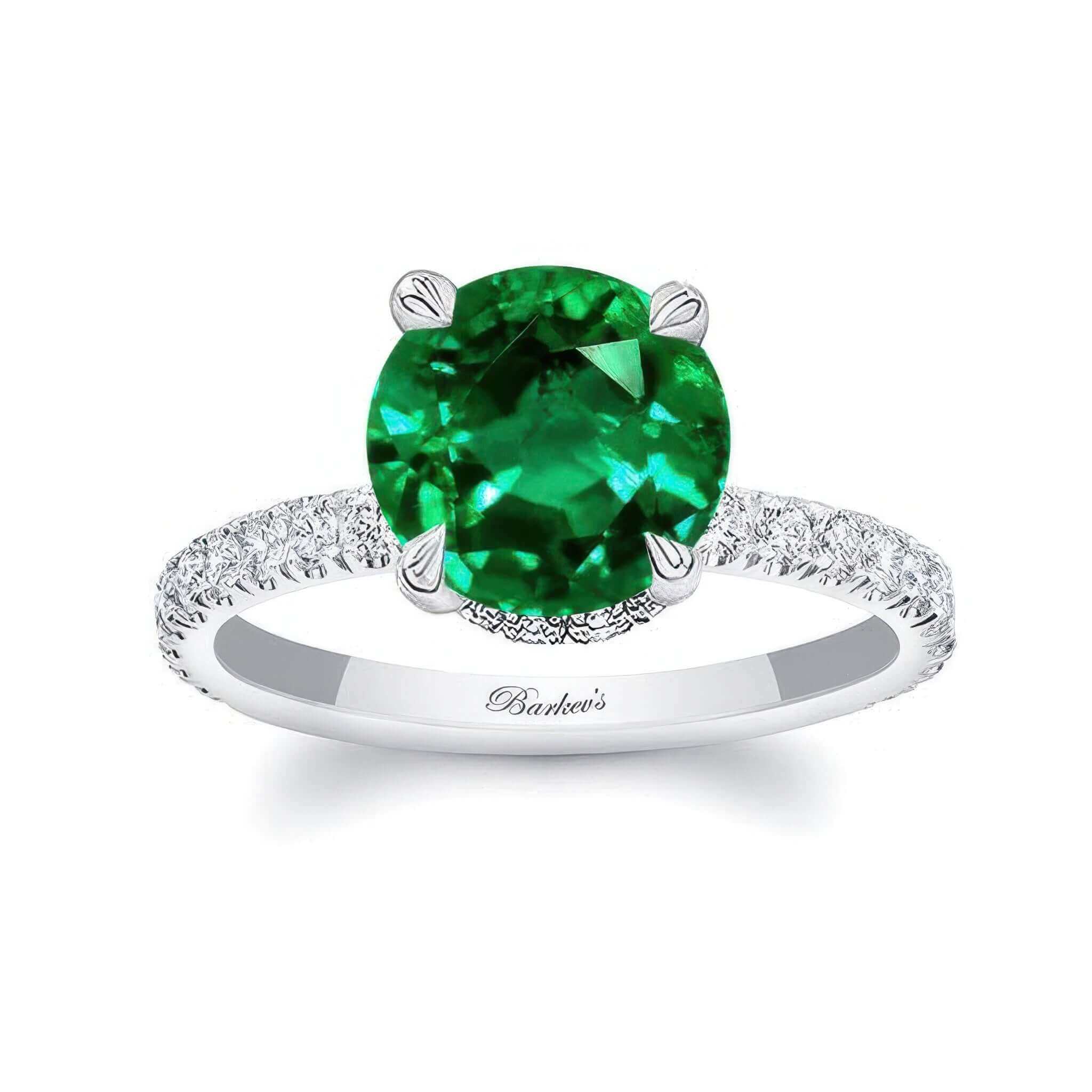 A brilliant 3 carat lab grown emerald and diamond halo engagement ring featuring a prong set round center with a french cut pave diamond halo underneath it and more diamonds cascading down the shank.