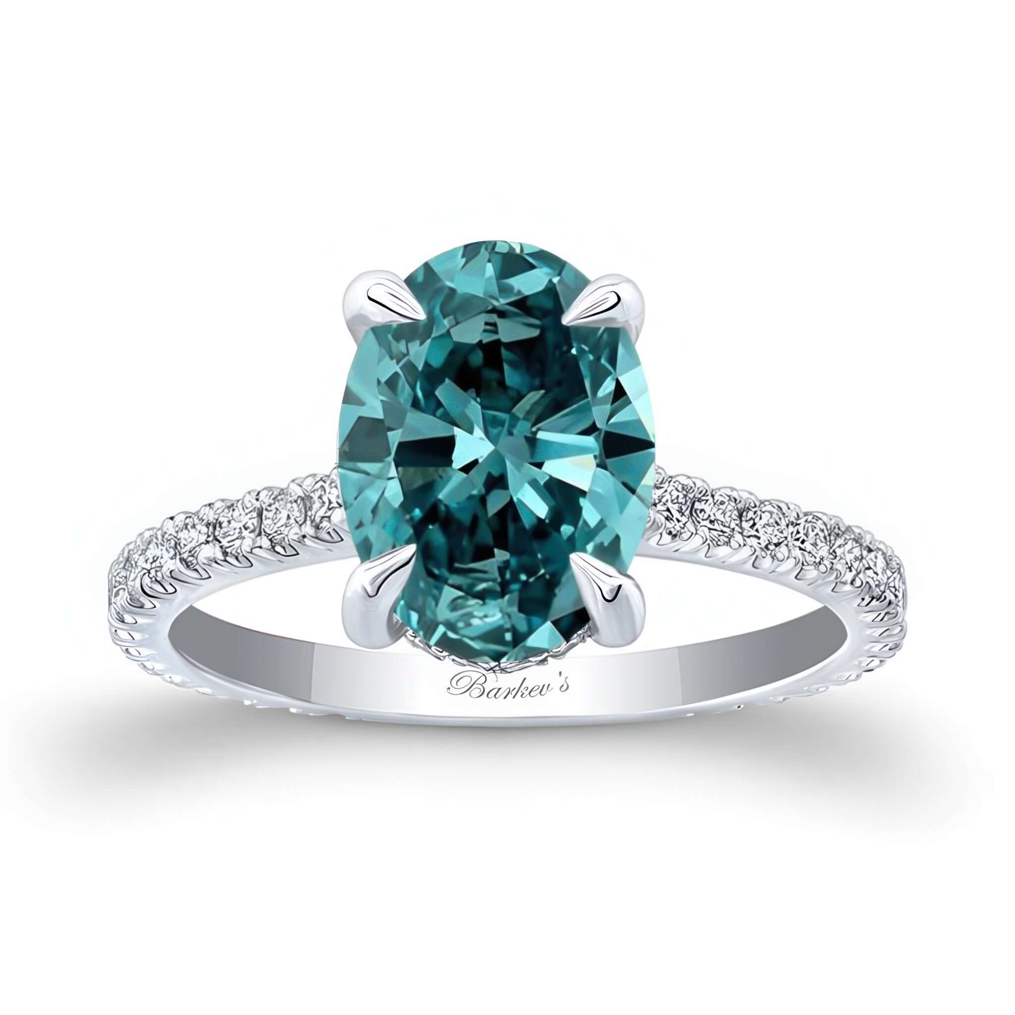 A beautiful 3 carat oval blue and white diamond engagement ring with hidden halo featuring brilliant diamonds that surround the prong set oval center just underneath it and more pave set diamonds flowing down the shank.