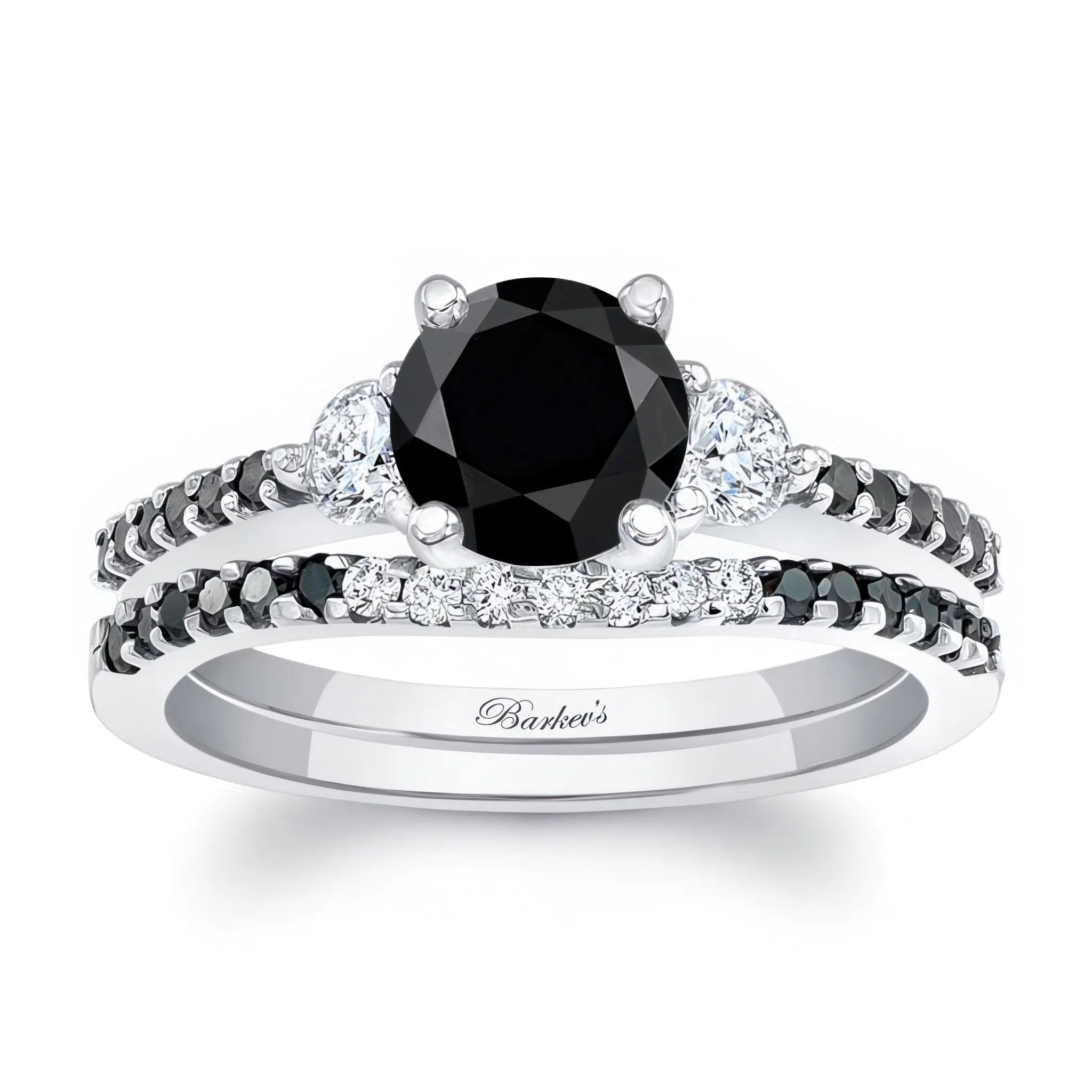 This 3 stone black diamond wedding ring set features an engagement ring with diamonds flanking the prong-set round center. The dainty shoulders and matching band are accented with shared prong set black and white diamonds adding a finishing touch of elegance to this set.