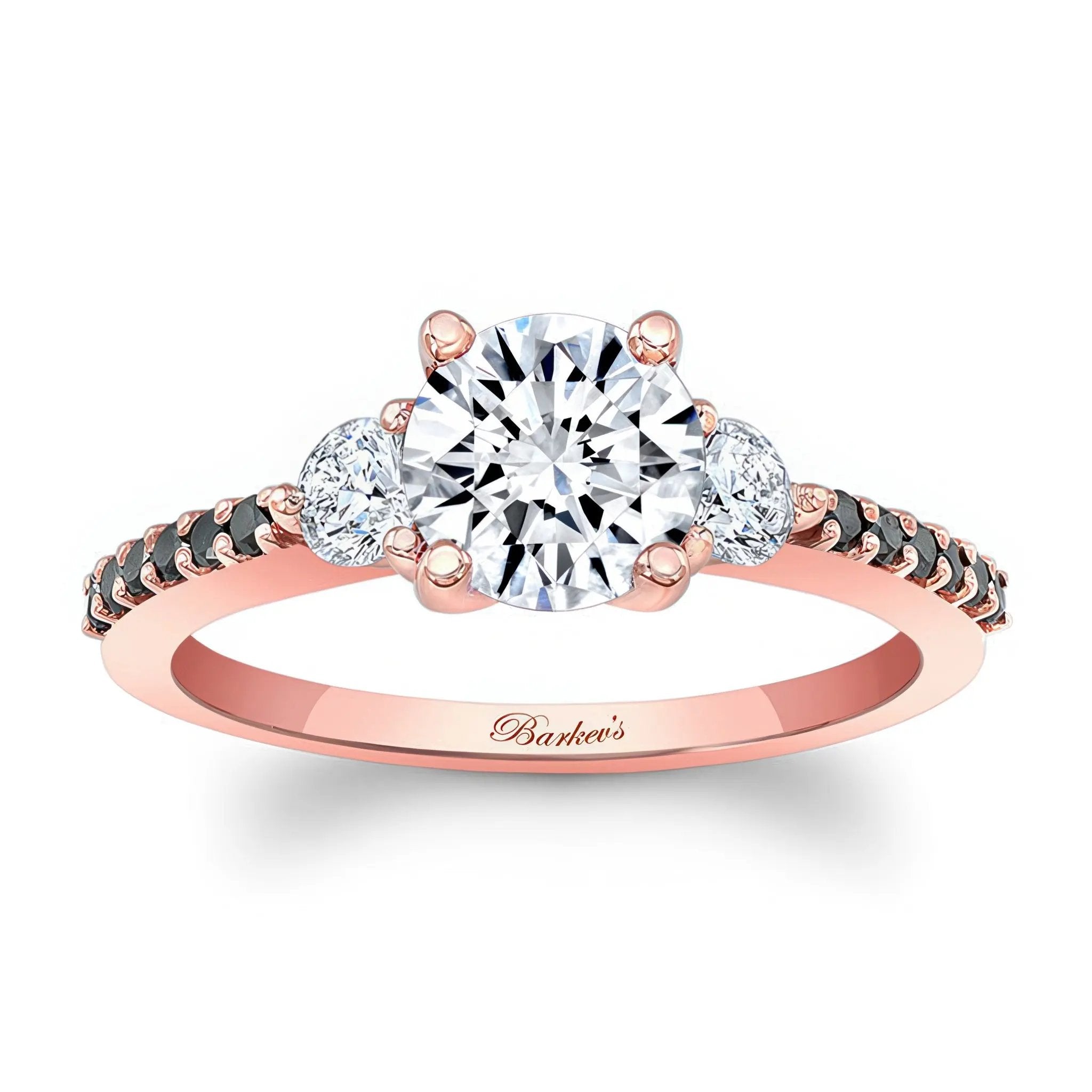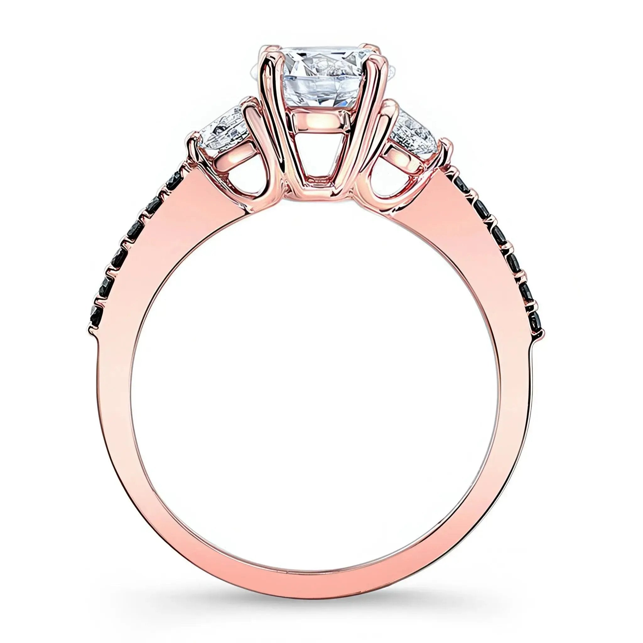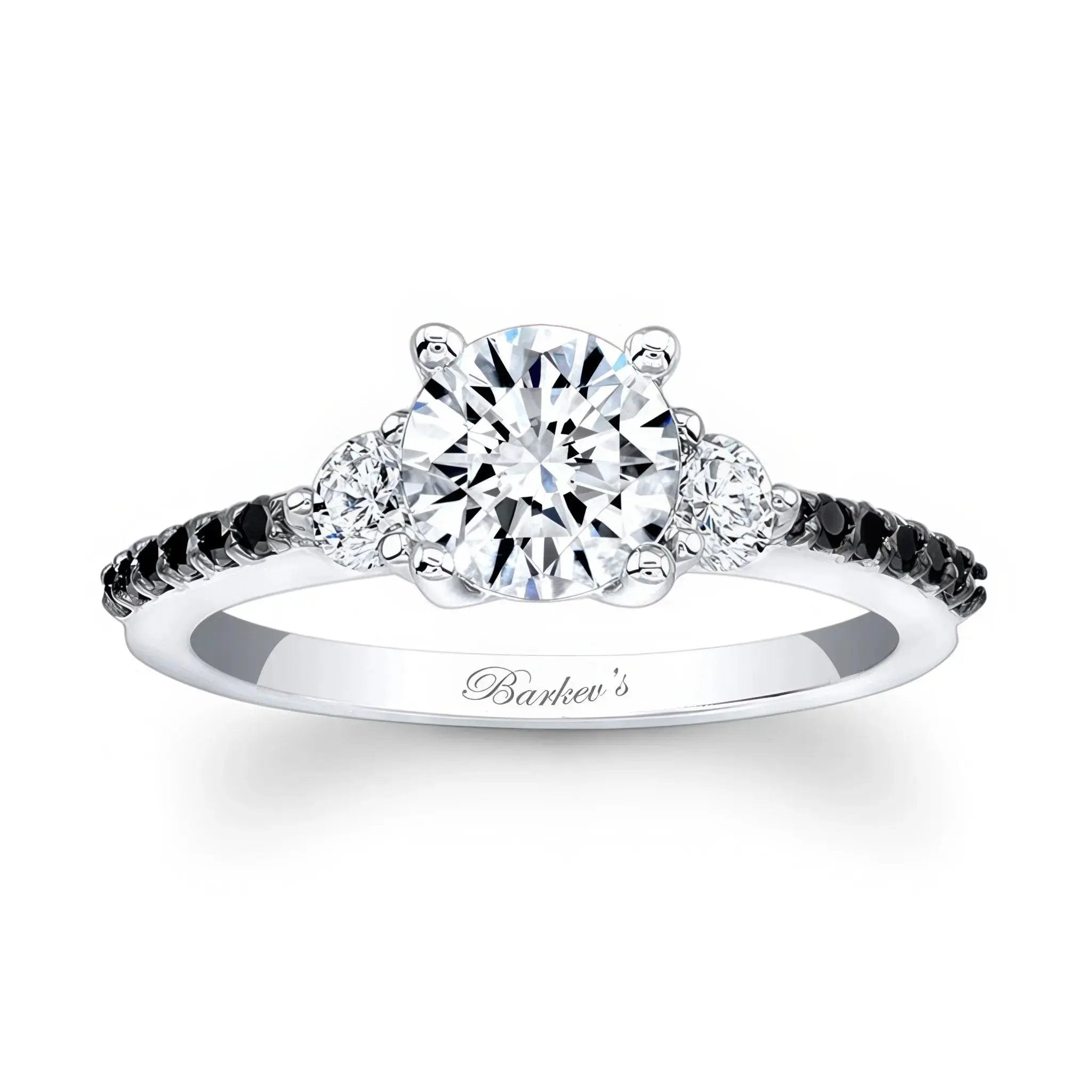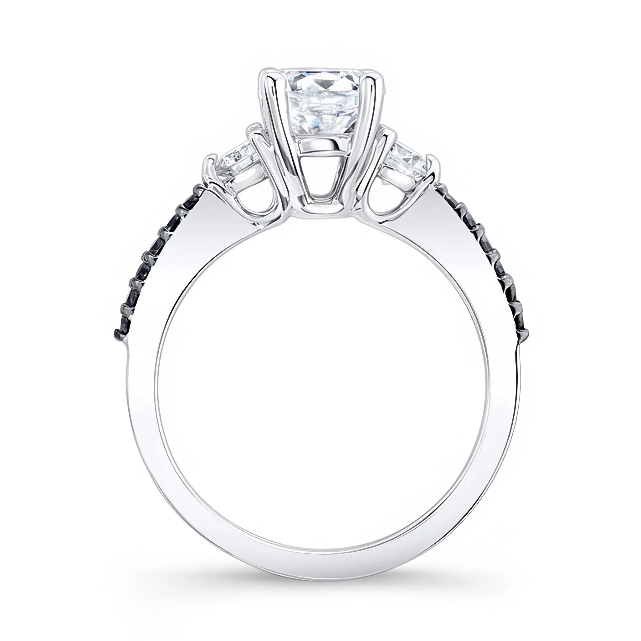 This 3 stone lab diamond ring with black diamond accents features diamonds flanking the prong-set round center. The dainty shoulders are adorned with shared prong set black diamonds adding the finishing touch of elegance to this ring.