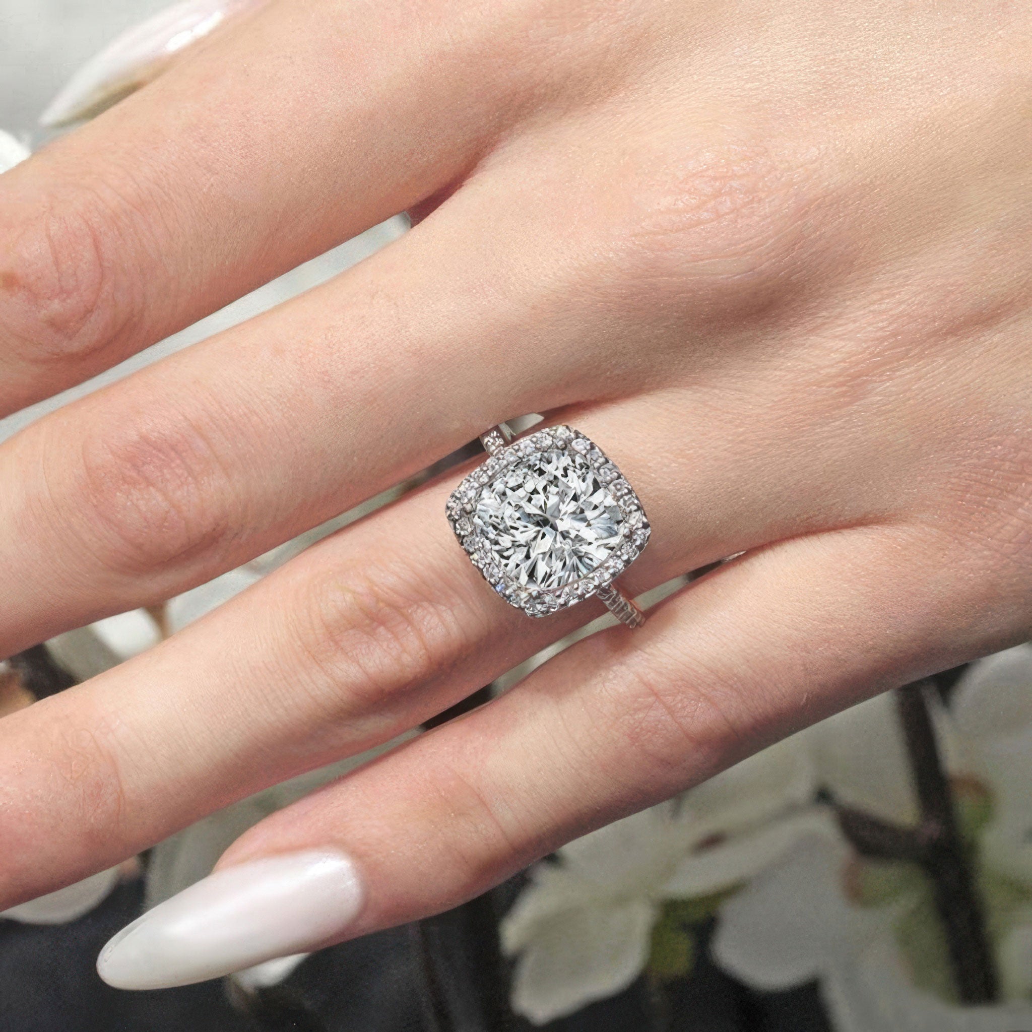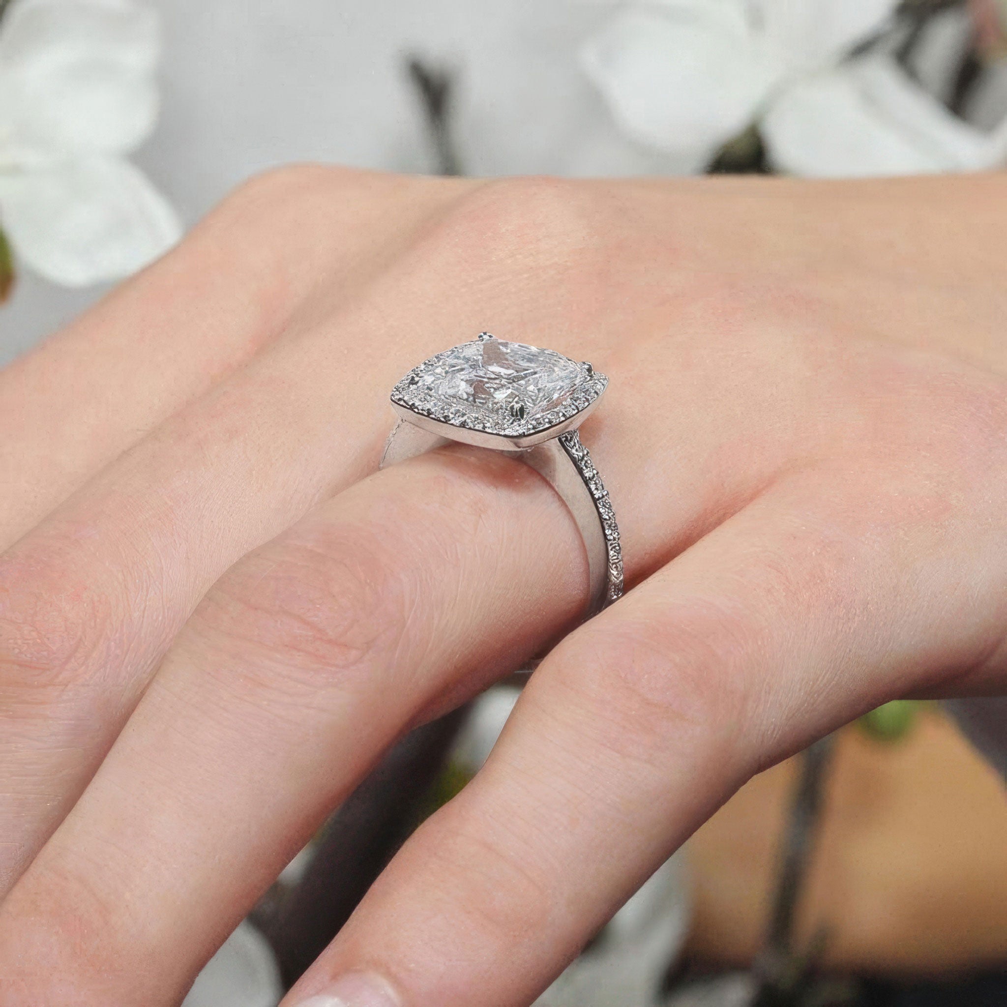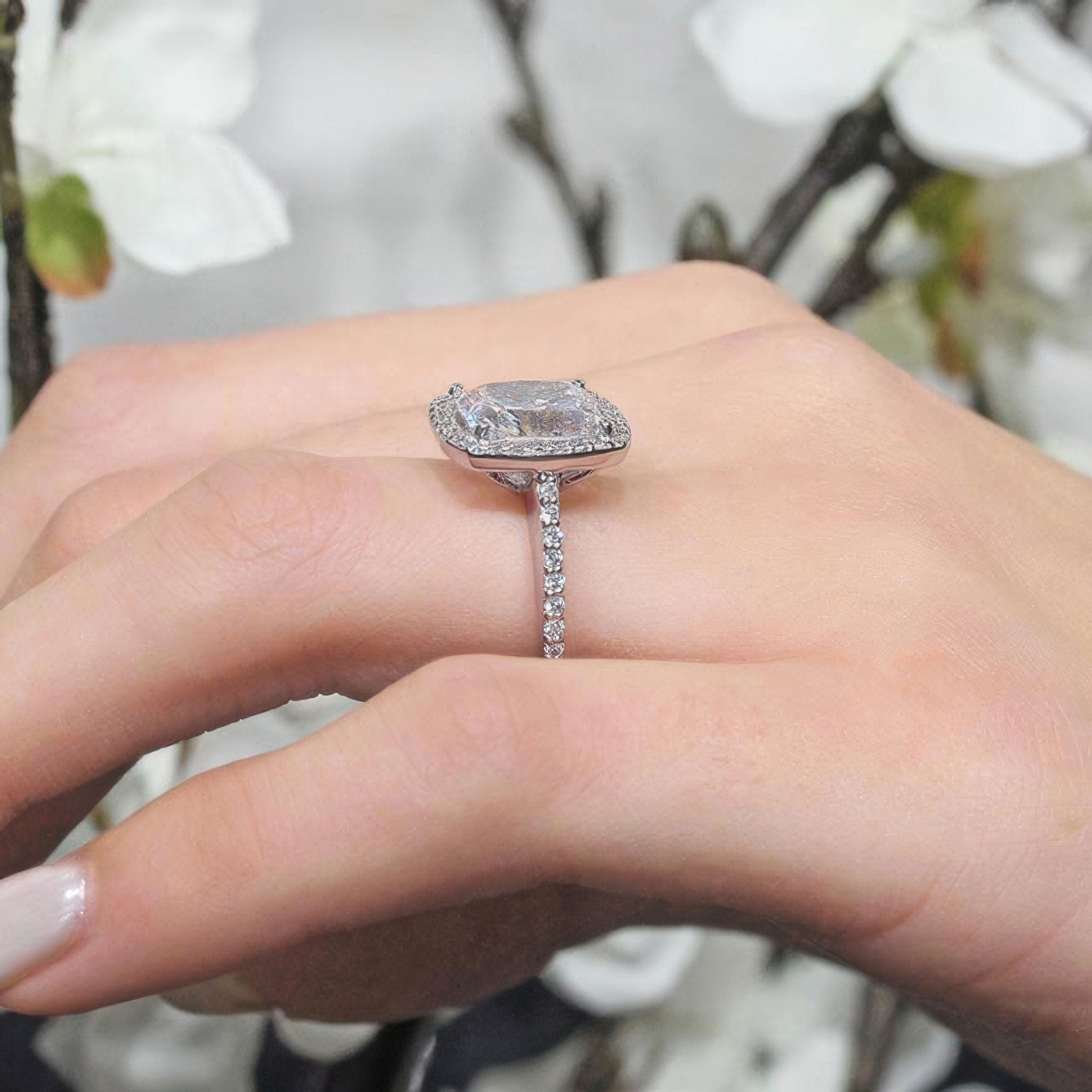 A spectacular 5 carat cushion cut diamond halo ring sure to capture the eye of many admirers. Featuring a prong set cushion cut center, with a halo surrounding it and additional side stones cascading down the dainty shank for a show stopping look that makes a bold statement.