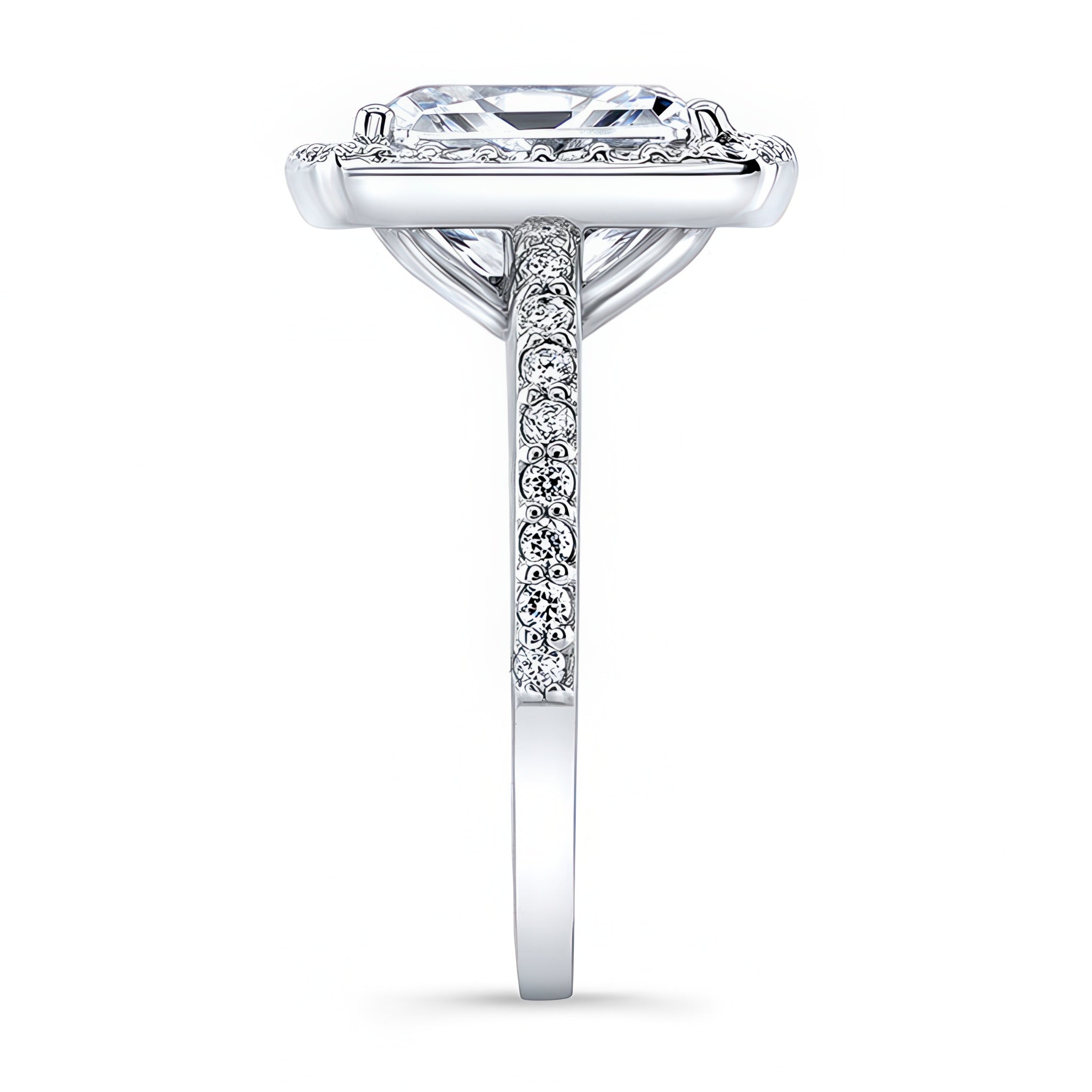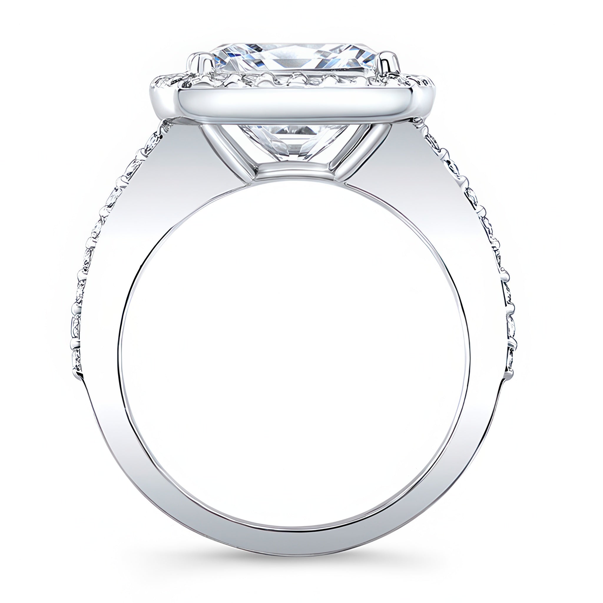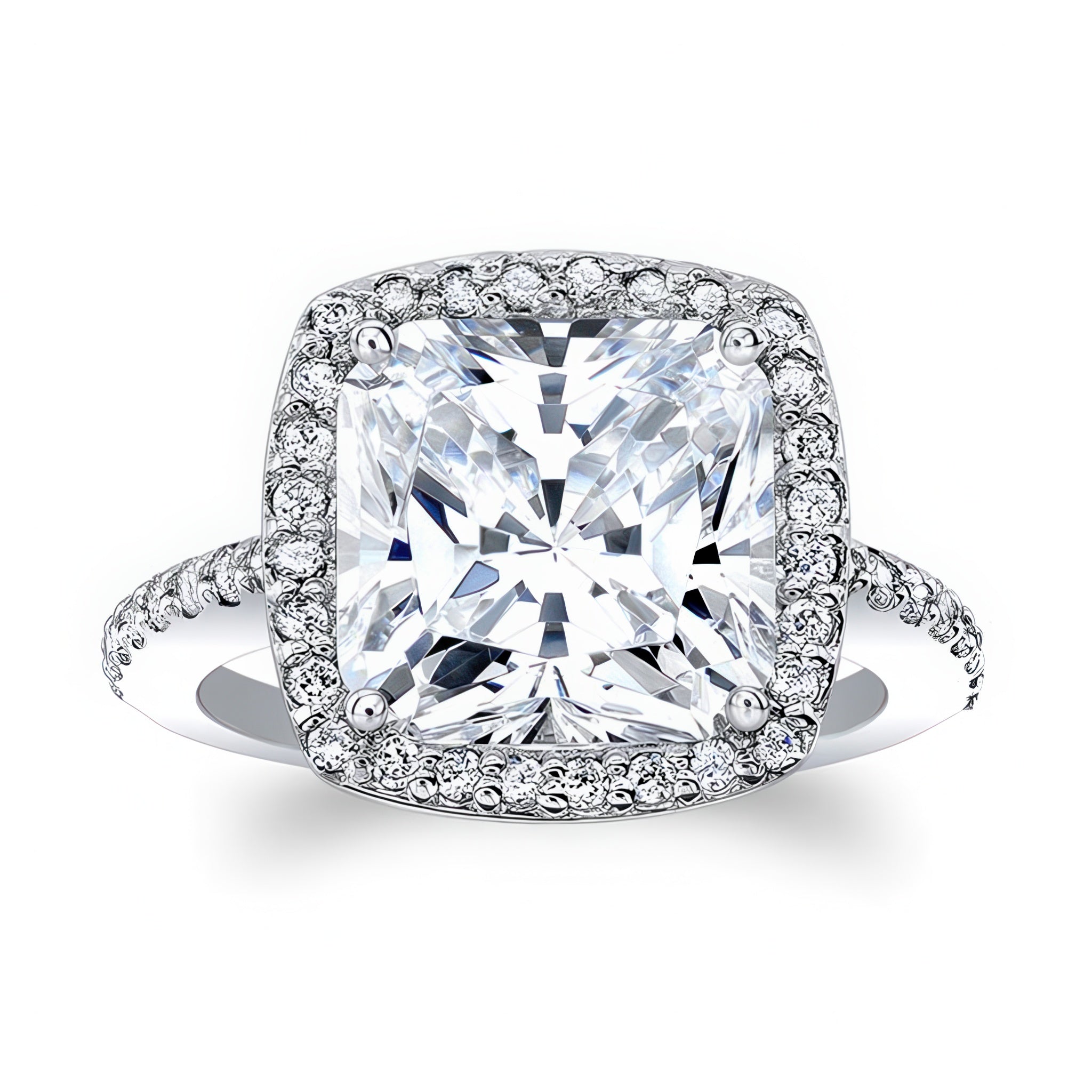 A spectacular 5 carat cushion cut diamond halo ring sure to capture the eye of many admirers. Featuring a prong set cushion cut center, with a halo surrounding it and additional side stones cascading down the dainty shank for a show stopping look that makes a bold statement.