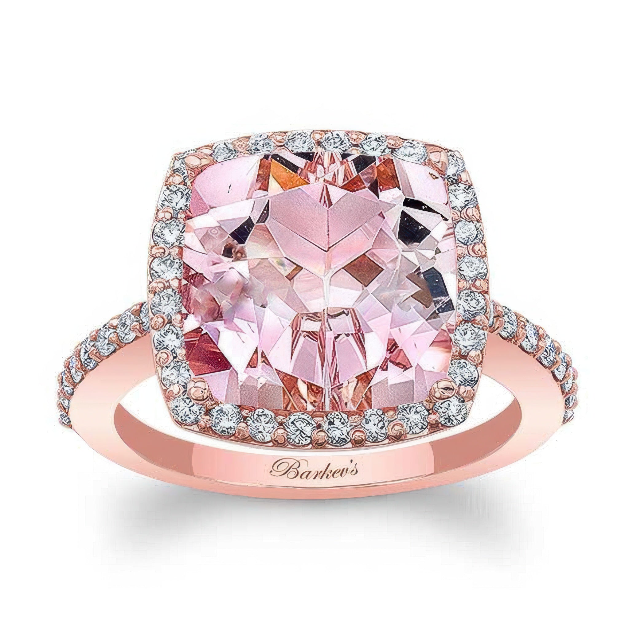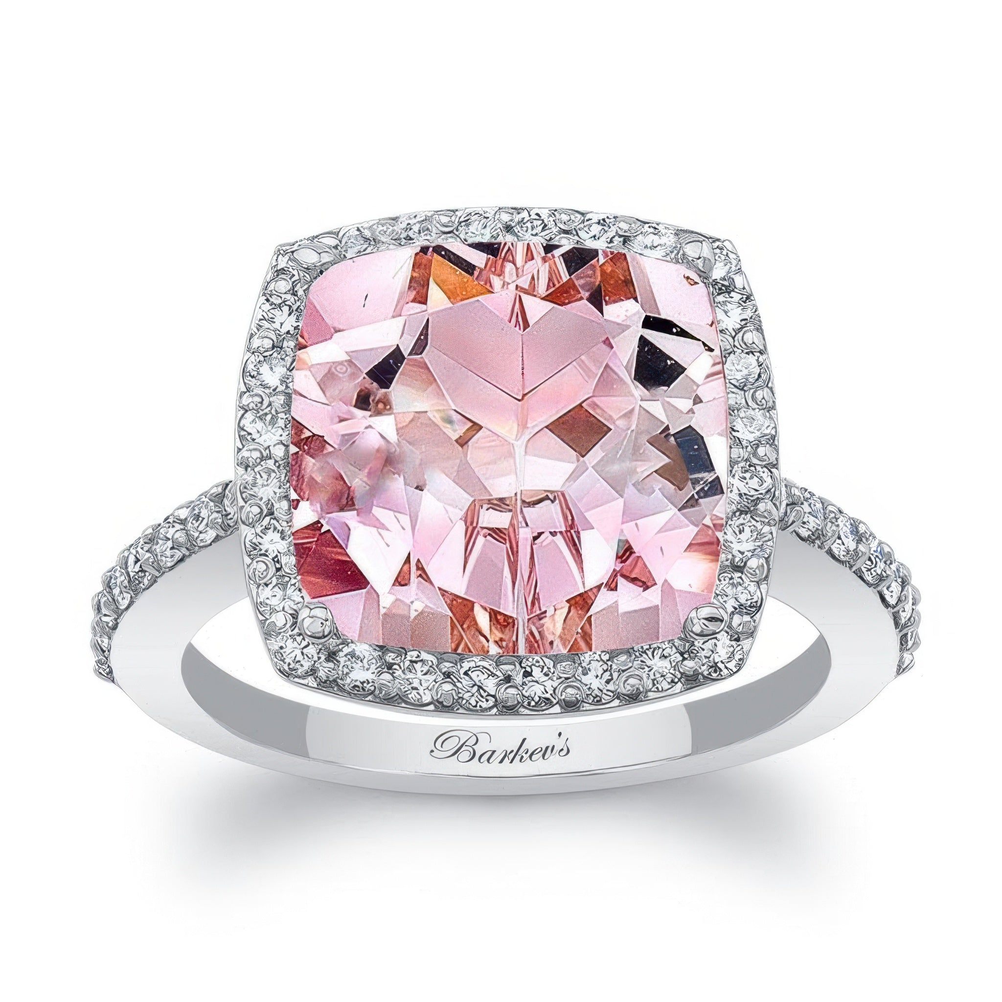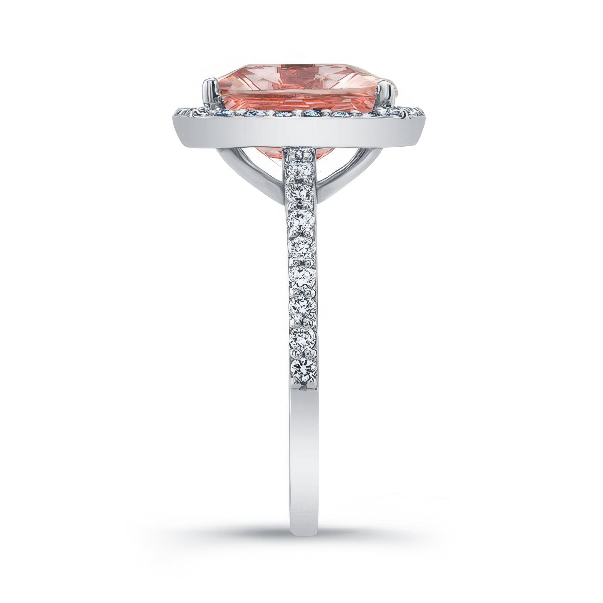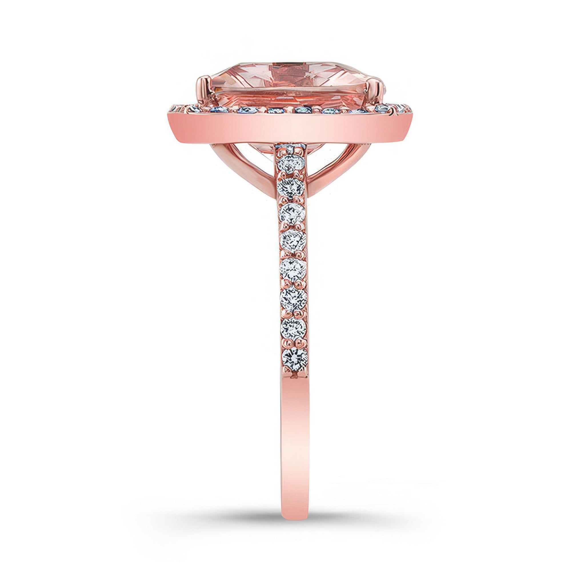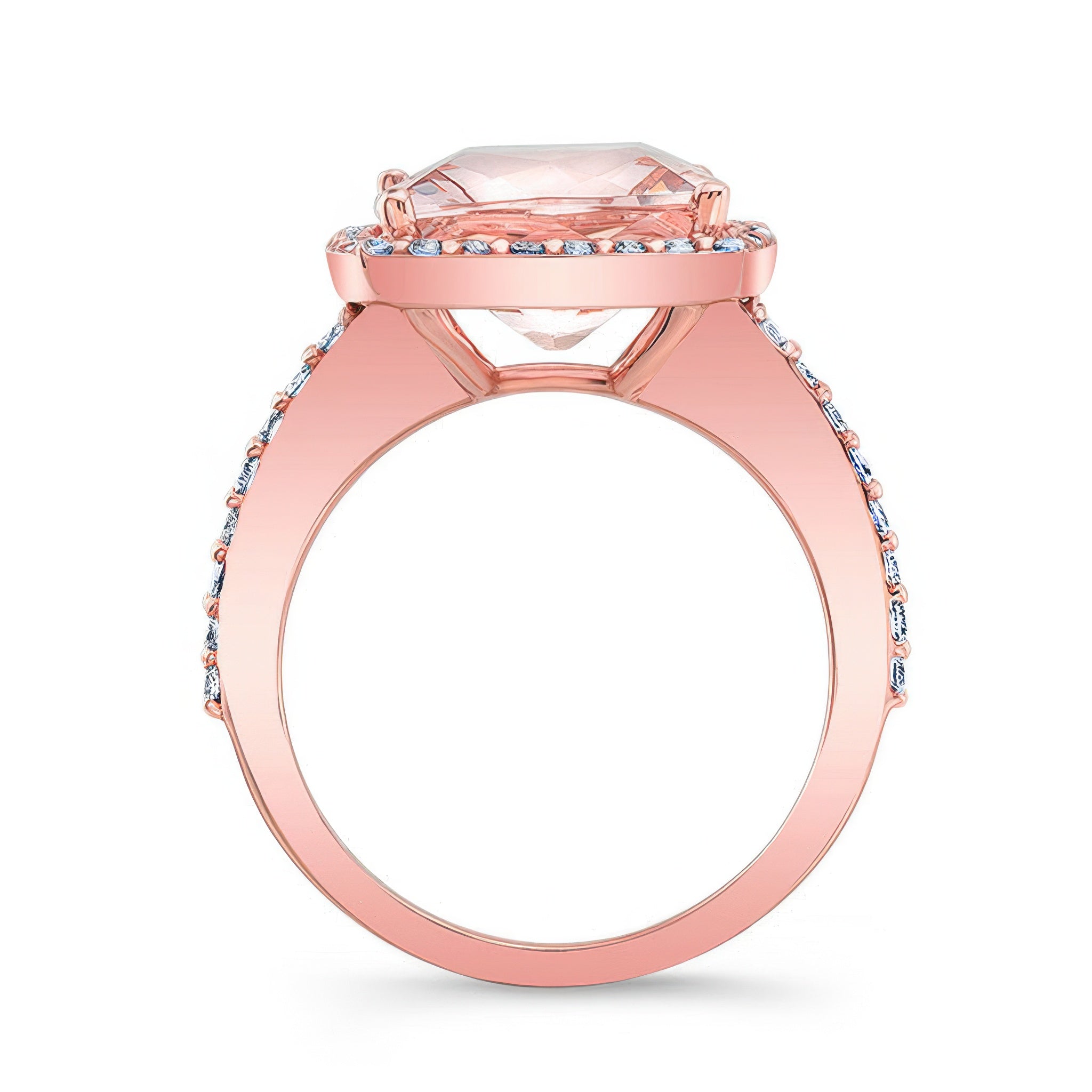 A spectacular 5 carat cushion cut morganite halo ring sure to capture the eye of many admirers. Featuring a prong set cushion cut center, with a halo surrounding it and additional side stones cascading down the dainty shank for a show stopping look that makes a bold statement.