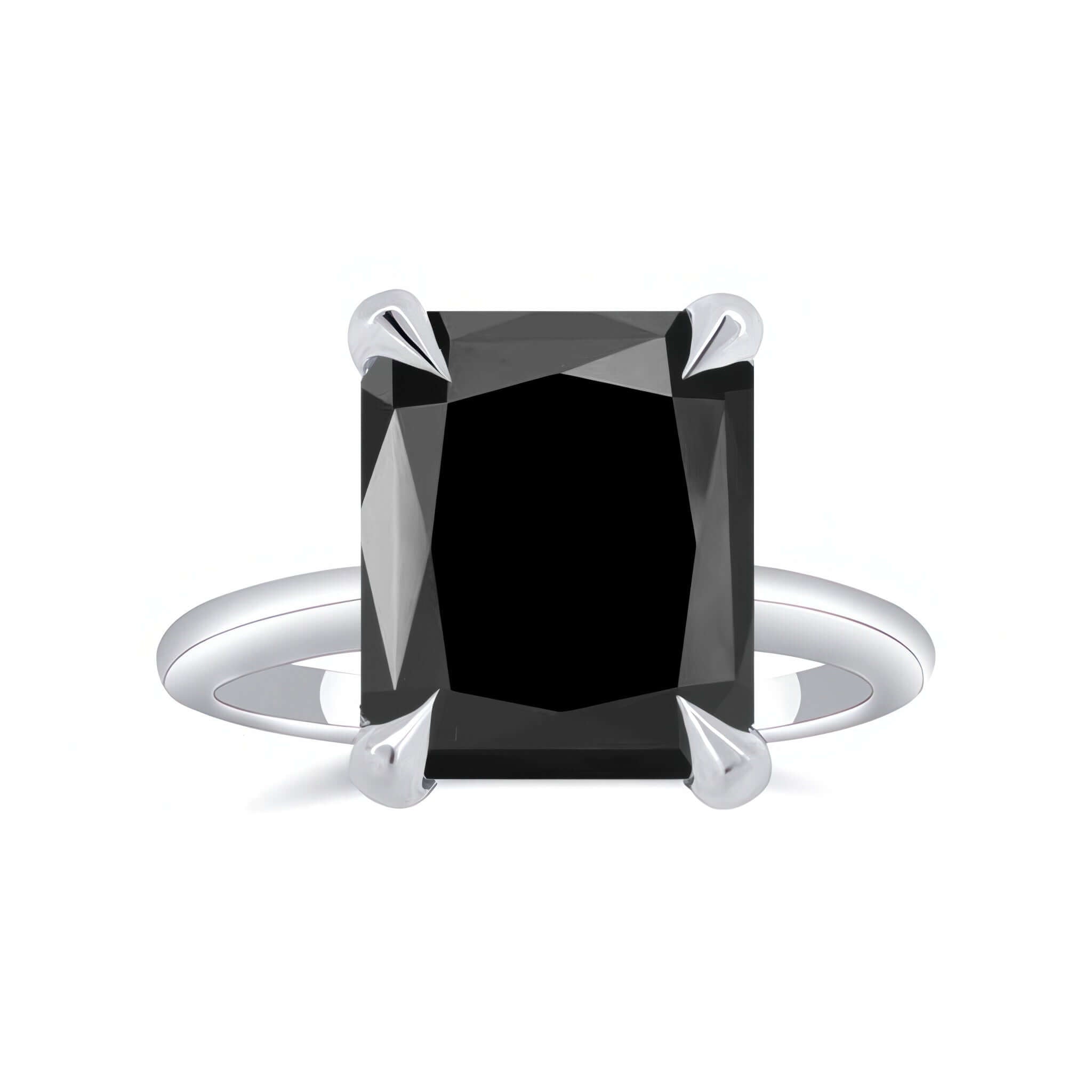 A stunning 5 carat radiant cut black diamond ring featuring a hidden halo of diamonds right under the center for a show stopping look.