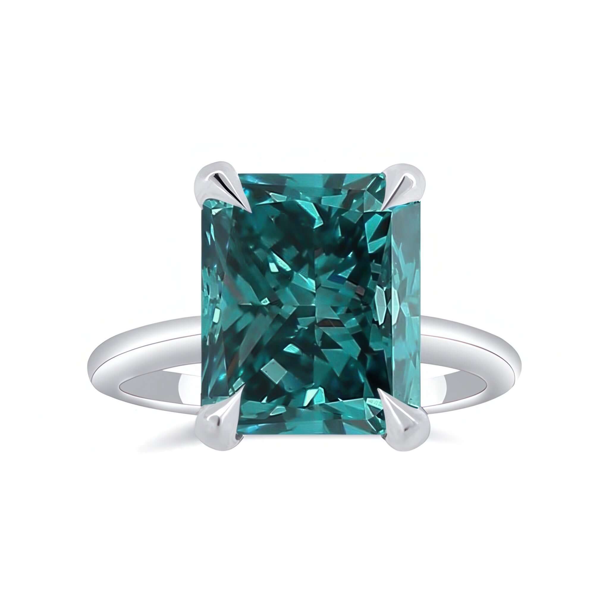 A stunning 5 carat radiant cut blue diamond ring featuring a hidden halo of diamonds right under the center for a show stopping look.