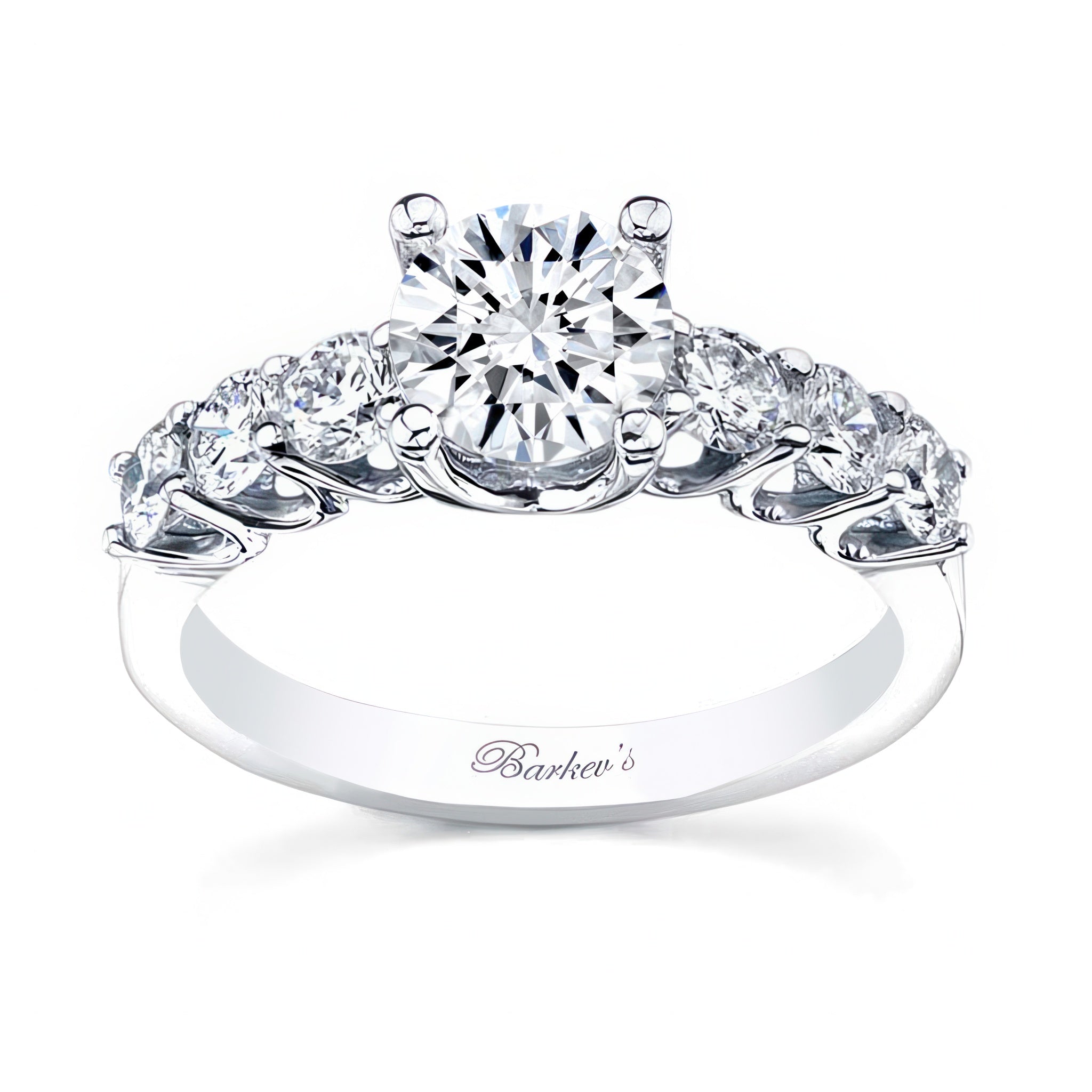 A stunning 7 stone diamond ring featuring a prong set round 1 carat center flanked by 3 smaller shared prong set diamonds on each side for a unique glorious look.