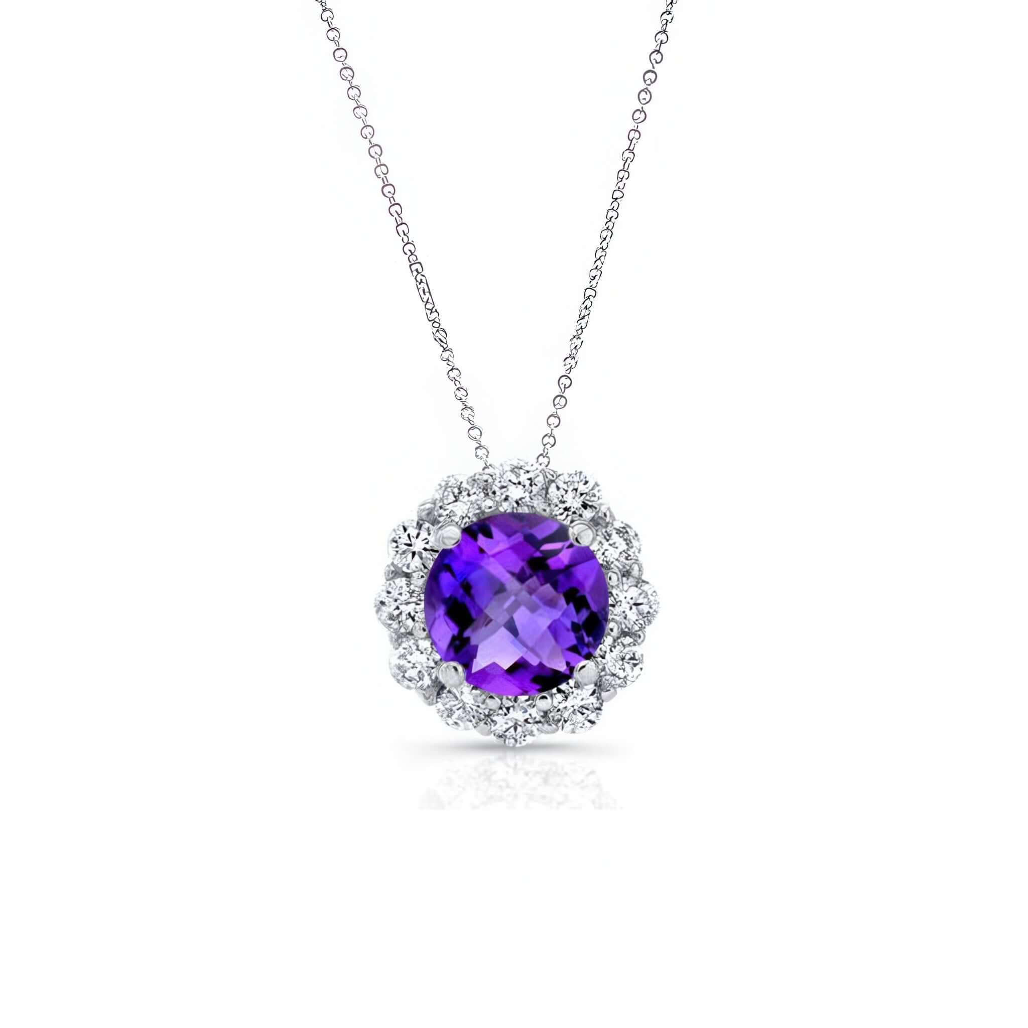 A stunning amethyst and diamond halo necklace featuring a prong set half carat round amethyst center adorned with a halo of shared prong set diamonds for a touch of sophistication.