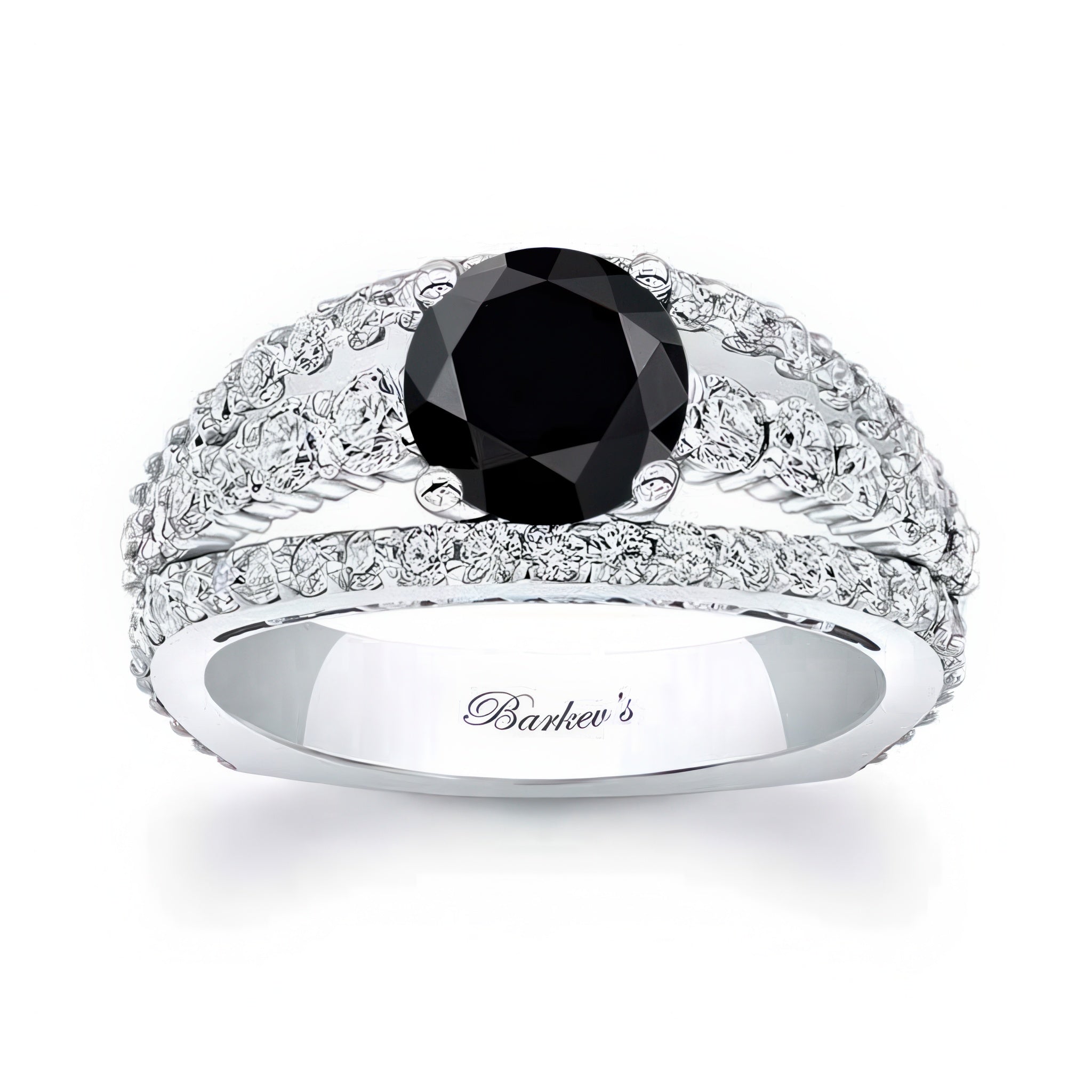 This beautiful art deco black and white diamond ring features a prong set round center with a split shank sporting shared prong set diamonds and an intricate flower and vine design visible on the side view.