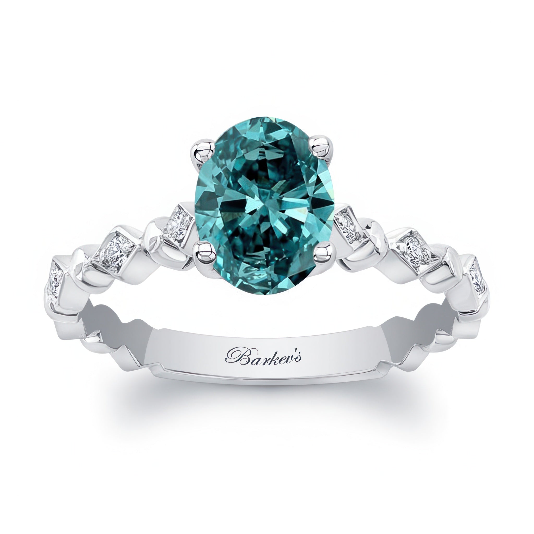 This art deco oval blue and white diamond engagement ring combines simplicity and uniqueness in a dainty design. The center stone sits beautifully on the playful diamond pave setting adorning the band.