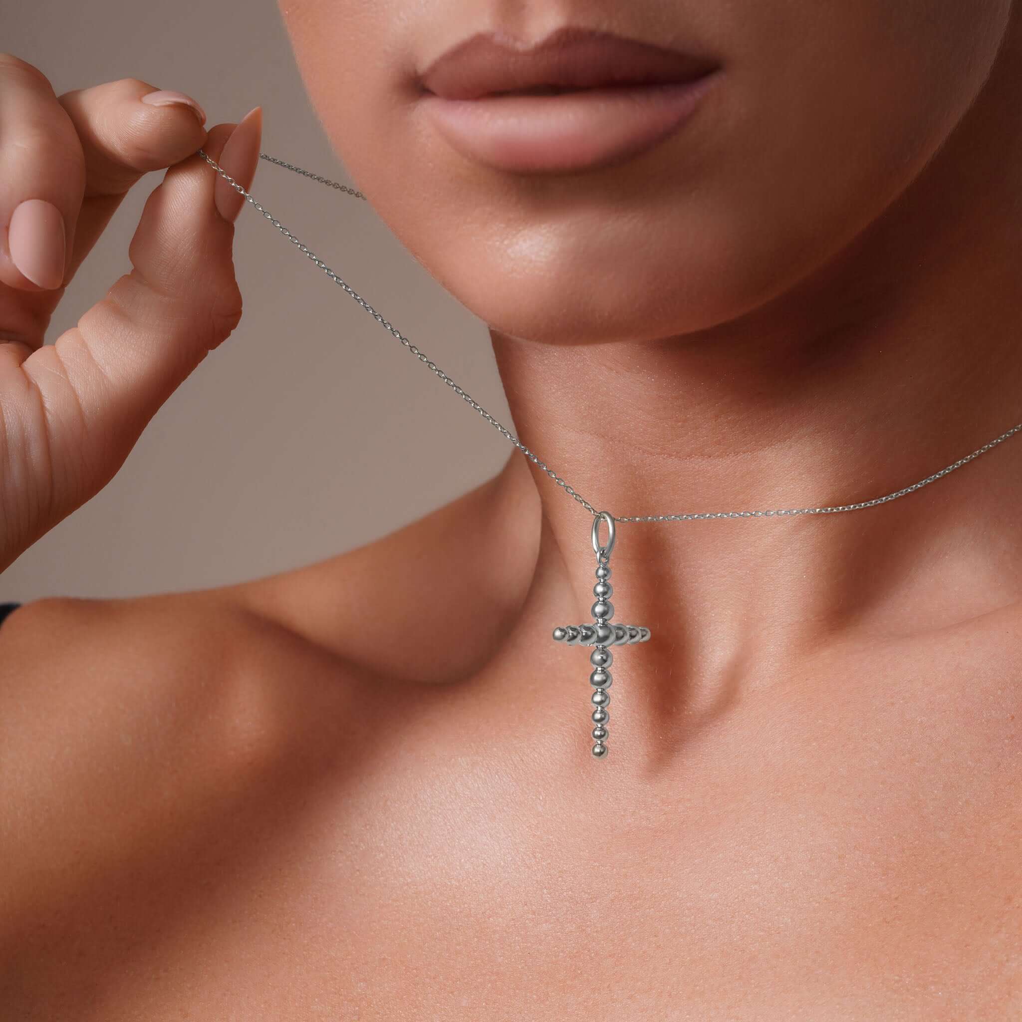 Our Beaded Cross Necklace, features a cross formed entirely from polished bead-shaped links, creating a delicate texture that catches the light beautifully. This necklace is crafted from 14k solid yellow or white gold.