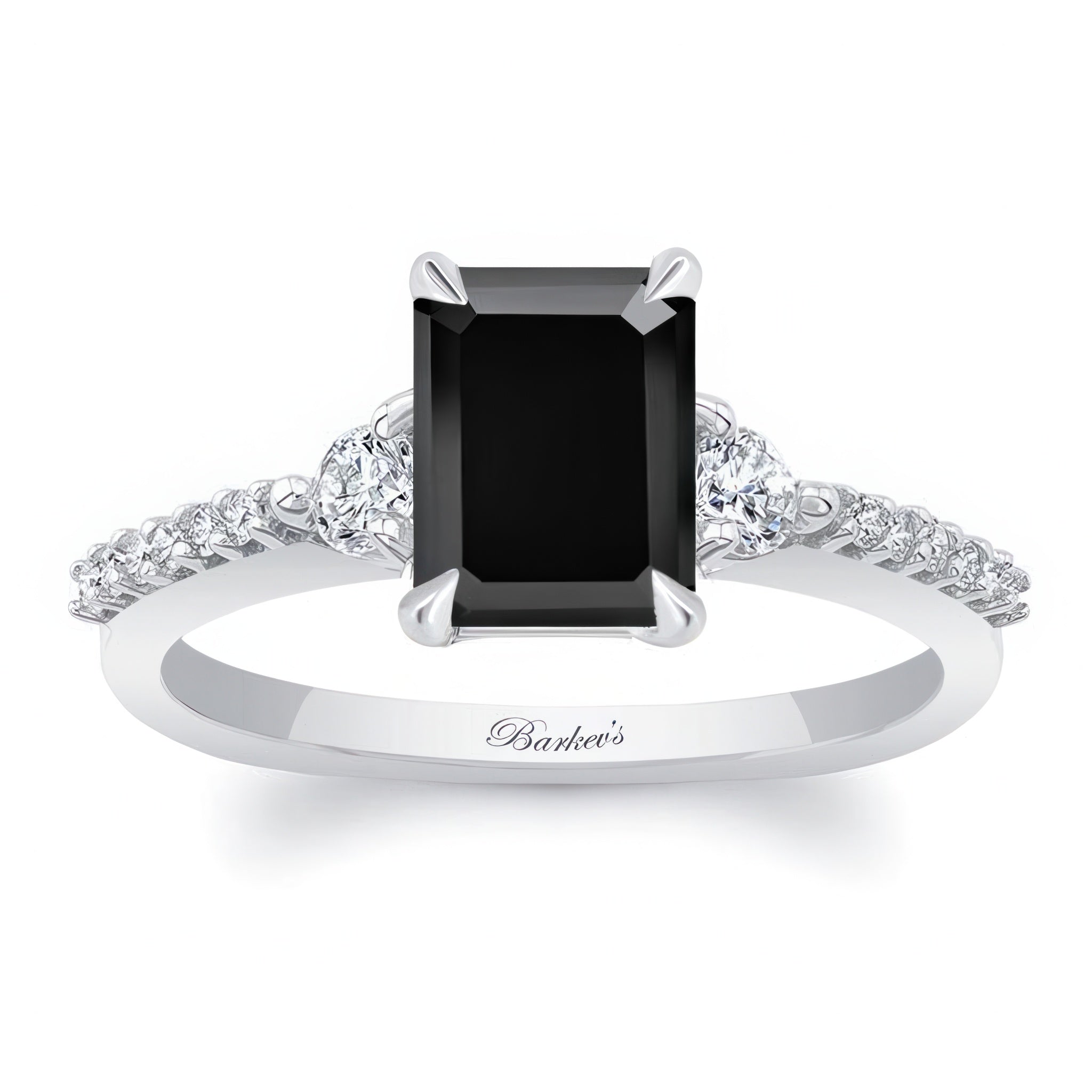 This black and white diamond 3 stone emerald cut engagement ring features a prong-set diamond center flanked by diamond accents on each side. The dainty shoulders are embellished with shared prong set diamonds for a finishing touch of sophistication.