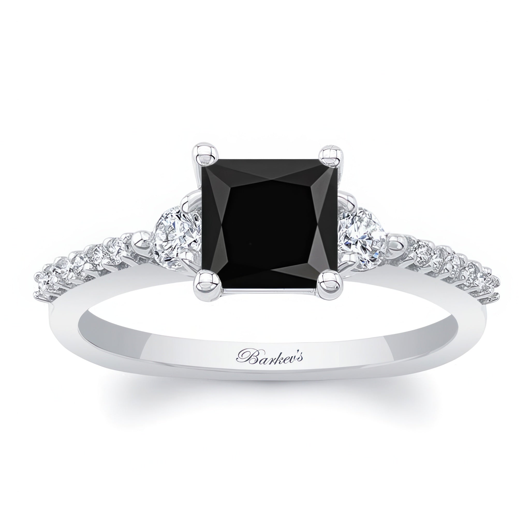 This black and white diamond 3 stone princess cut engagement ring features a prong-set diamond center flanked by diamond accents on each side. The dainty shoulders are embellished with shared prong set diamonds for a finishing touch of sophistication.
