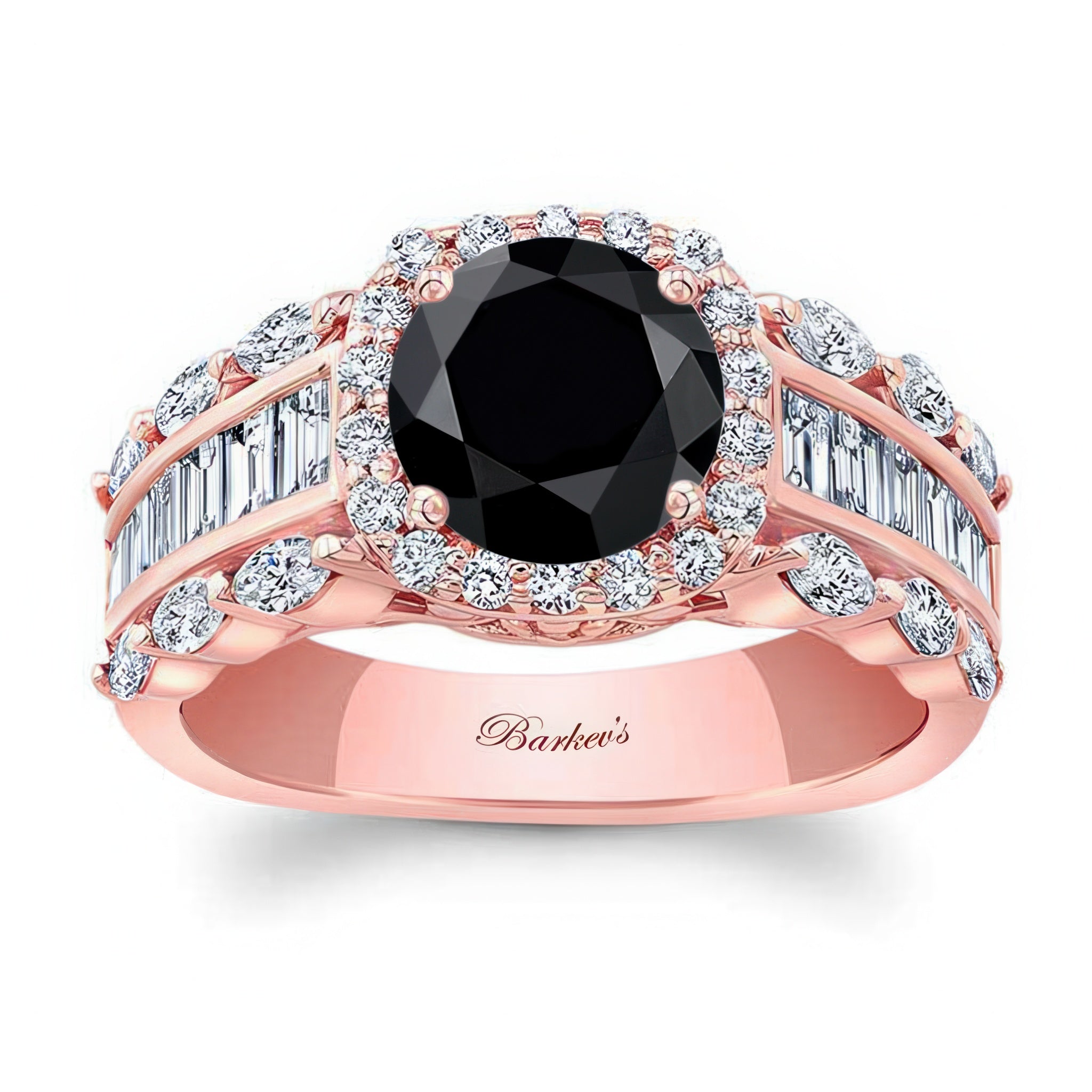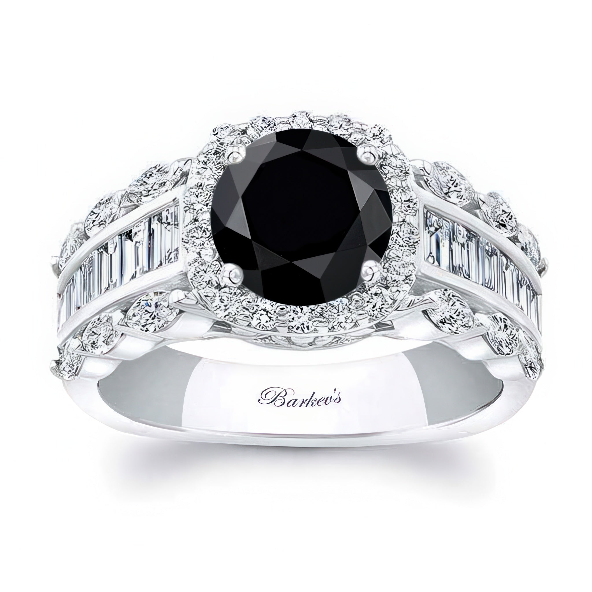 This black and white diamond baguette ring is both striking and classic featuring a prong set round center with a halo surrounding it and channel set baguettes embedded into the shoulders while shared prong set marquise diamonds frame the sides for a sophisticated look.