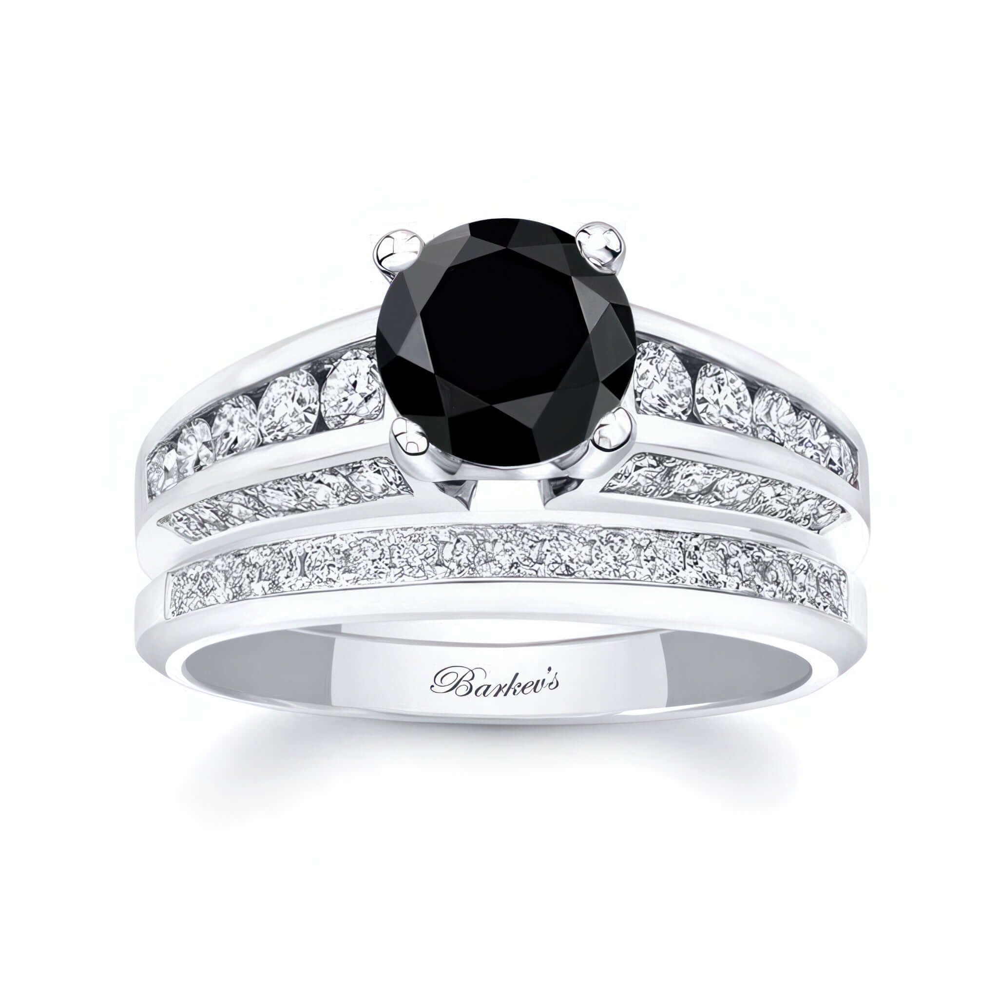 This magnificent black and white diamond channel set wedding ring set boasts with sparkle from every angle featuring beveled edges and a round center that is met by a row of channel and pave diamonds adorning not only the top, but also each side of the shank. Adding to this brilliance, the diamond wedding band fits snuggly close to the engagement ring for an unparalleled look.