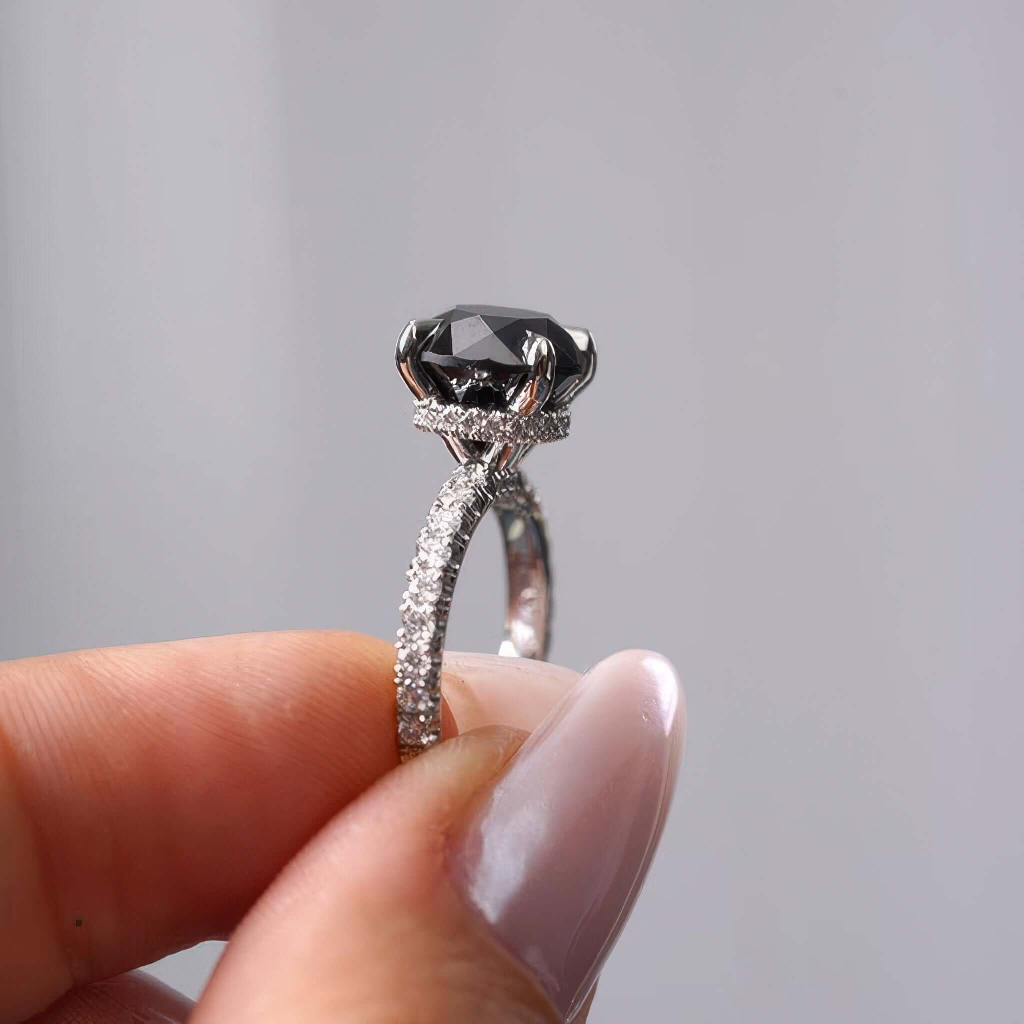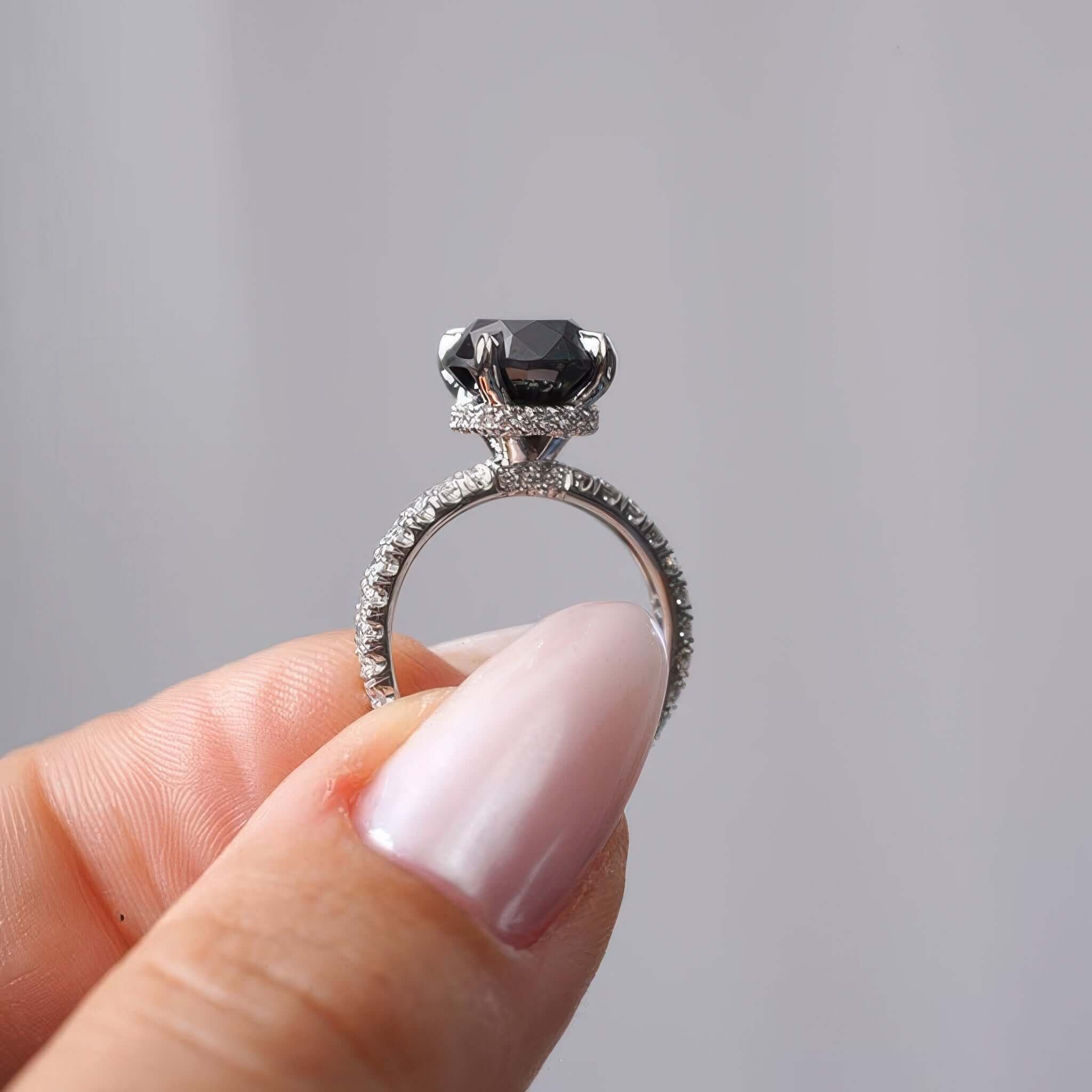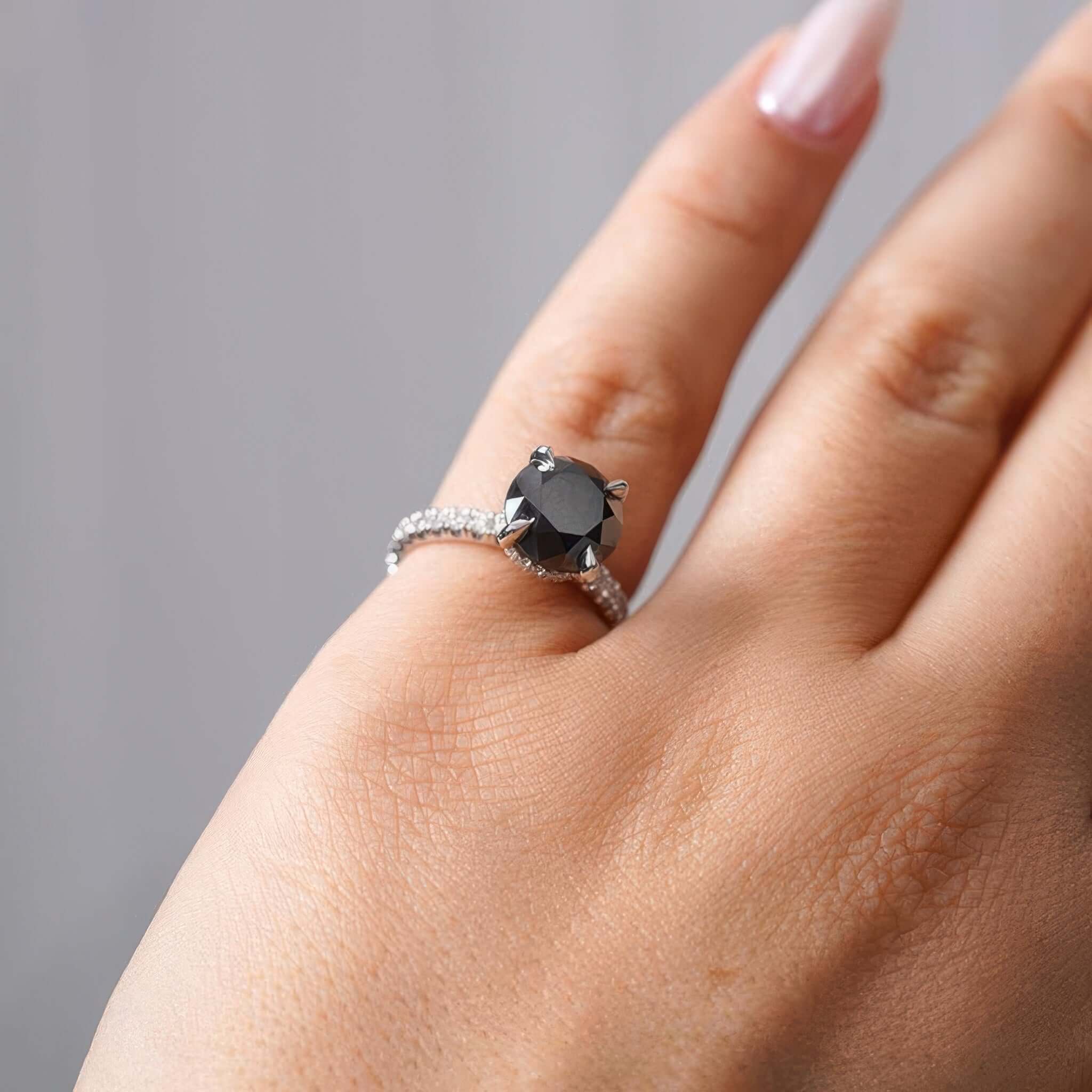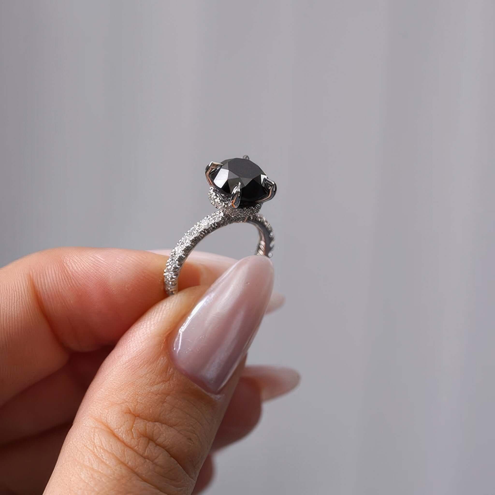 A brilliant black and white diamond halo engagement ring featuring a prong set round center with a french cut pave diamond halo underneath it and more diamonds cascading down the shank.