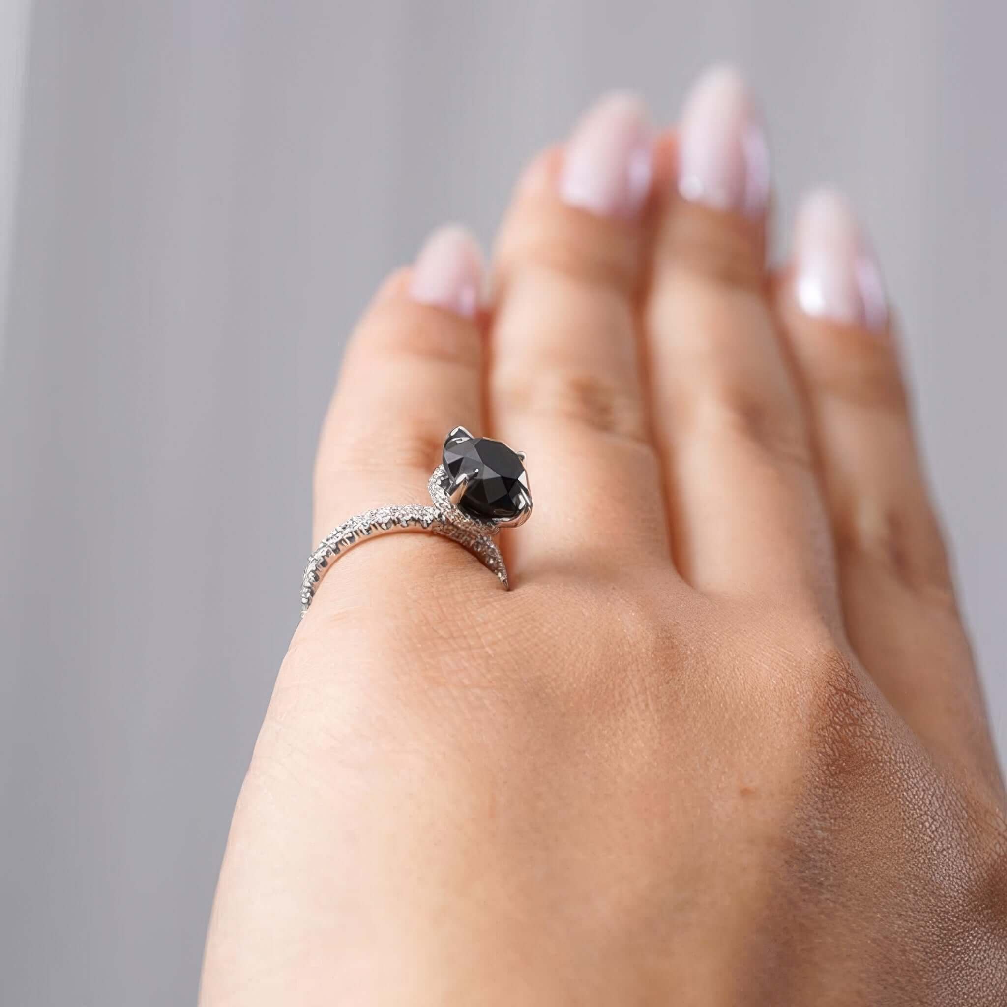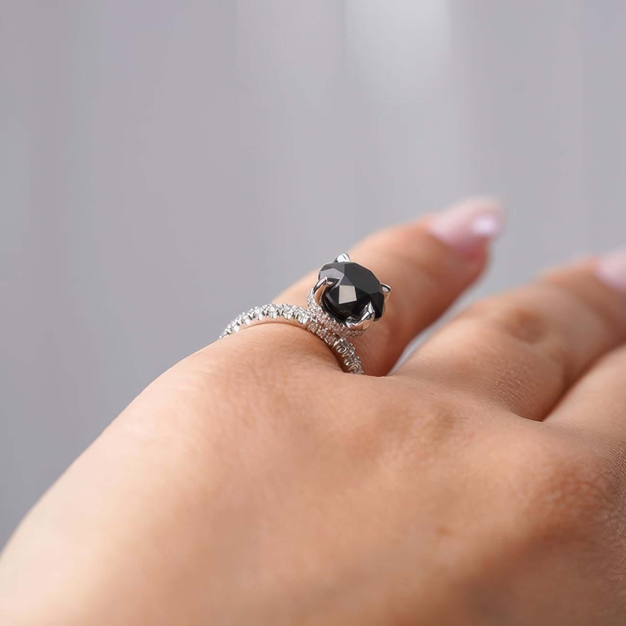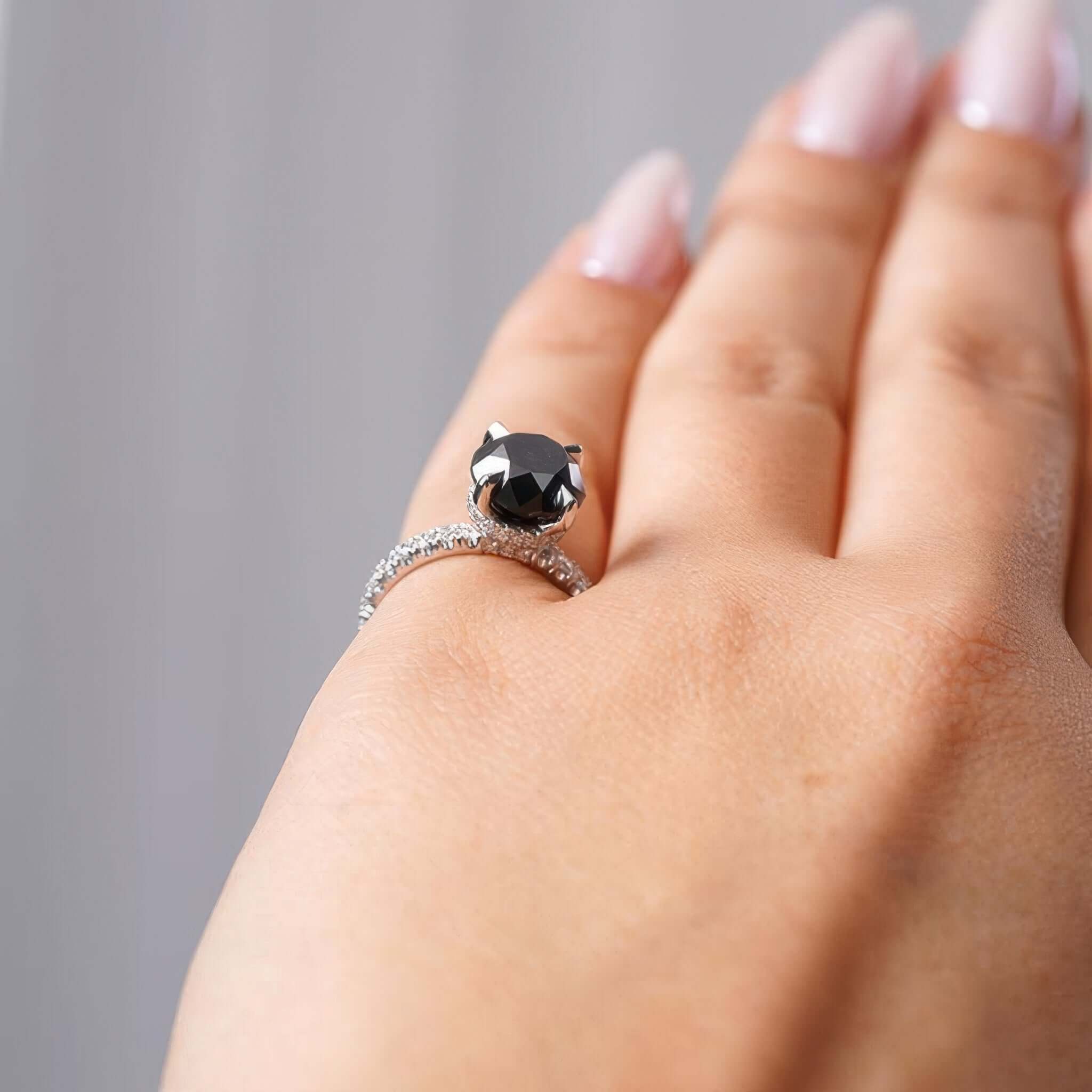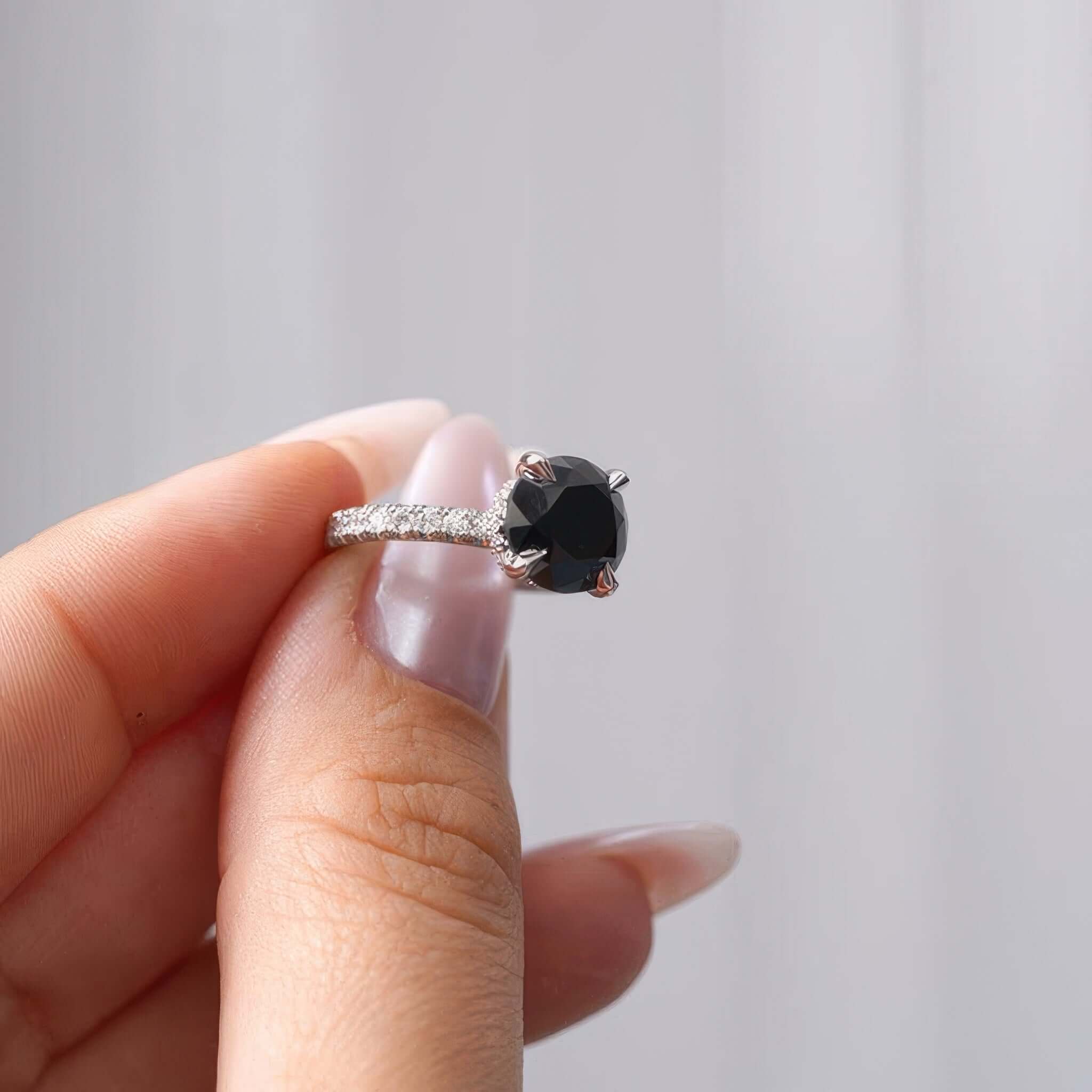 A brilliant black and white diamond halo engagement ring featuring a prong set round center with a french cut pave diamond halo underneath it and more diamonds cascading down the shank.