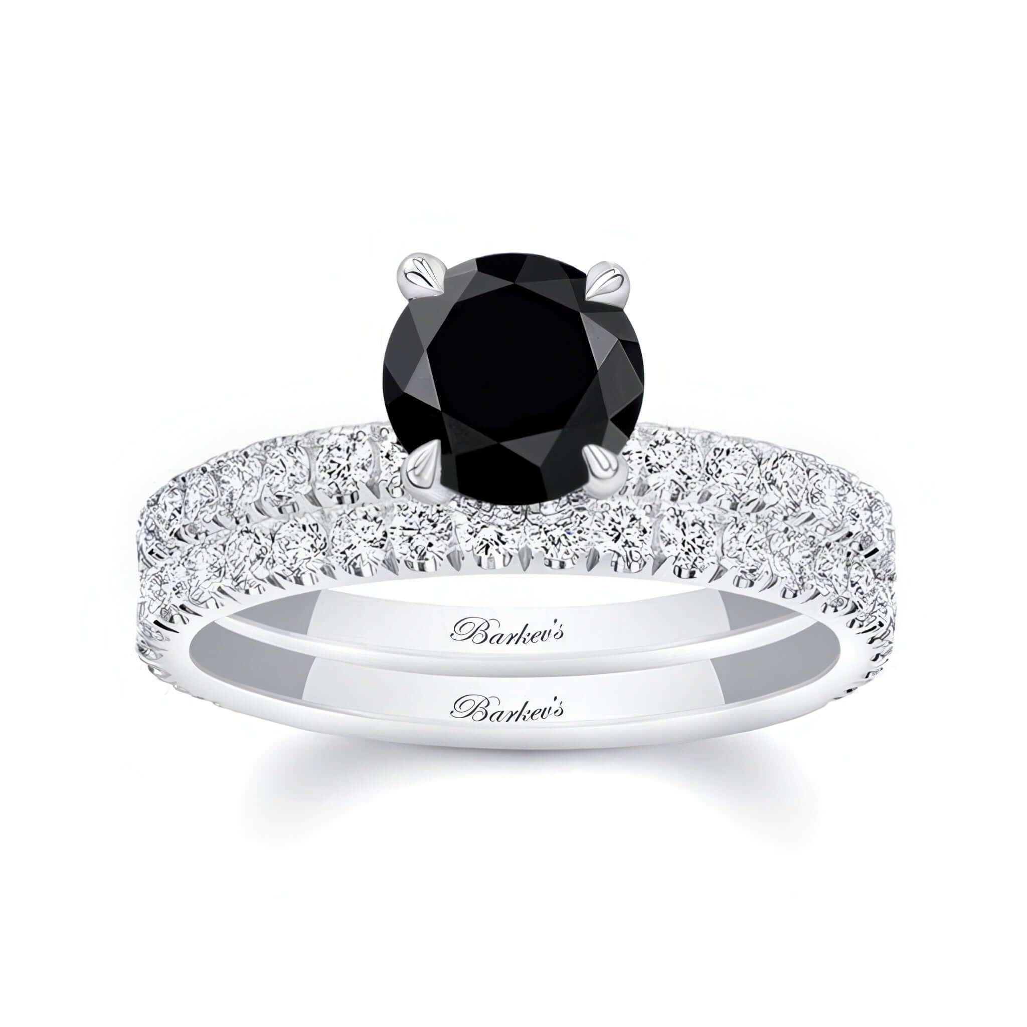 A brilliant black and white diamond halo wedding set featuring a prong set round center with a french cut pave diamond halo underneath it and more diamonds cascading down the shank. Comes with a matching diamond wedding band.