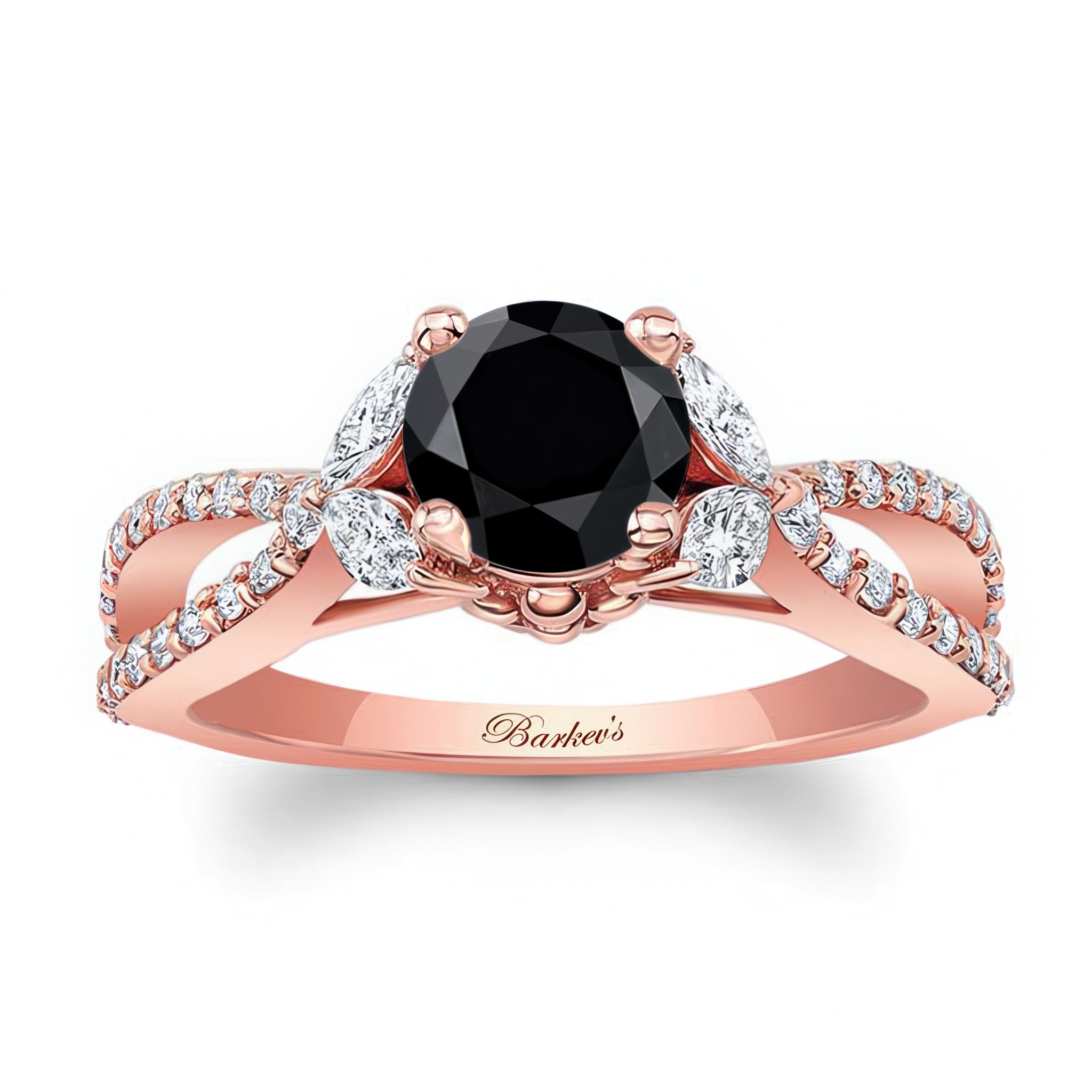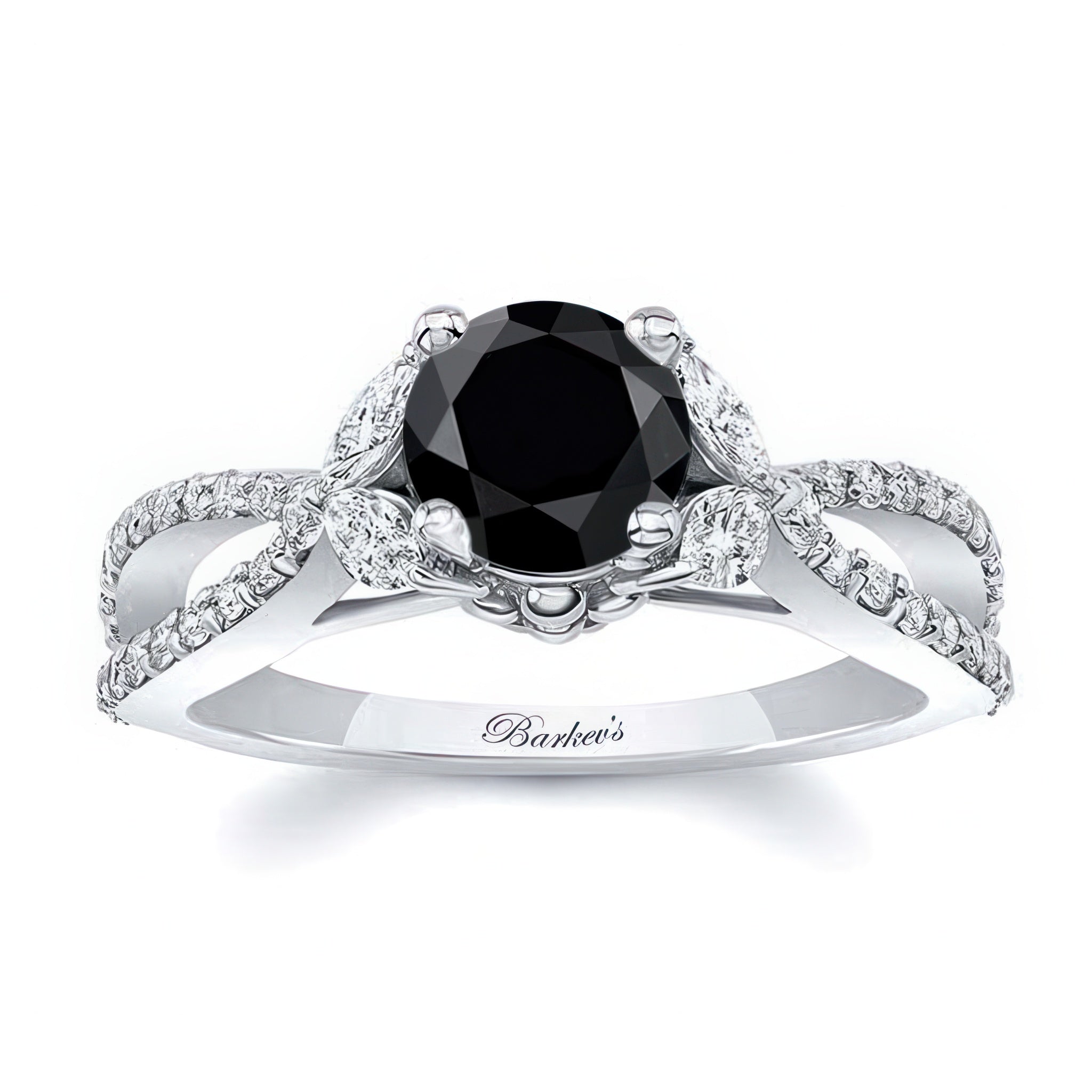 A stunning black and white diamond leaf ring featuring shared prong set round and marquise diamonds forming a beautiful leaf design that frames the prong set round center. The open split shank is also adorned with brilliant shared prong set diamond melees for a stylish look that's absolutely timeless.