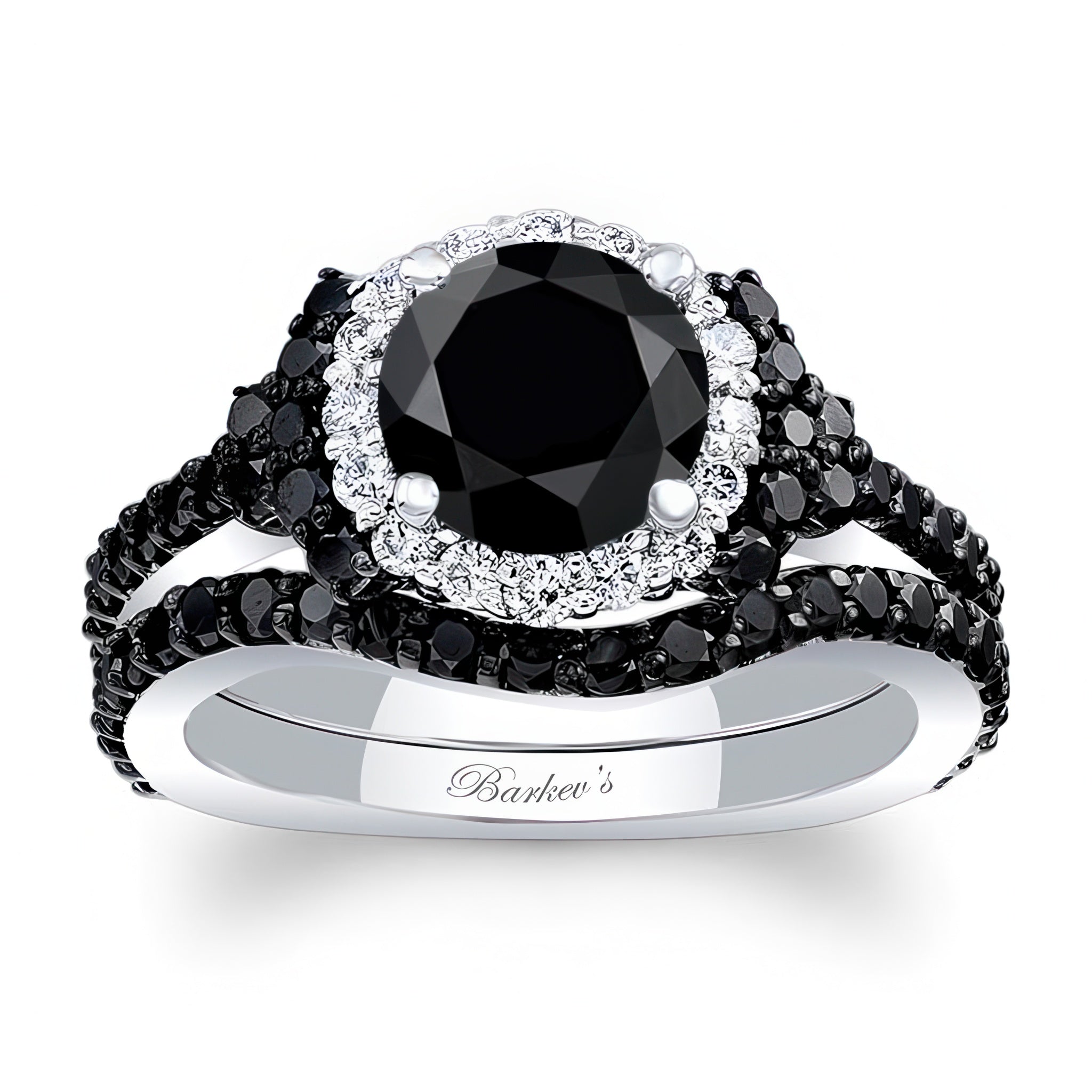 This black diamond cluster wedding ring set features a prong set round center with a diamond halo and shared prong set black diamonds flowing down the shank. Comes with a matching wedding band.