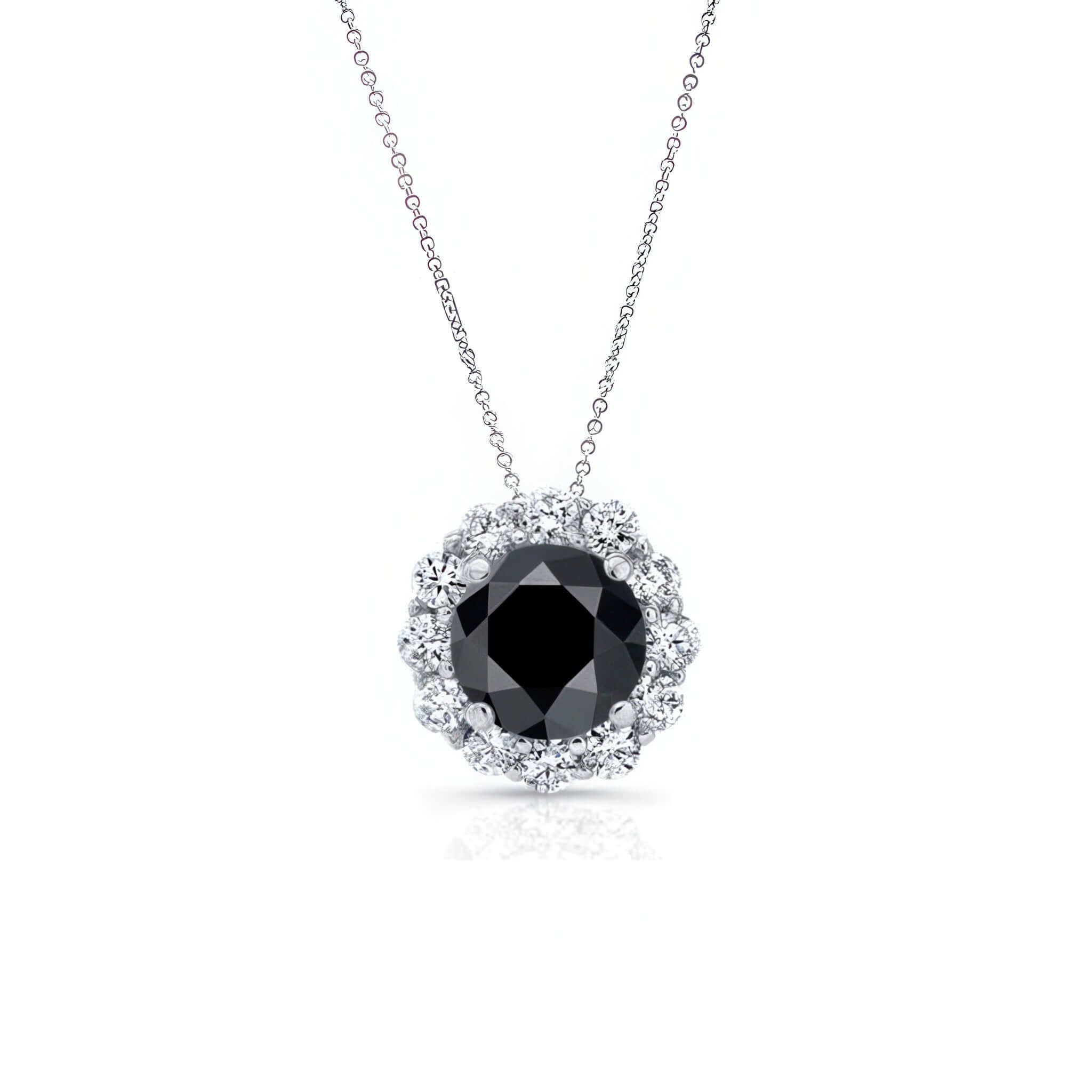 A stunning black diamond halo necklace featuring a prong set round black diamond center adorned with a halo of shared prong set diamonds for a touch of sophistication.