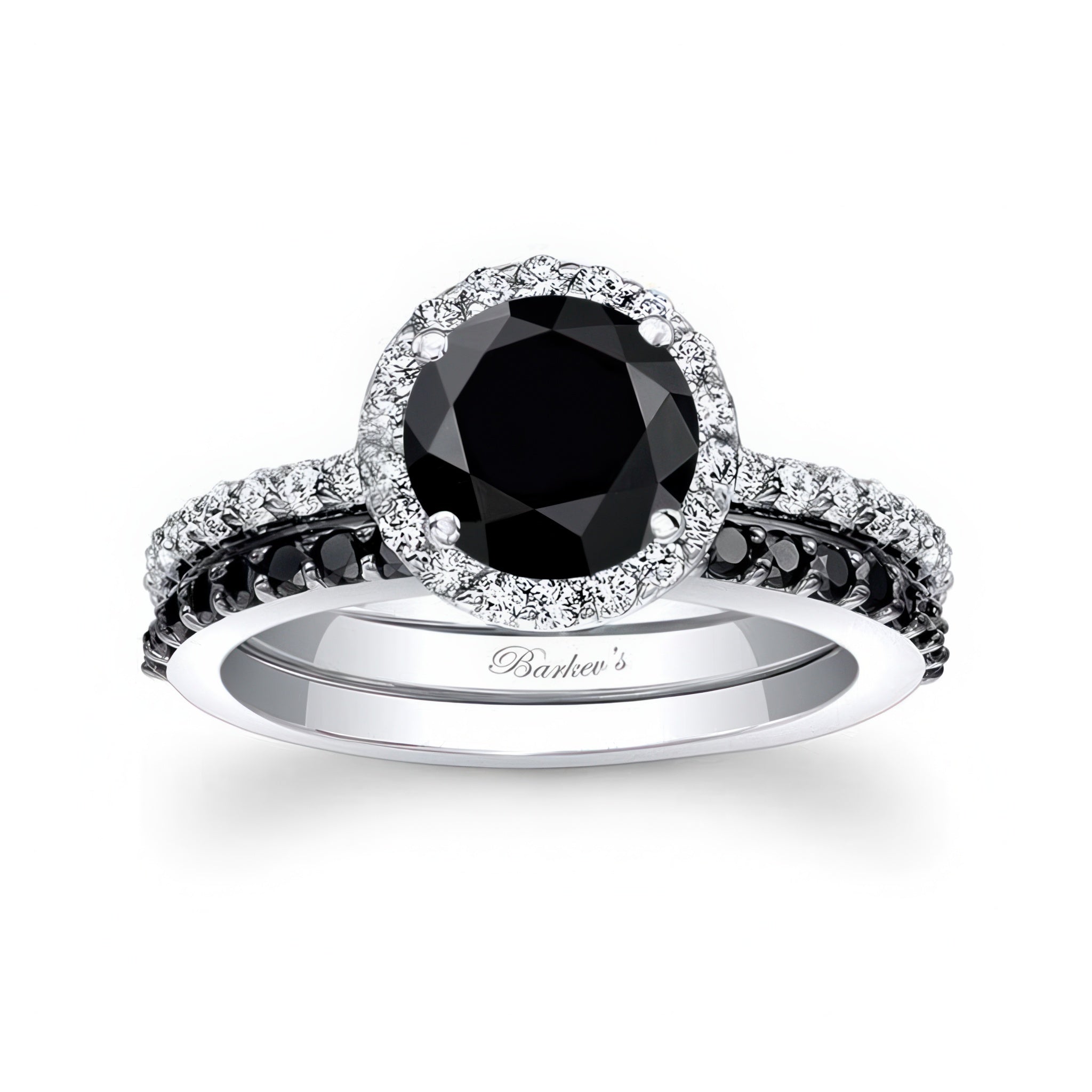 This black diamond halo wedding ring set features a round center with a halo encircling it and diamonds cascading down the dainty shank for a look of sheer elegance. Comes with a matching black diamond wedding band.