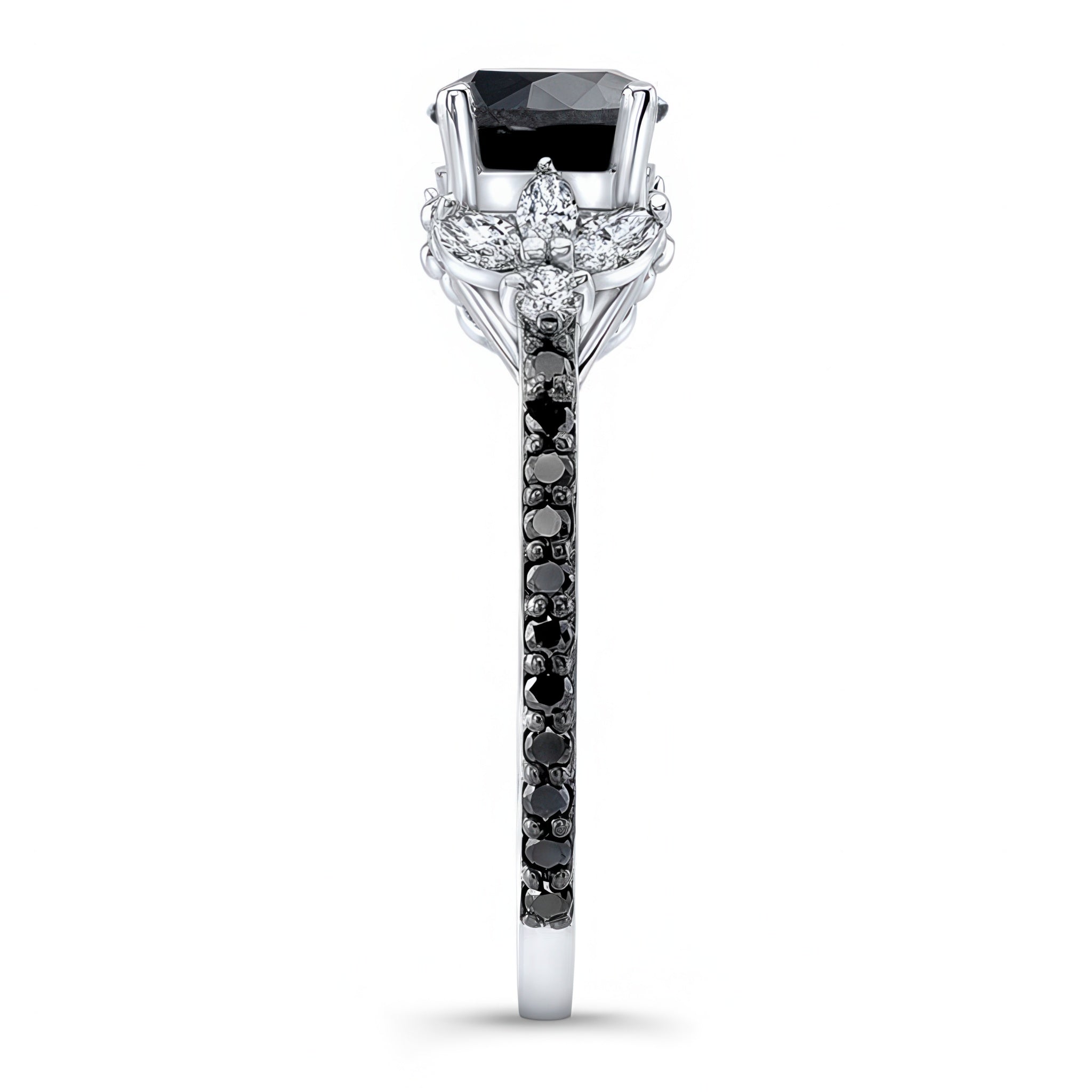 A beautiful black diamond leaf engagement ring featuring a prong set center that's flanked on each side by a round diamond acting as a base while a spray of marquise cut diamonds radiate outwards forming an elegant leaf shape. The final touch is a sprinkle of black diamond melees on the shank for a sparkling look.