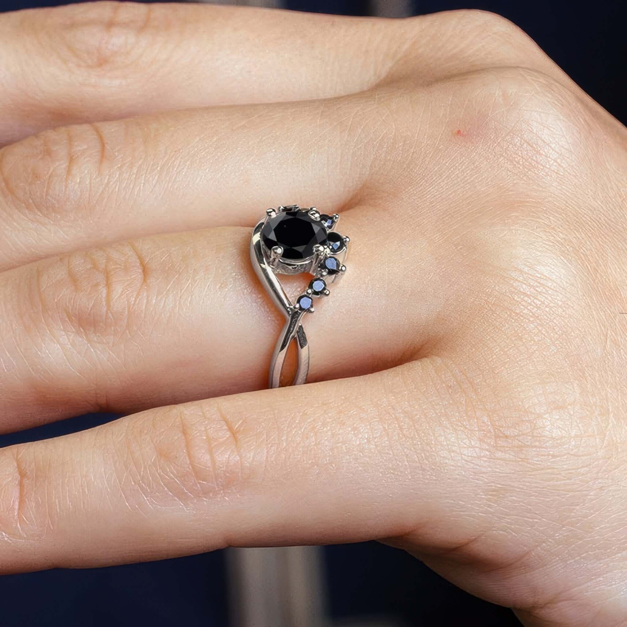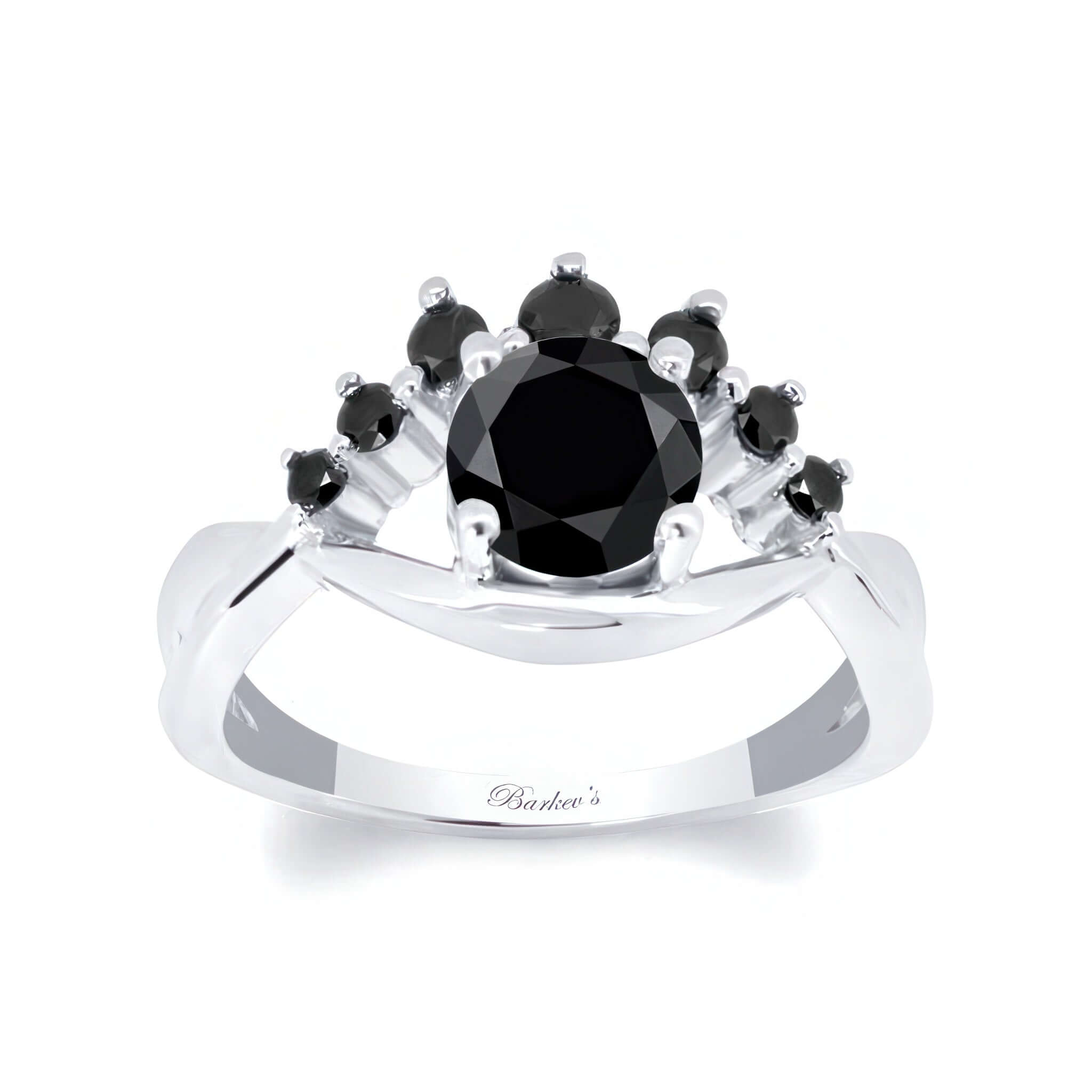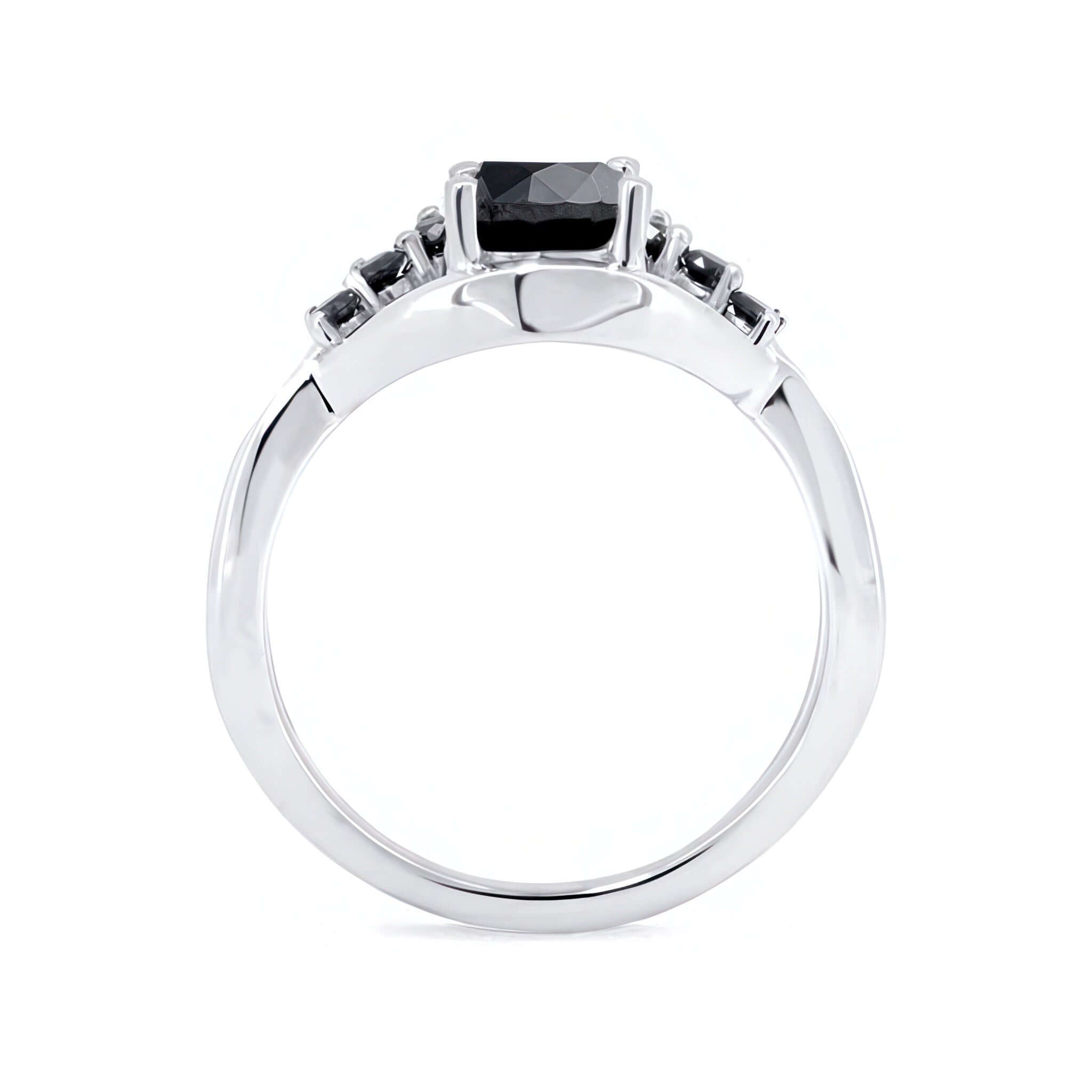 This black diamond unique engagement ring grabs attention with a flare swirling on one side adorned with shared prong set black diamonds and a round center stone.