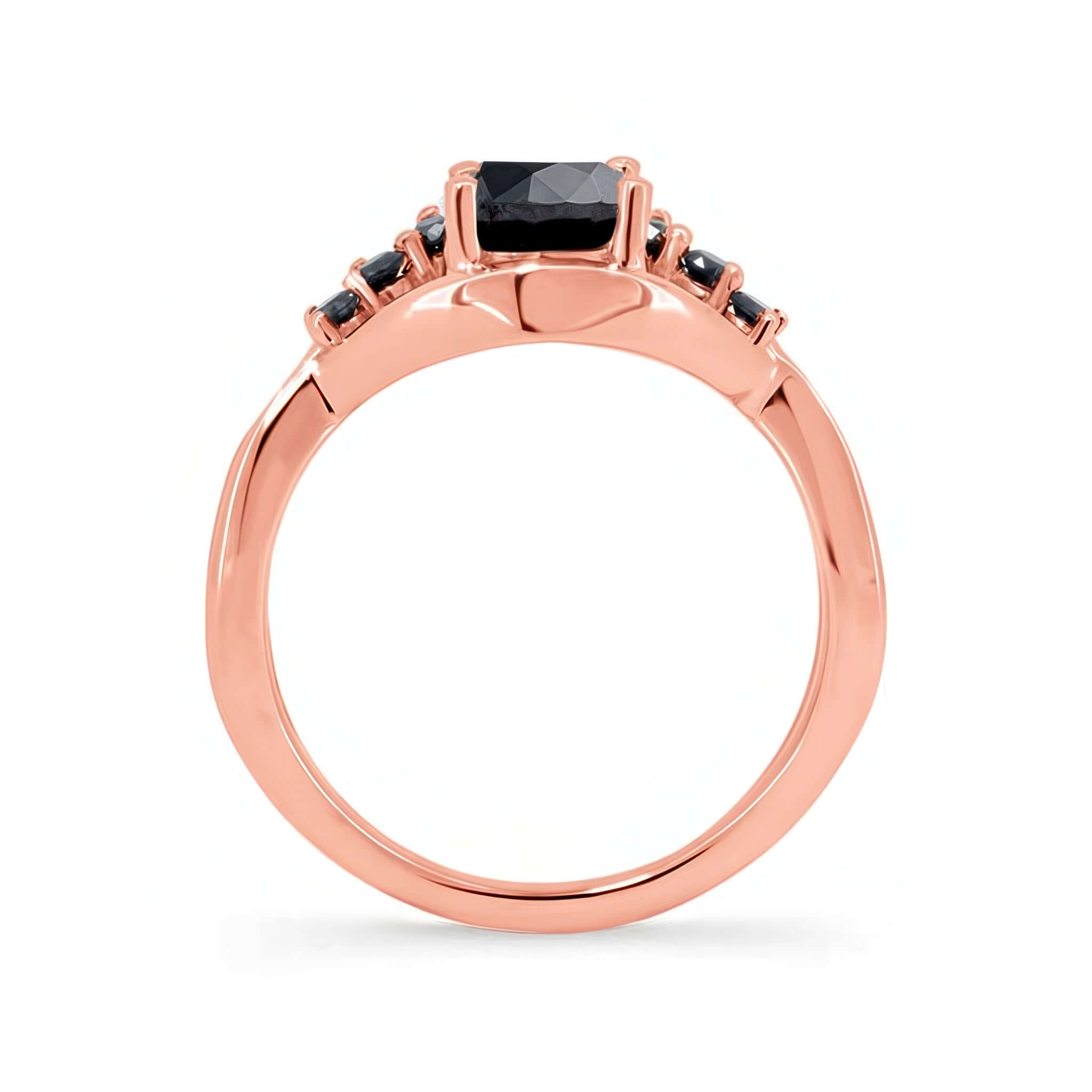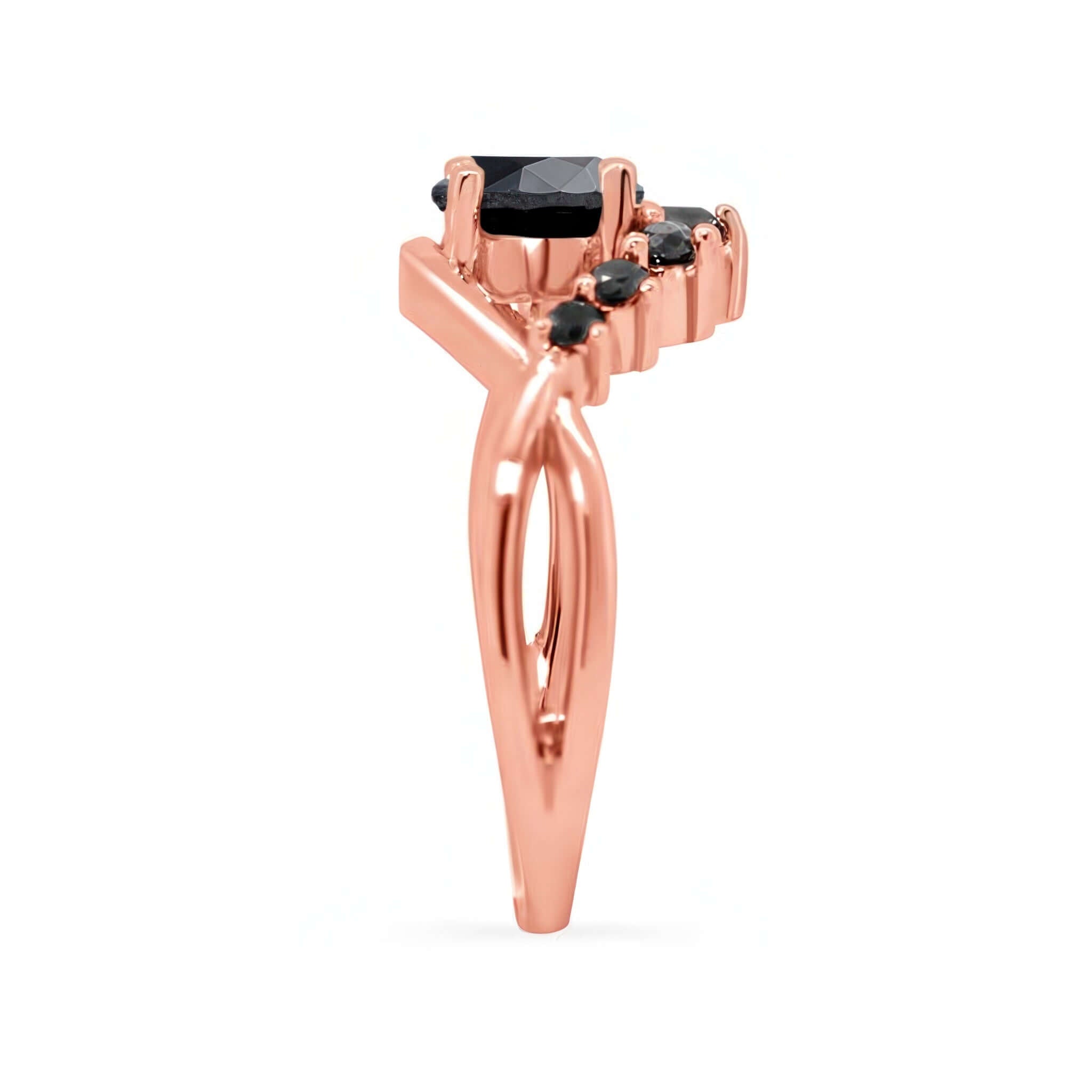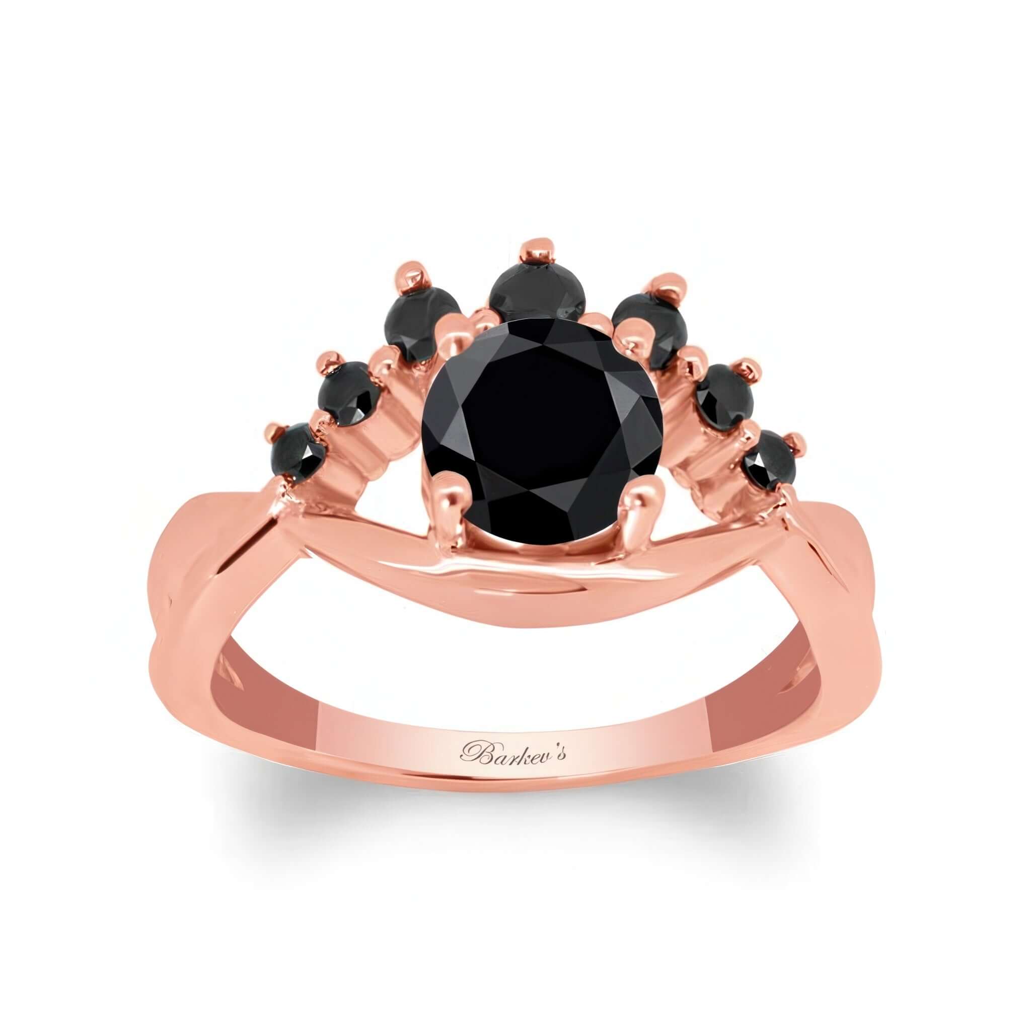 This black diamond unique engagement ring grabs attention with a flare swirling on one side adorned with shared prong set black diamonds and a round center stone.