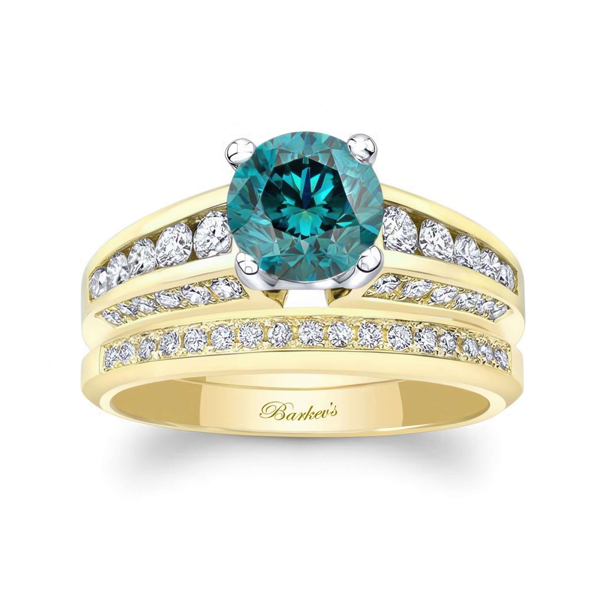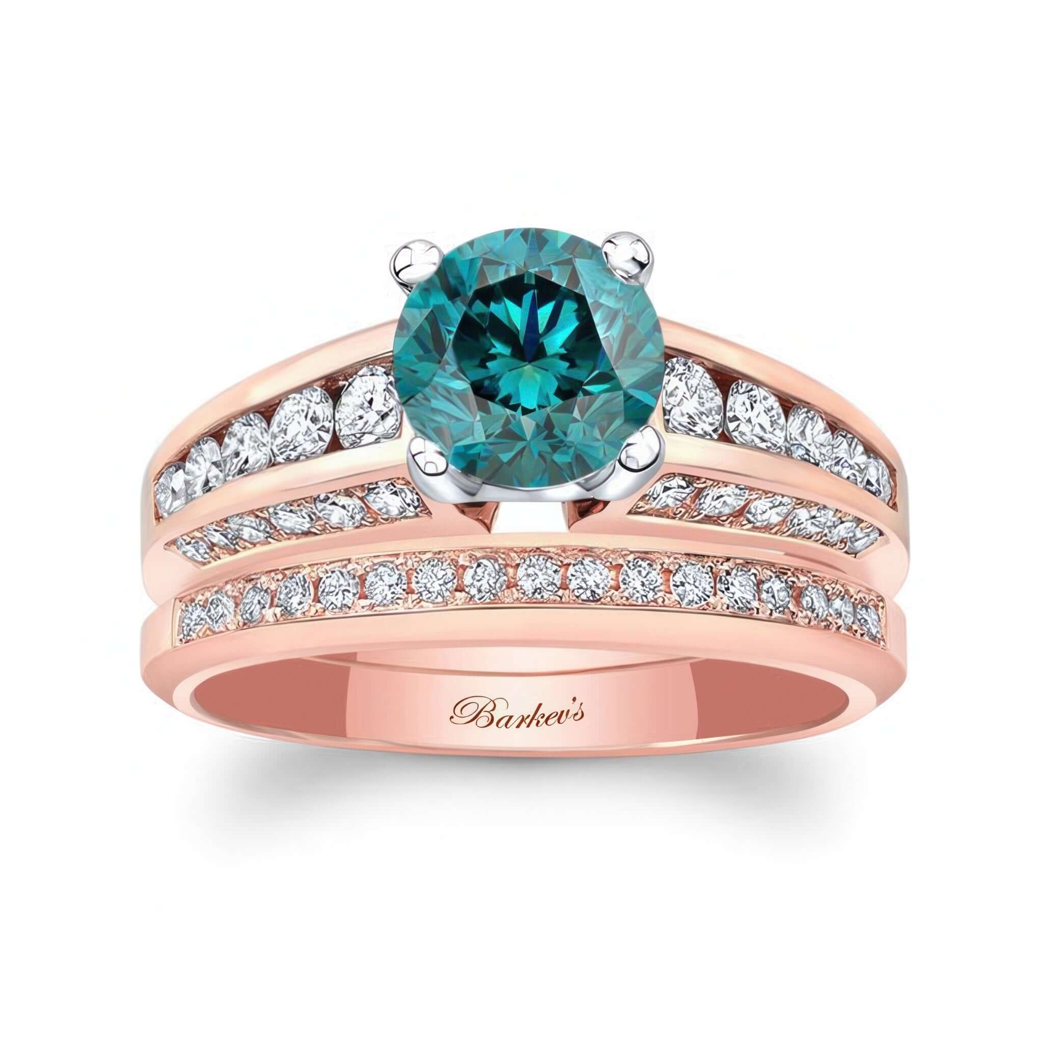 This magnificent blue and white diamond channel set wedding ring set boasts with sparkle from every angle featuring beveled edges and a round center that is met by a row of channel and pave diamonds adorning not only the top, but also each side of the shank. Adding to this brilliance, the diamond wedding band fits snuggly close to the engagement ring for an unparalleled look.
