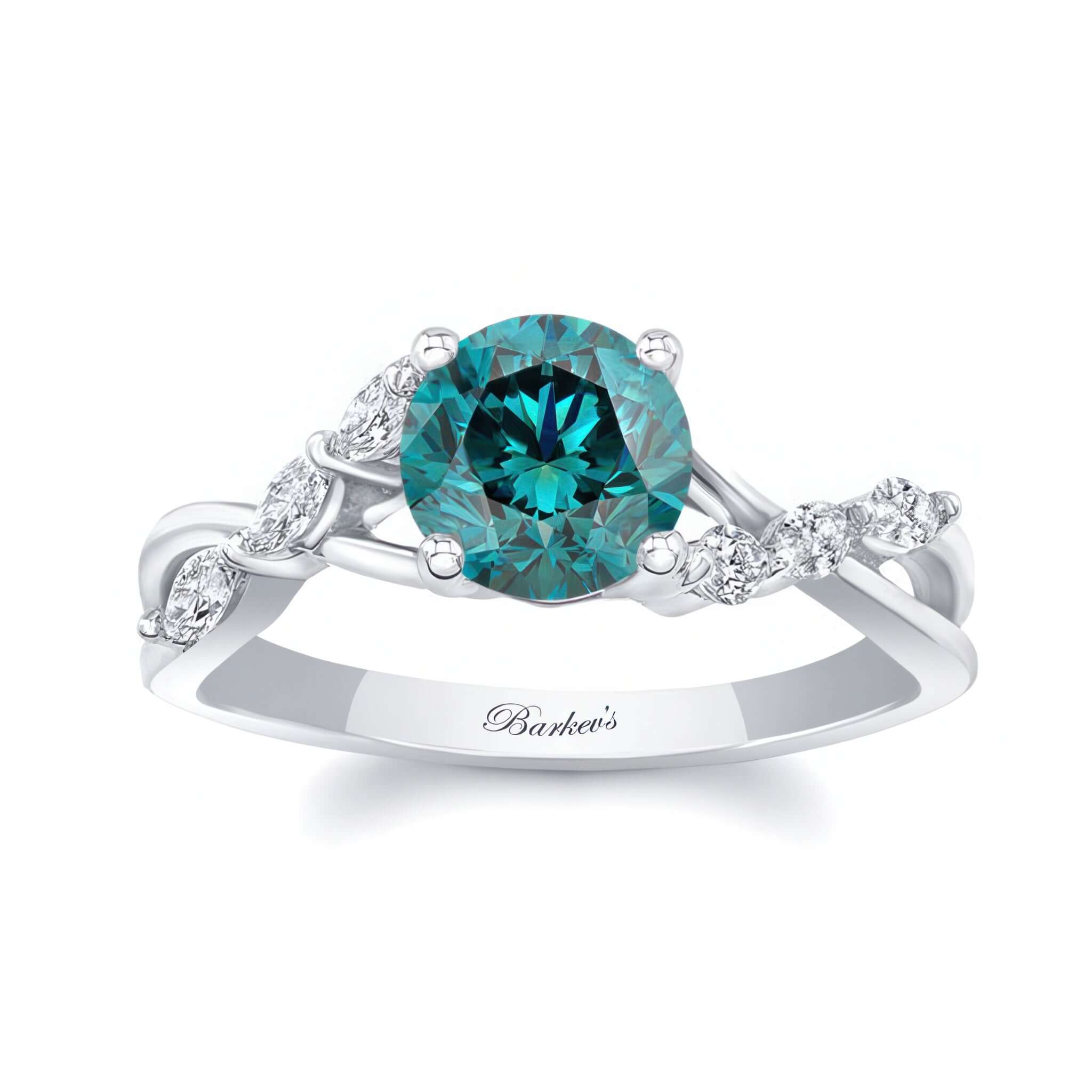 This blue and white diamond marquise accent ring gives off a classic vibe. The design is adorned by a round center snugly embraced by an elegant curve with three diamonds on each side.
