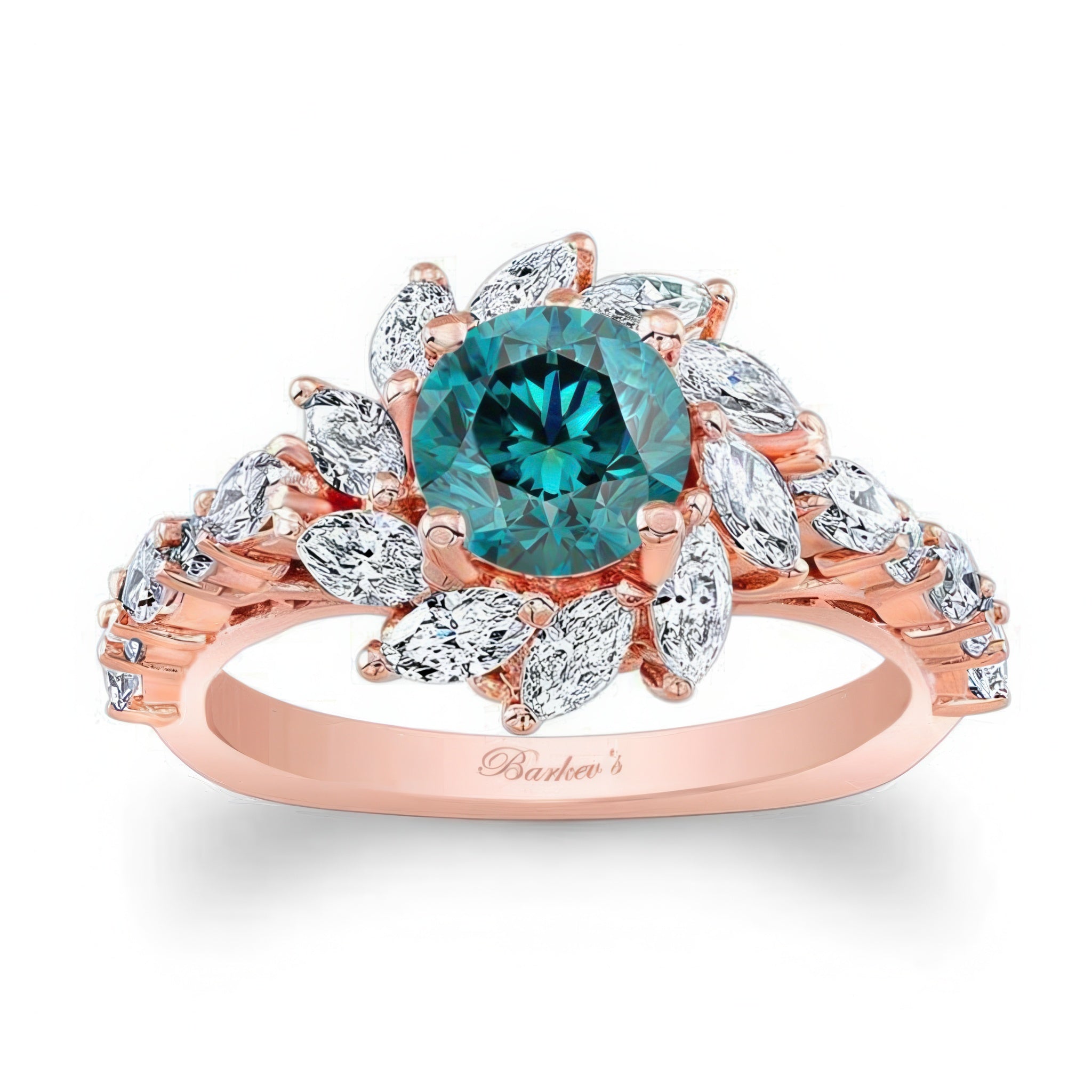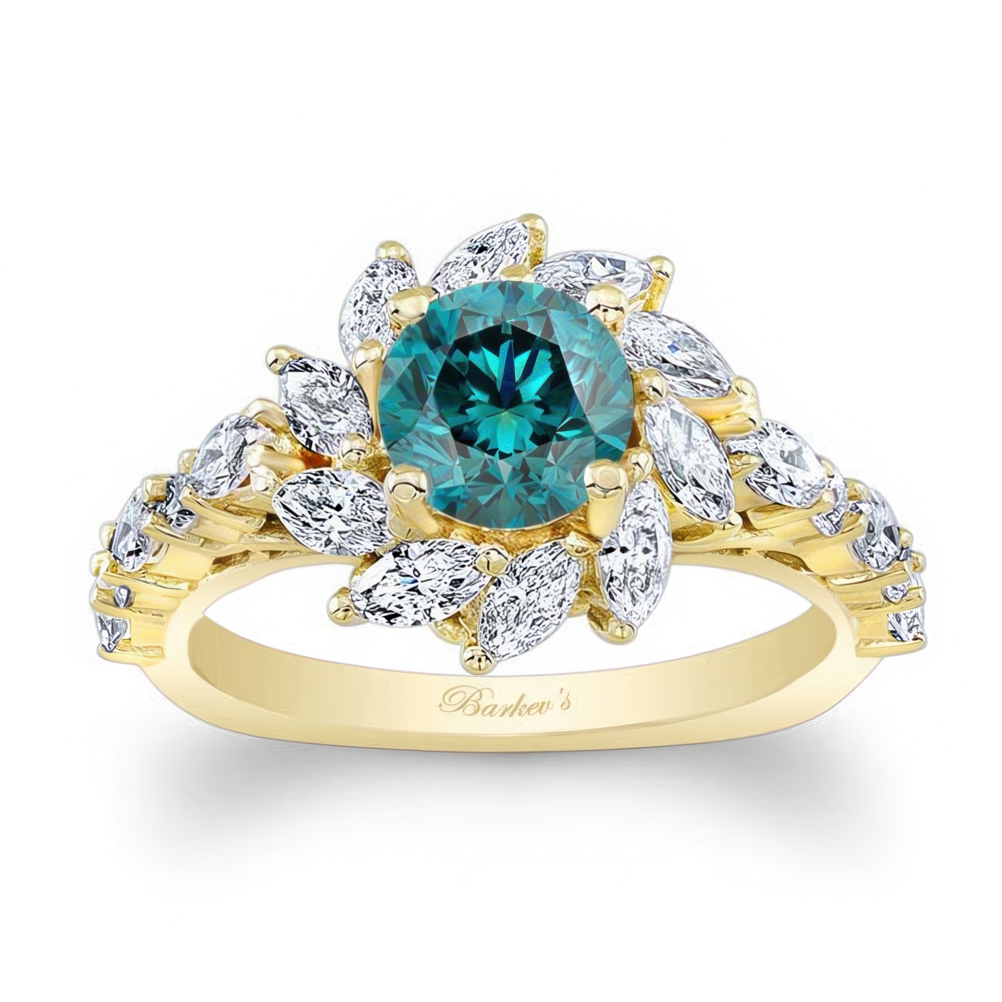 This blue and white diamond sunflower engagement ring features a prong set round center encircled with a halo of flaring fancy cut marquise diamonds. The narrow shank is adorned with alternating round and marquise cut diamonds for an elegant finishing touch sure to be admired by everyone who sees it.