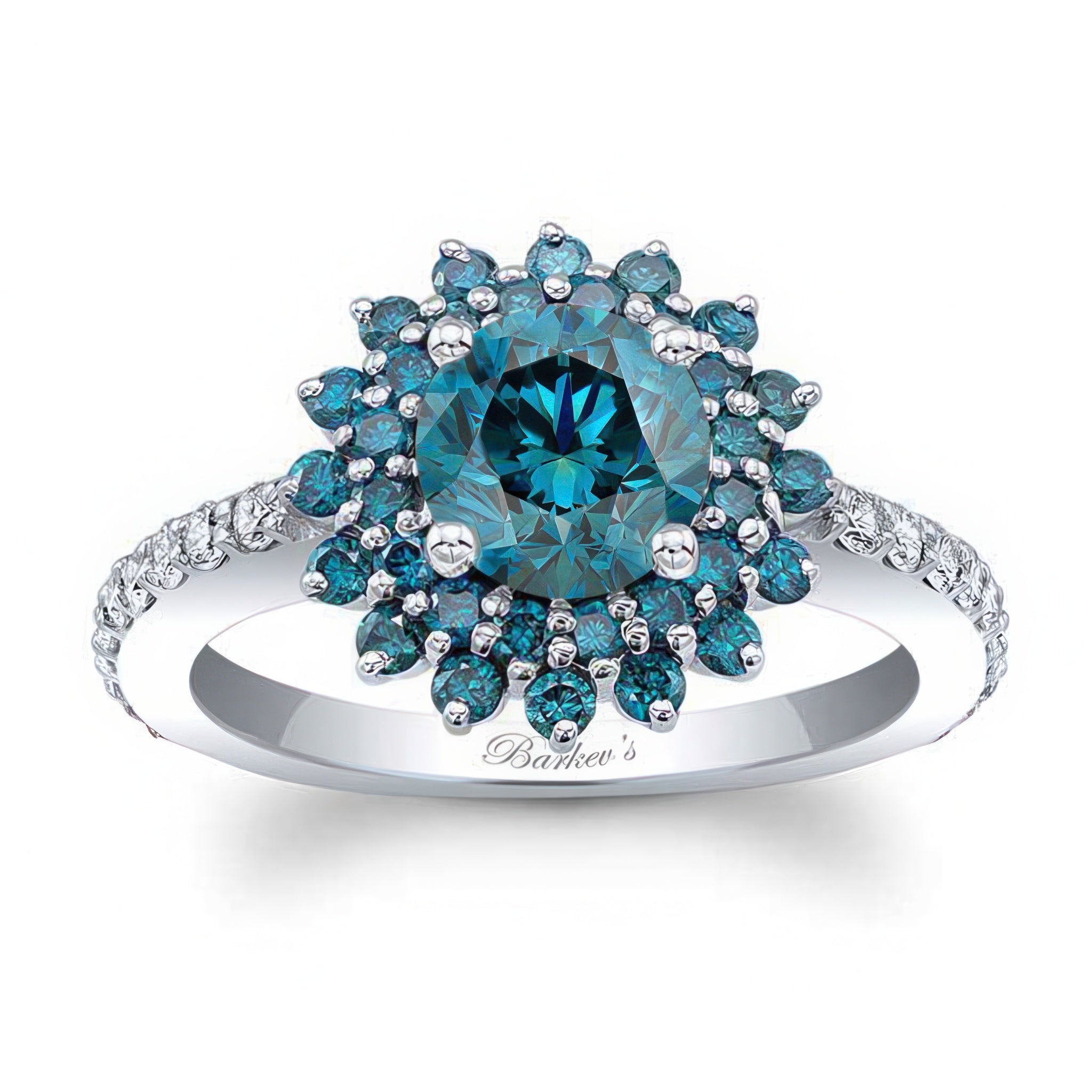 This unique blue diamond sunflower ring features a prong set round center encircled with two rows of halo blue diamond melees. The dainty shank is adorned with shared prong set diamonds running down the shoulders for an elegant finish.