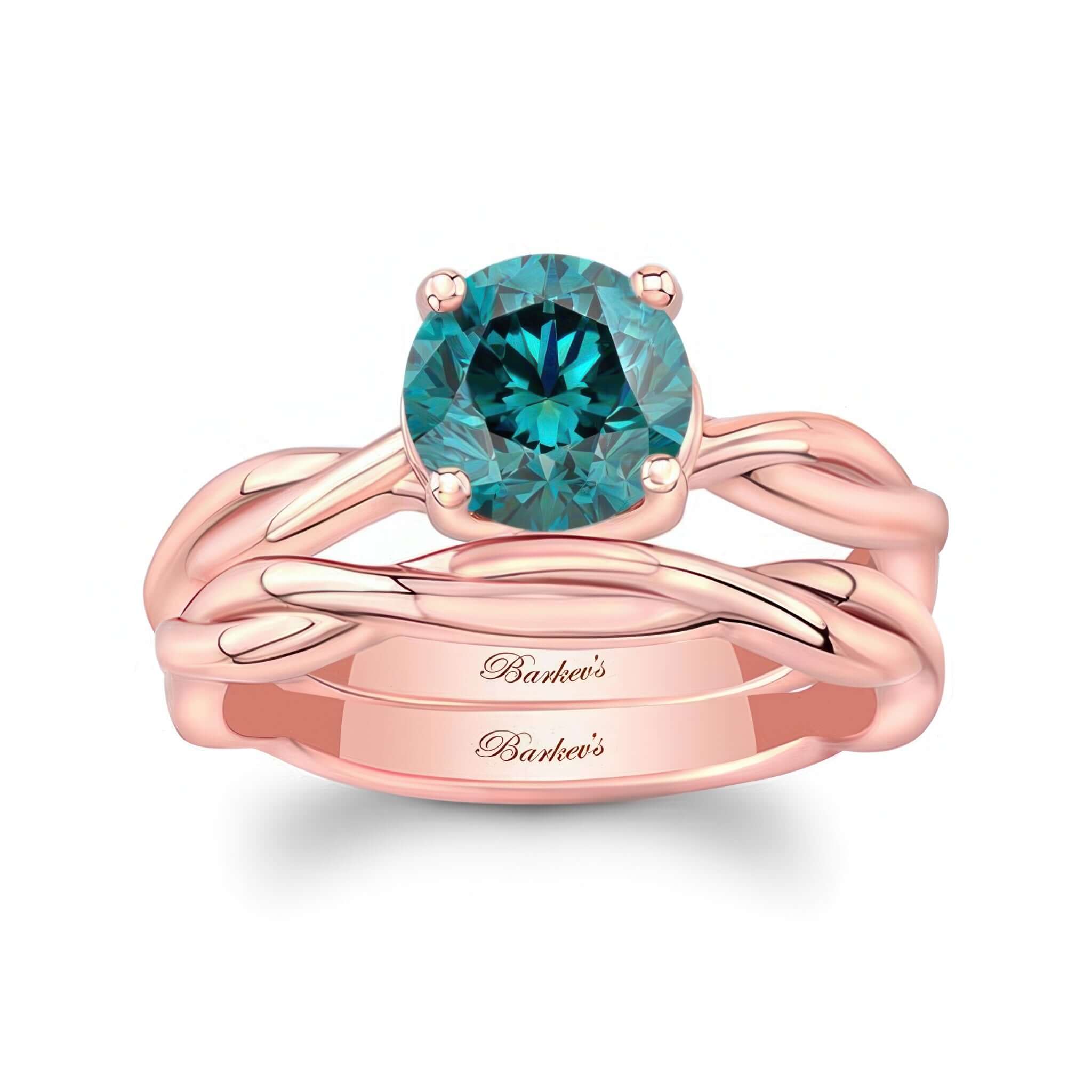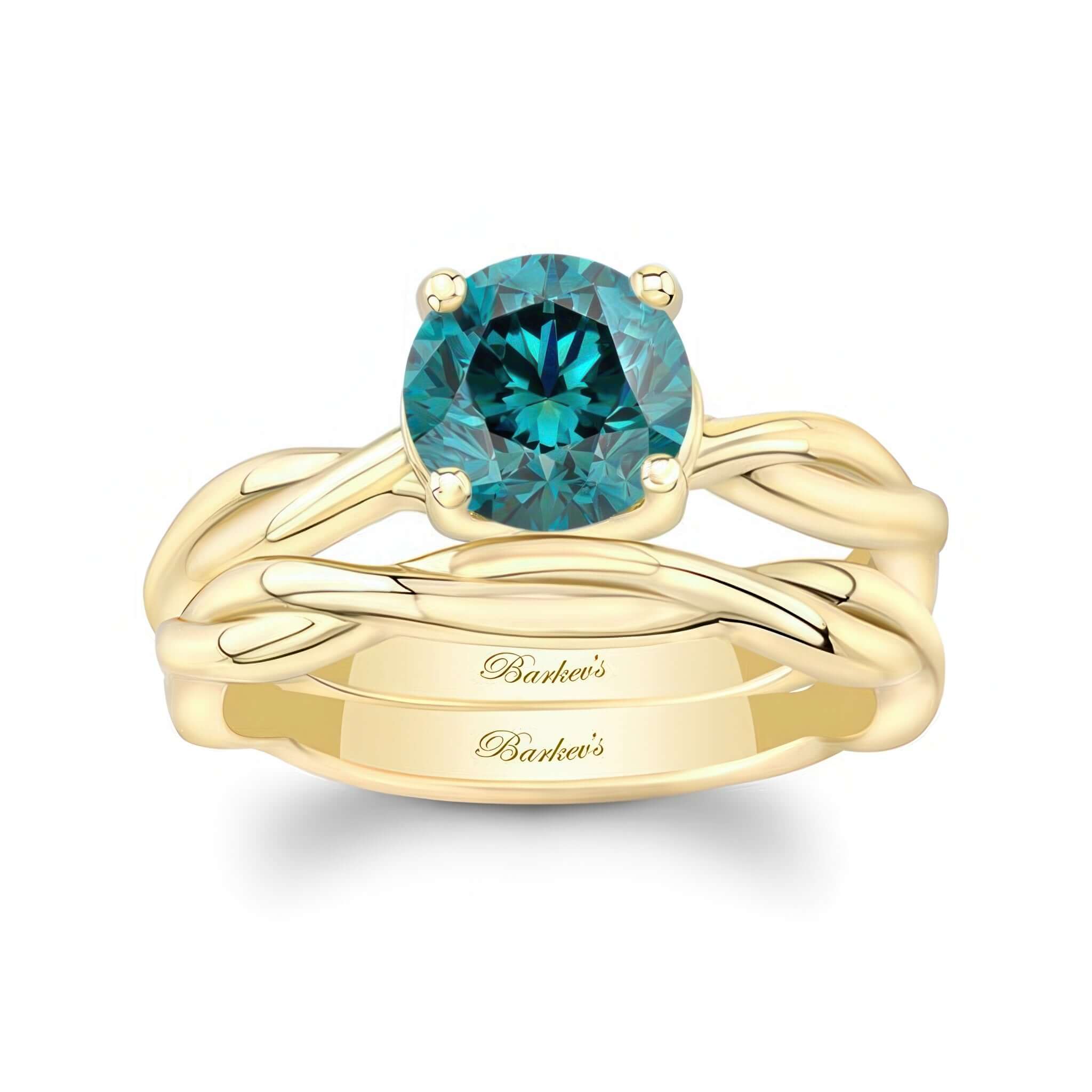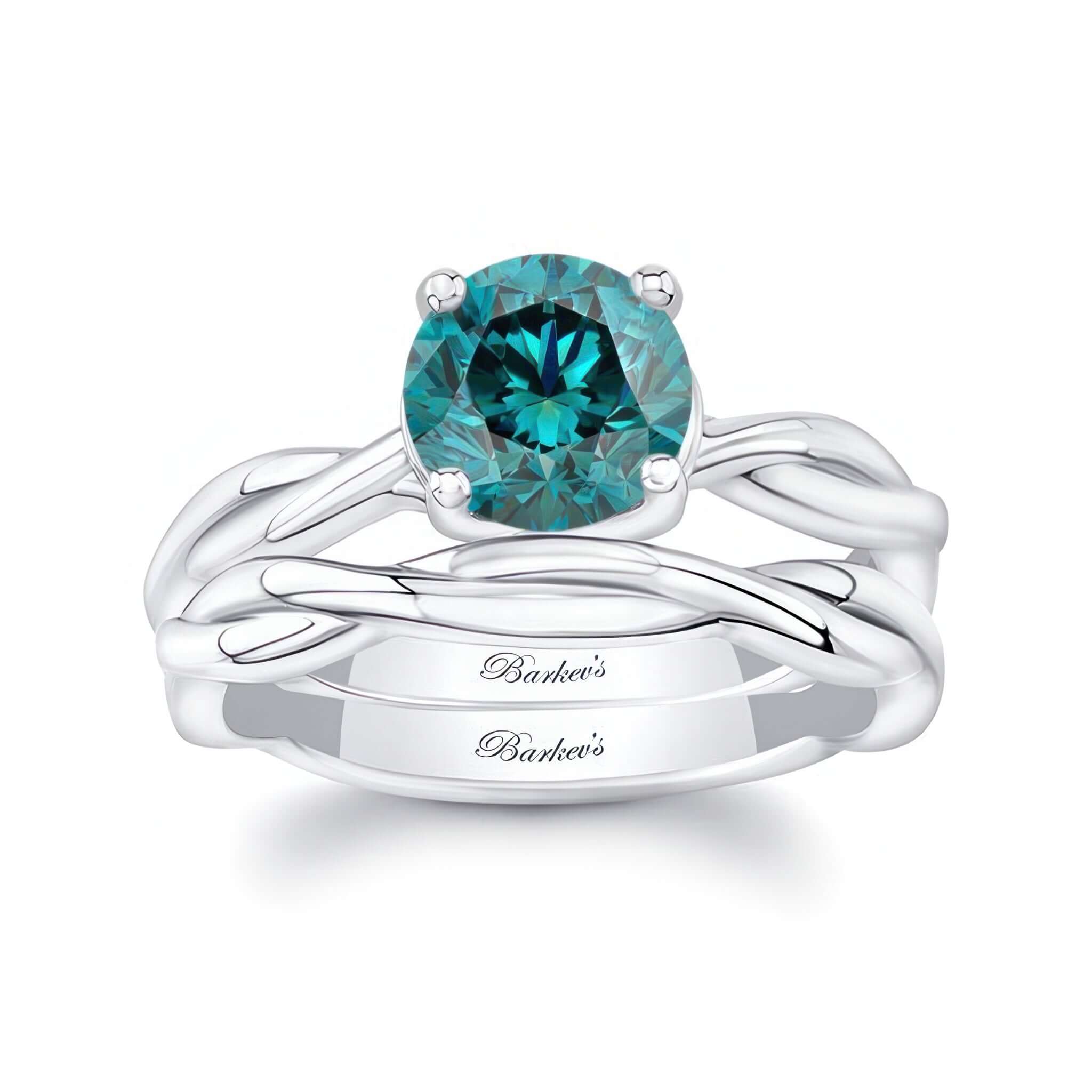 A beautiful blue diamond twist solitaire bridal set featuring a unique curving and twisting shank with a prong set round center and a matching wedding band.
