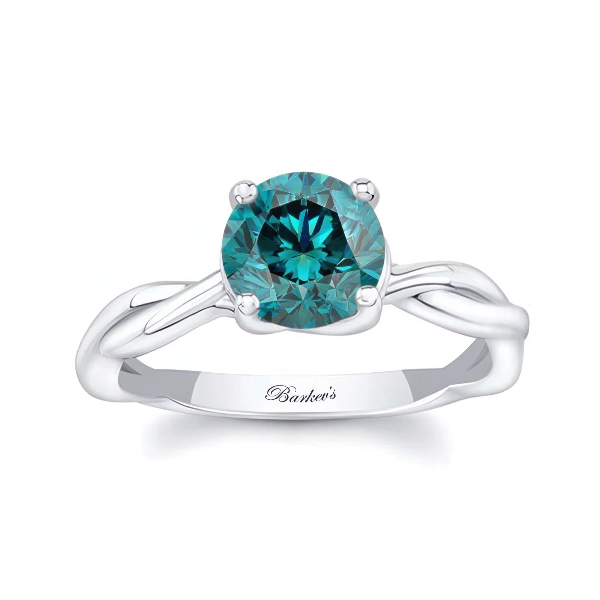 A beautiful blue diamond twist solitaire engagement ring featuring a unique curving and twisting shank with a prong set round center.