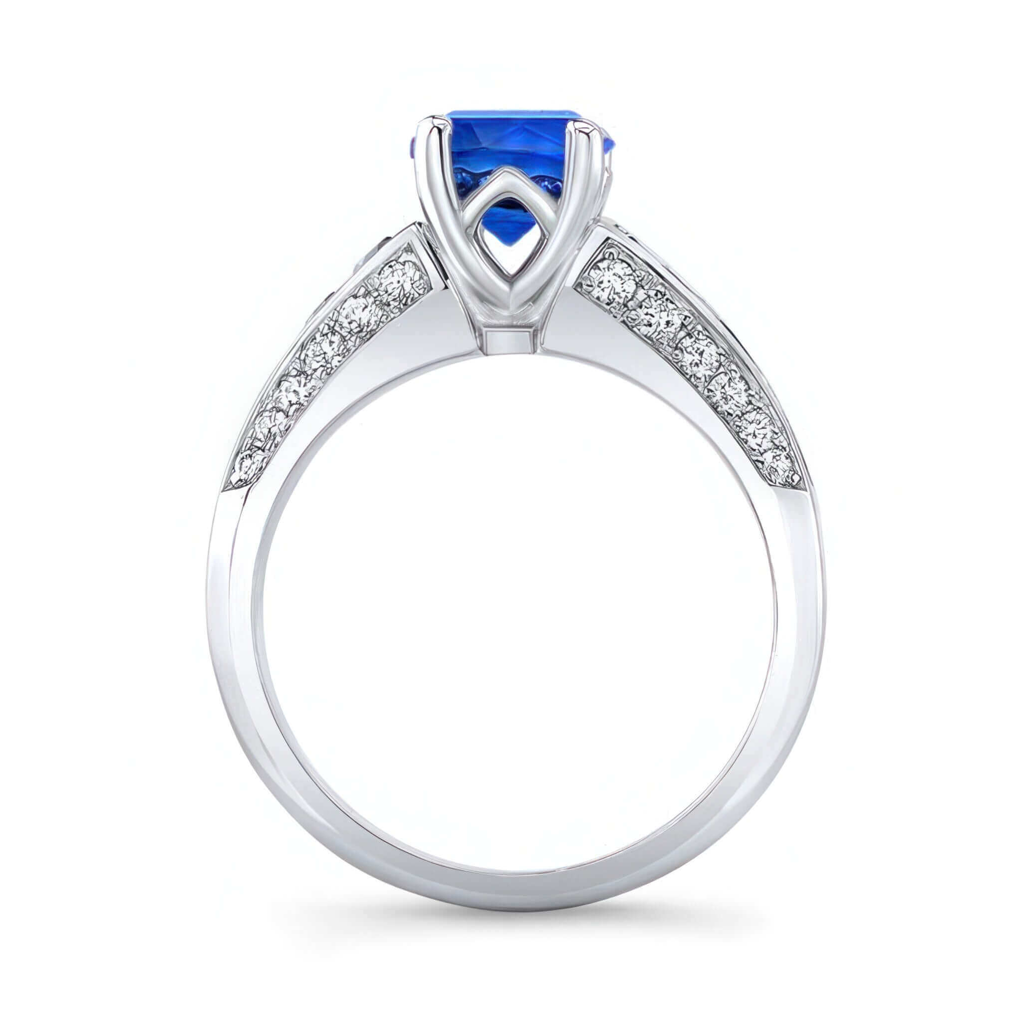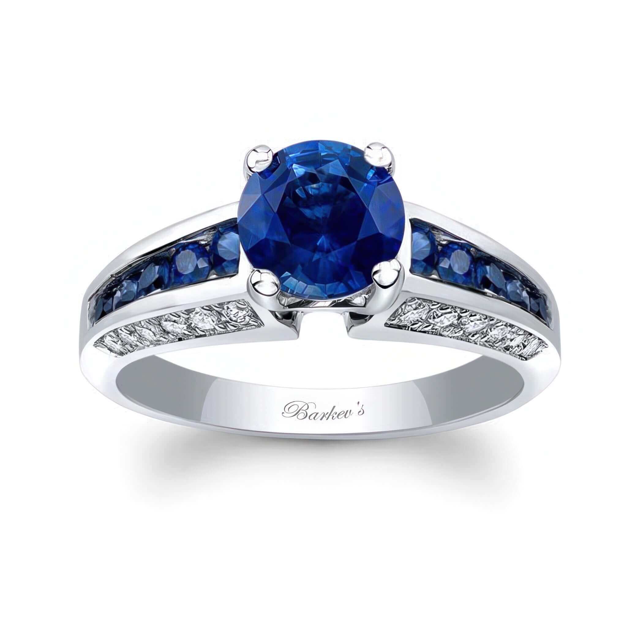 This magnificent blue sapphire channel set ring boasts with sparkle from every angle featuring beveled edges and a round center that is met by a row of channel set blue sapphires and pave white diamonds adorning each side of the shank for an unparalleled brilliance.
