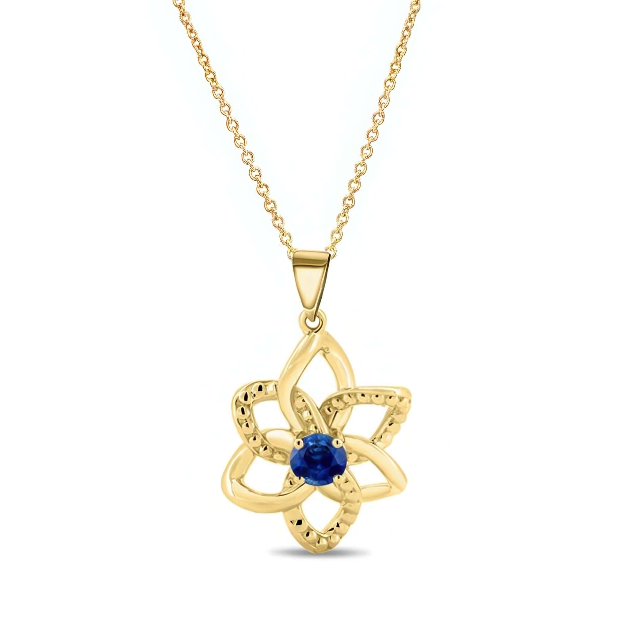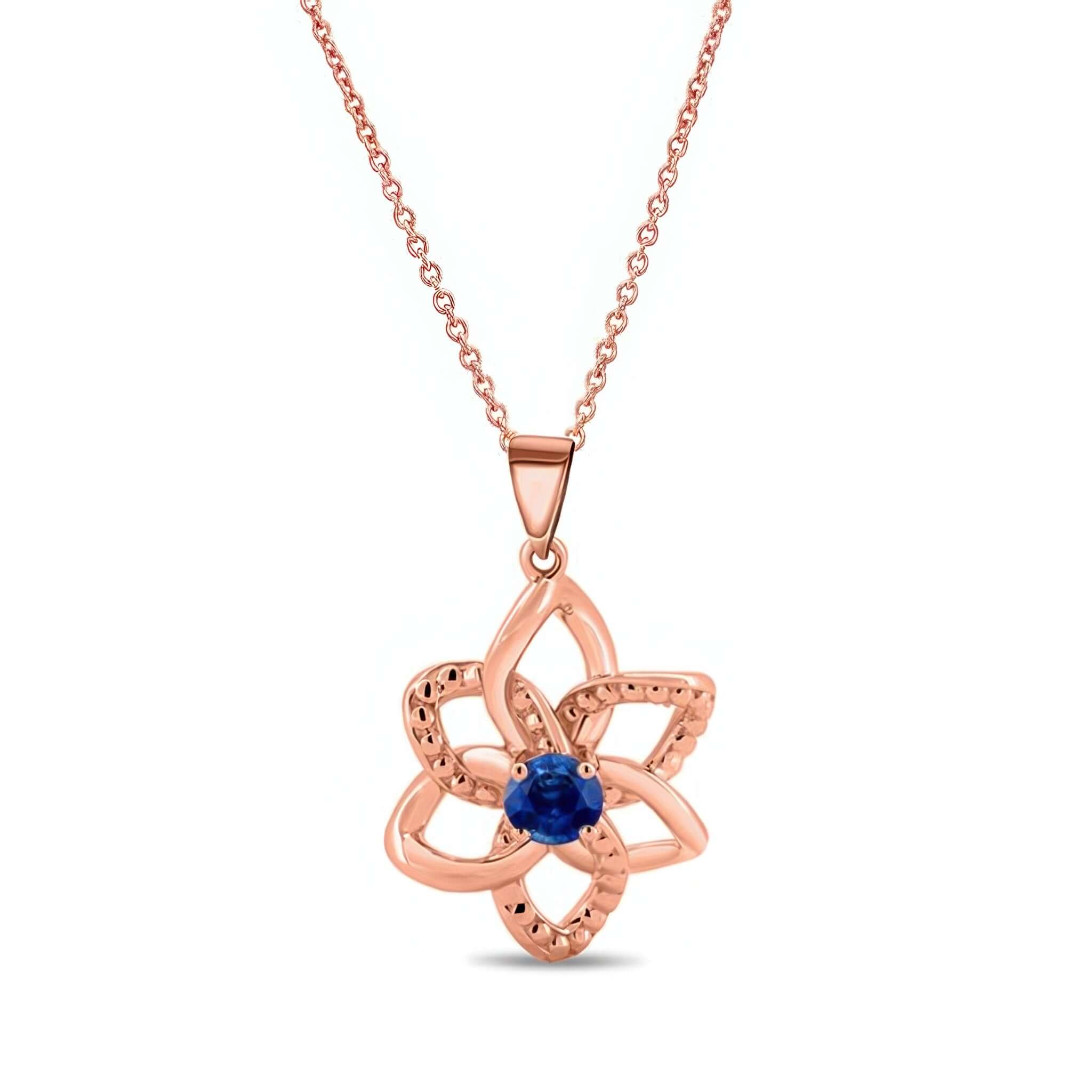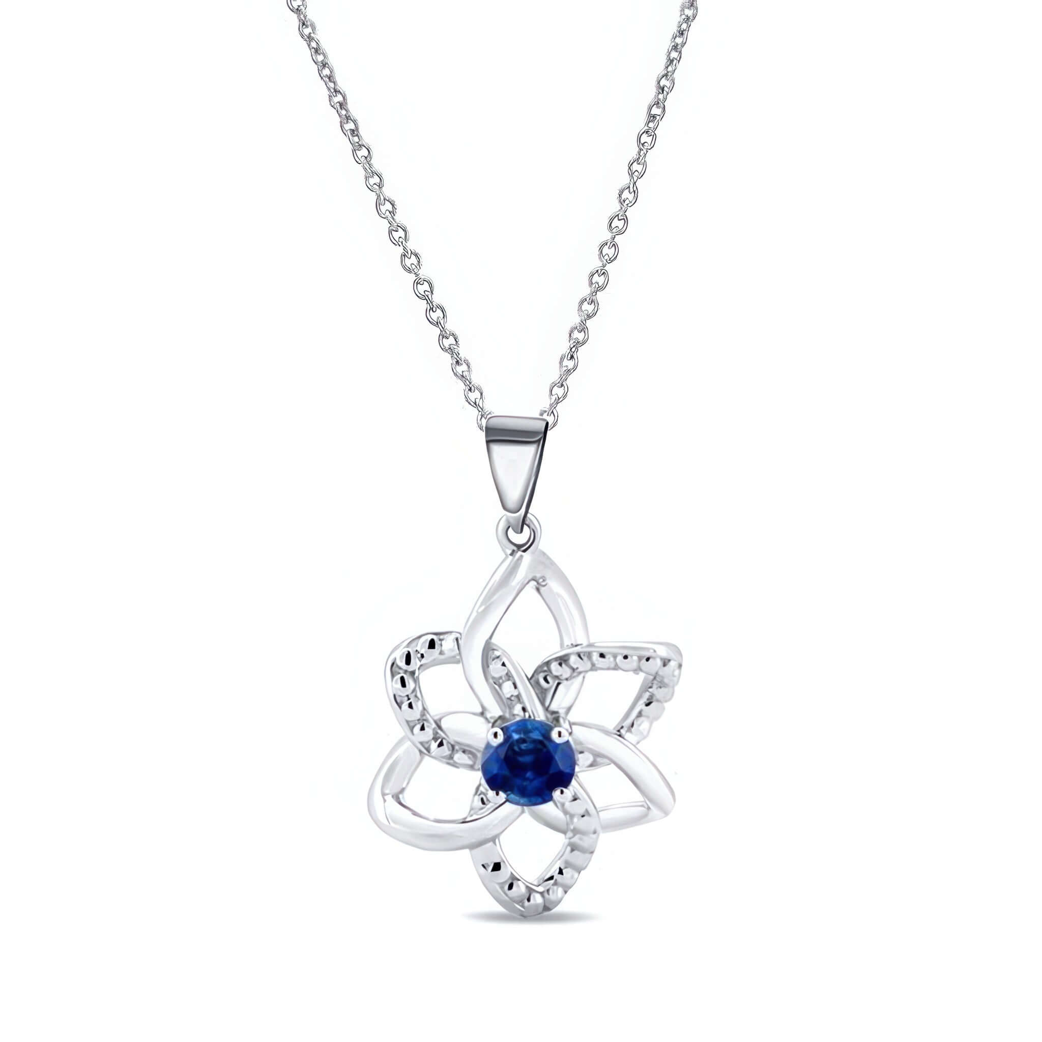 A beautiful blue sapphire flower necklace featuring intertwined leaf shapes and a half carat blue sapphire center.