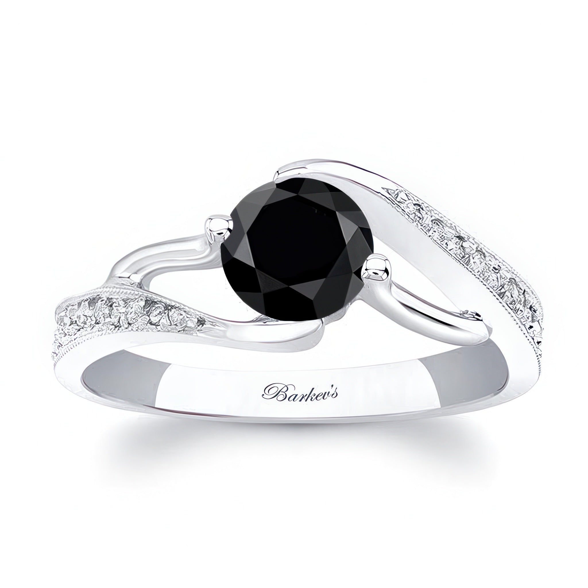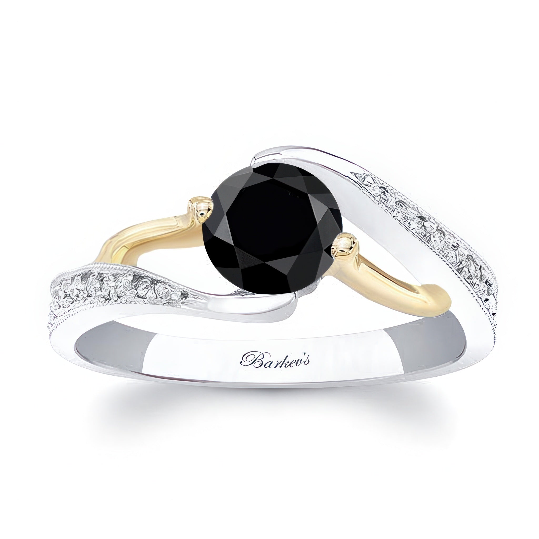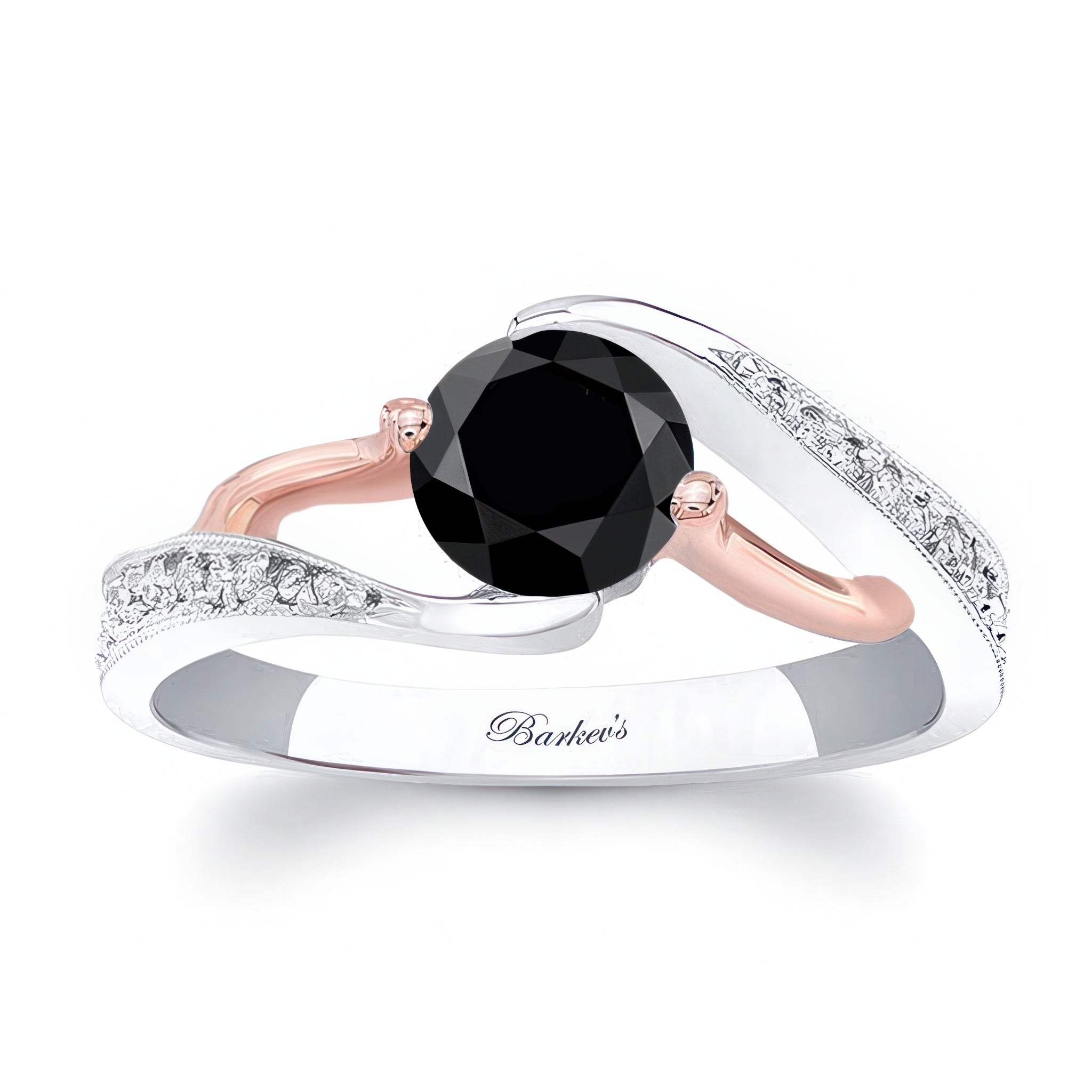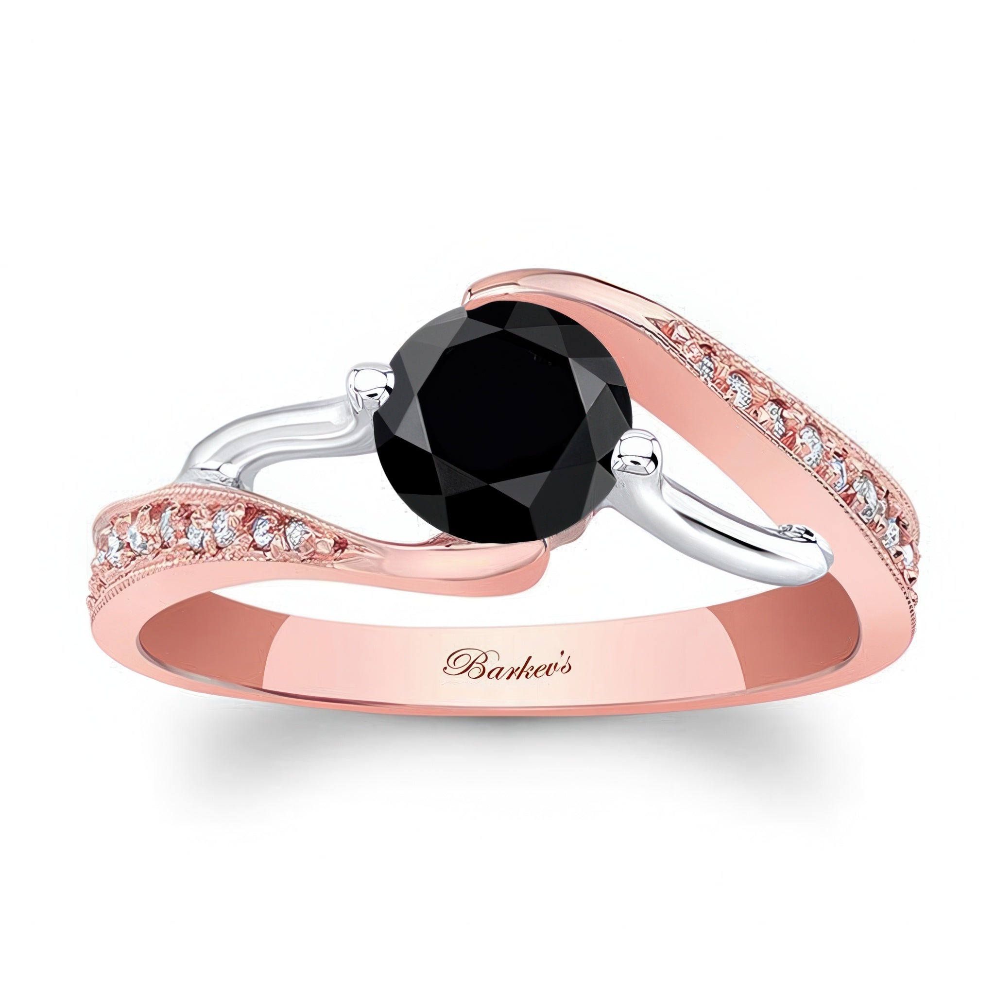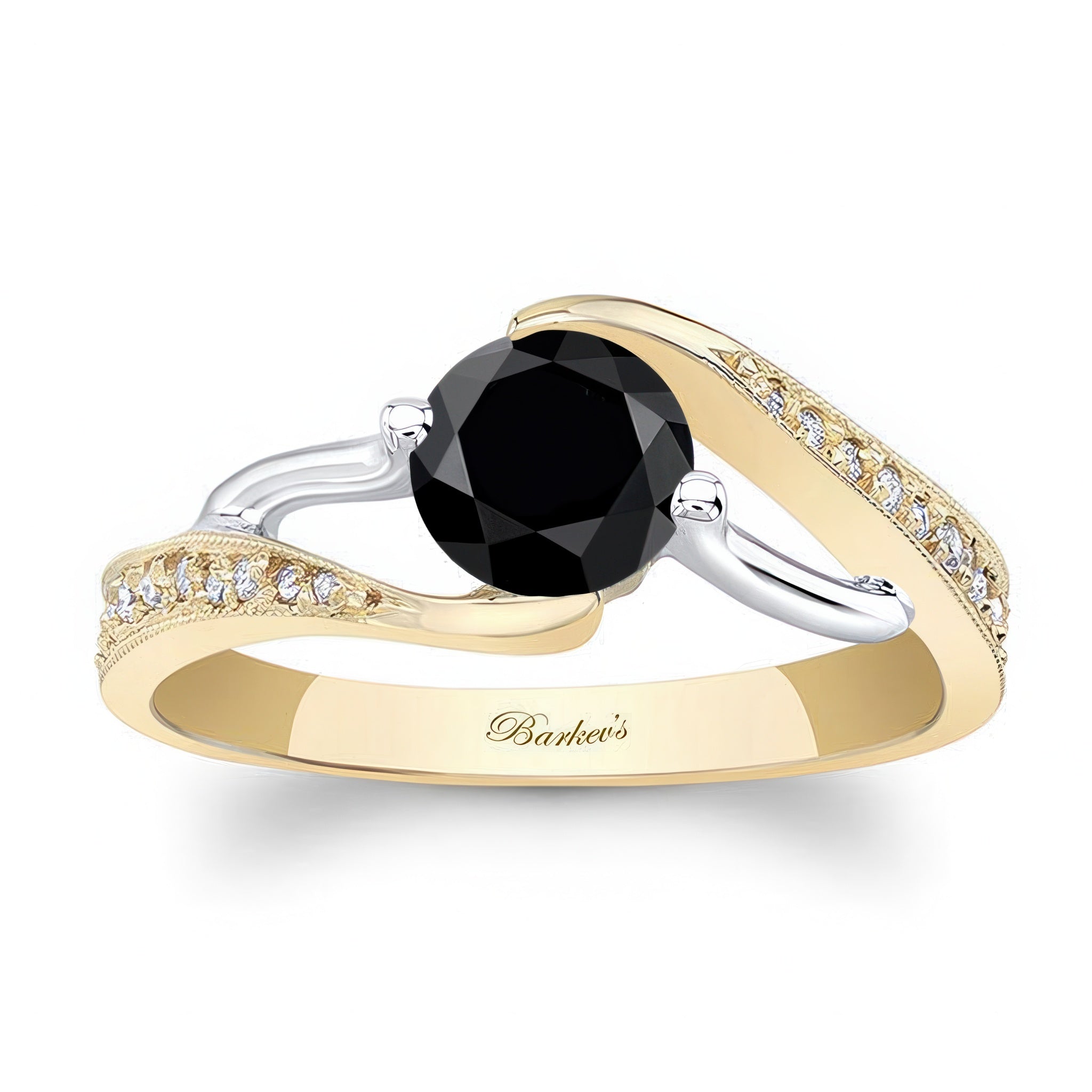 This modern bypass black and white diamond ring has a channel set round center with pave set diamonds on the shoulder and a milgrain finish for a touch of glam.