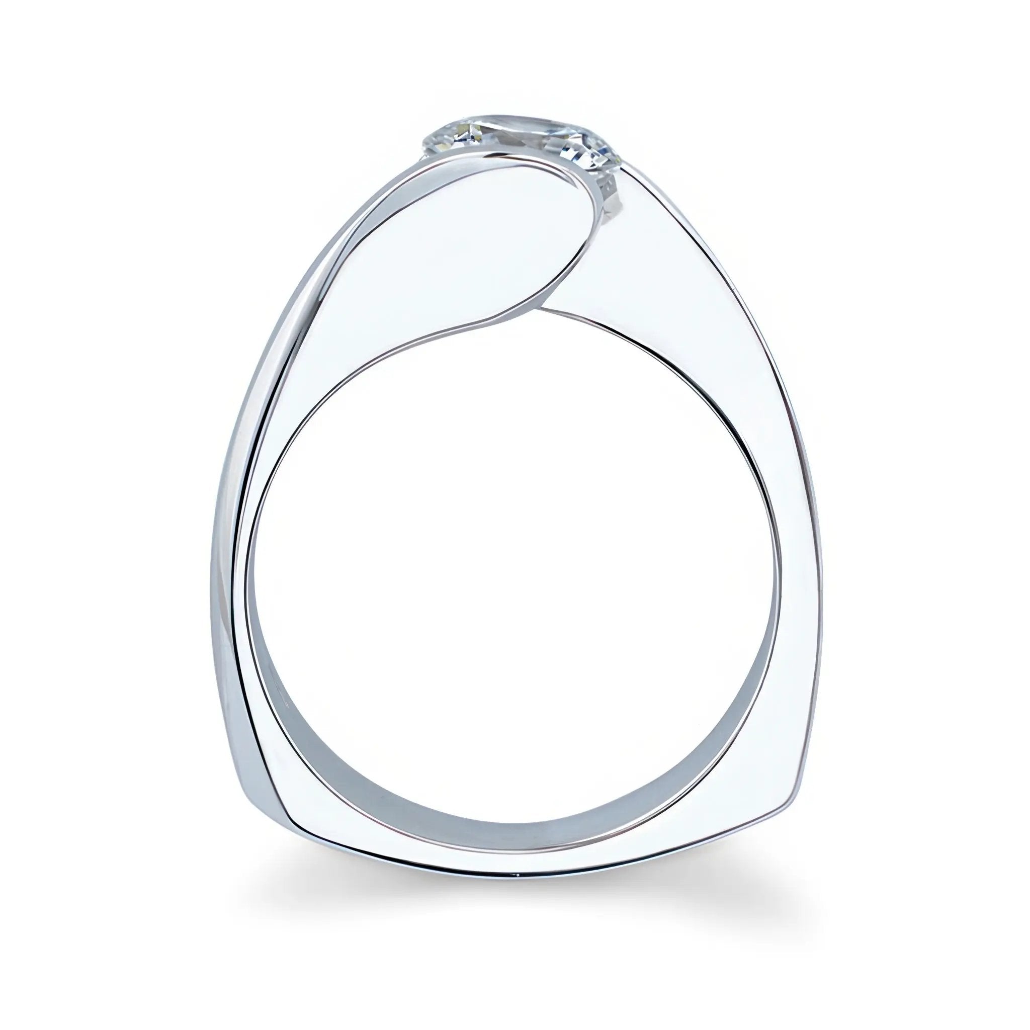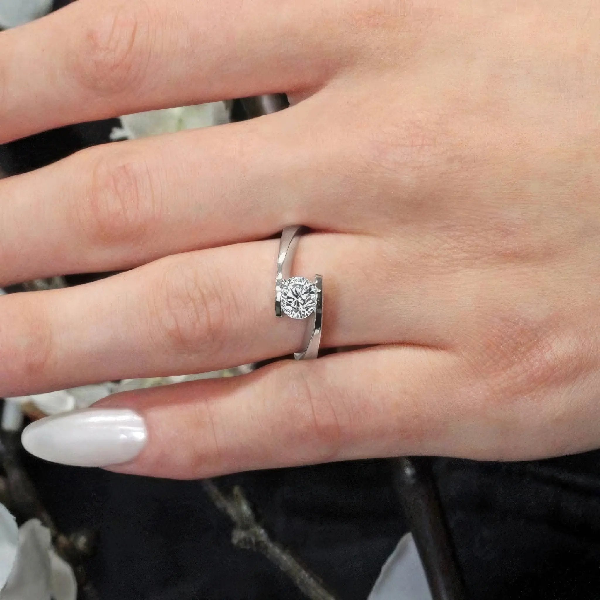 This bypass round solitaire ring features a channel set round center with a wide bypass shank.