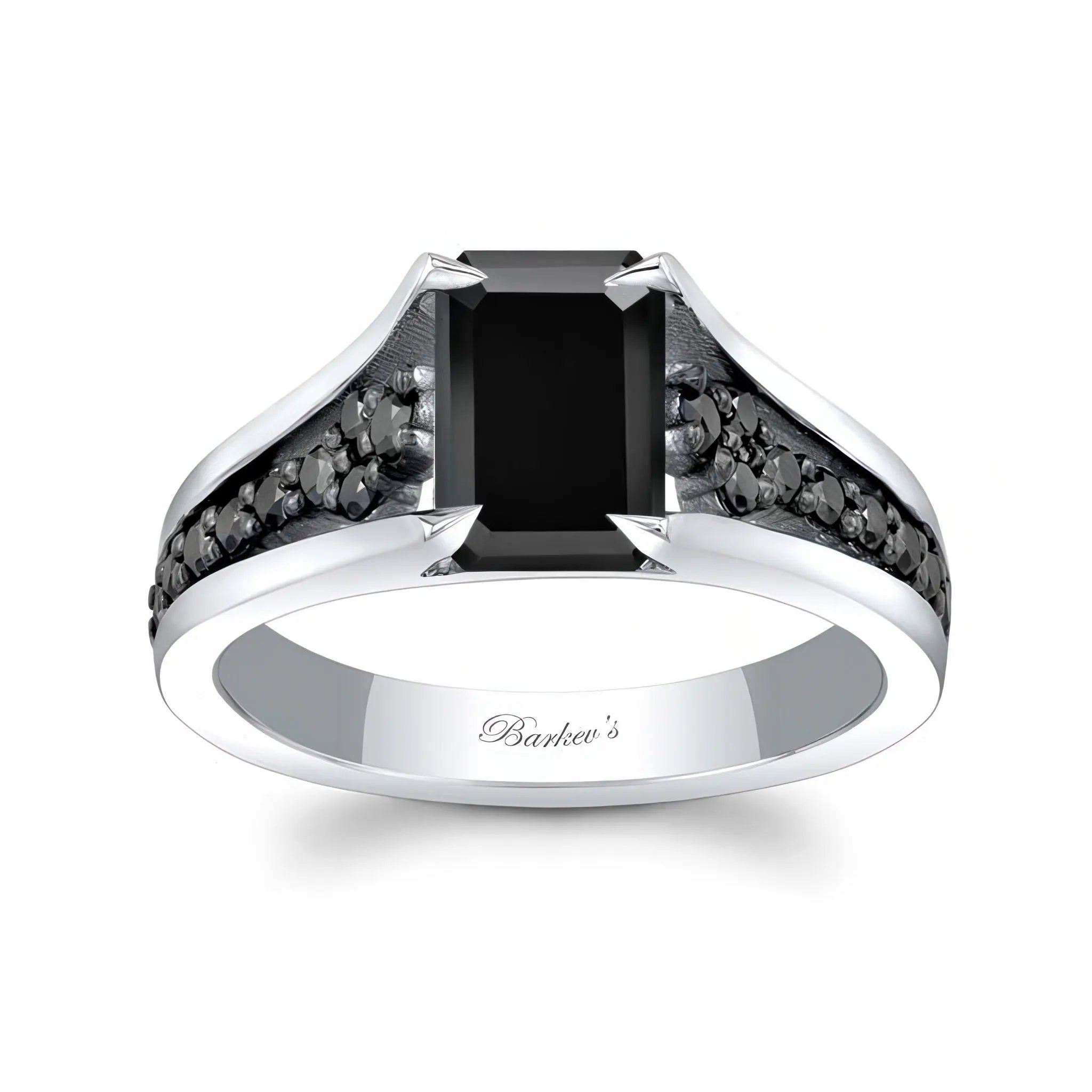 This cathedral emerald cut black diamond ring sports a prong set emerald cut center with shared prong set black diamonds cascading down the shoulders for a classic clean look of sophistication.