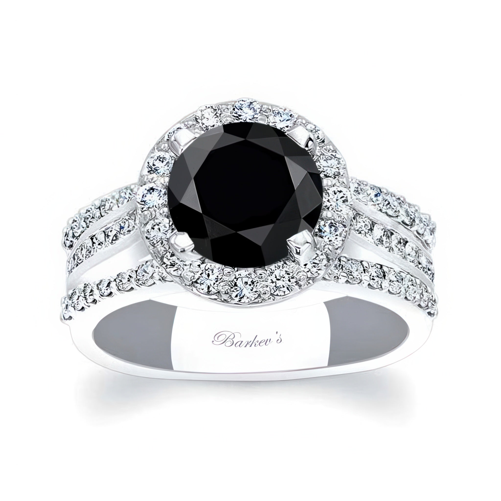A beautiful cathedral halo black and white diamond engagement ring featuring a round center surrounded by a halo and a split shank and cathedral bridge adorned with diamonds.