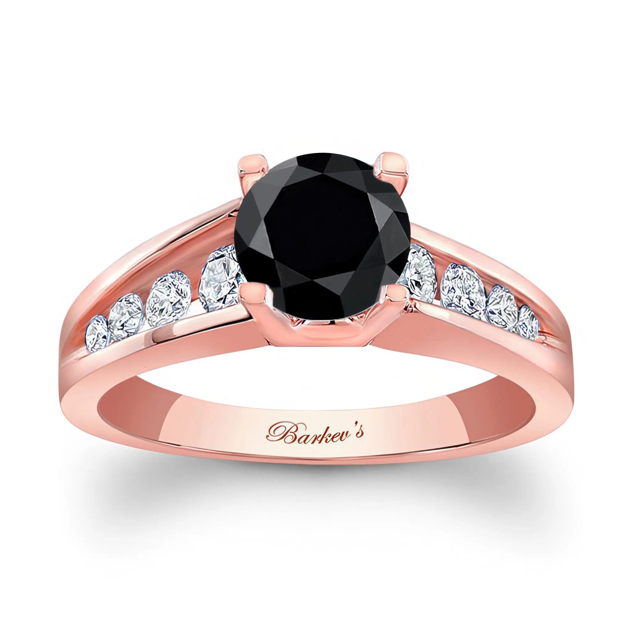 A simple channel band black and white diamond ring featuring a prong set round center and channel set diamonds gracing the varying width shoulders.