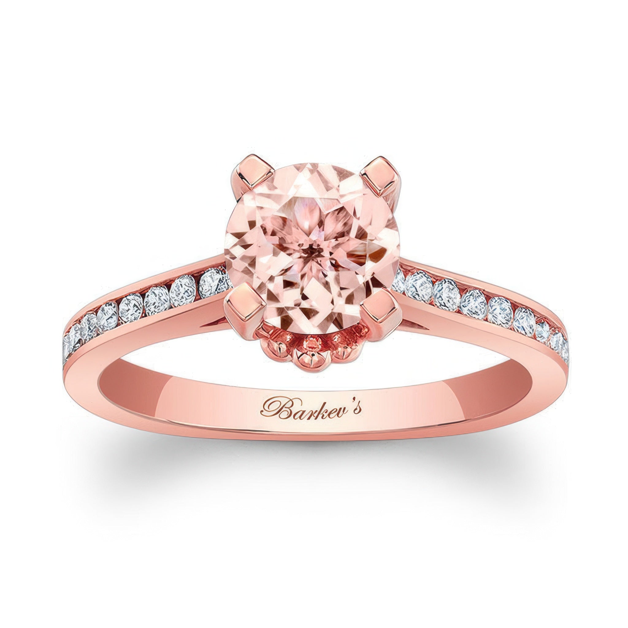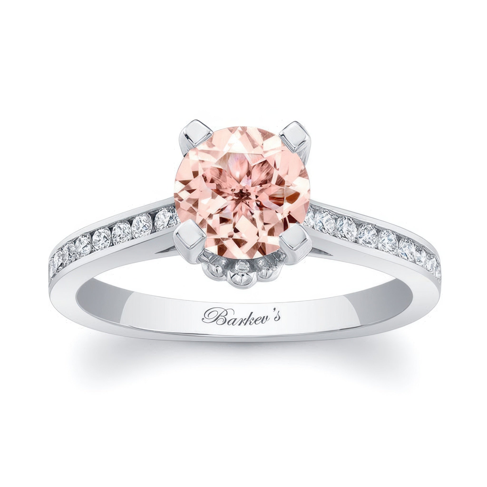 This traditional channel set morganite ring features a prong set round center while channel set diamonds grace it's shoulders for a touch of elegance.