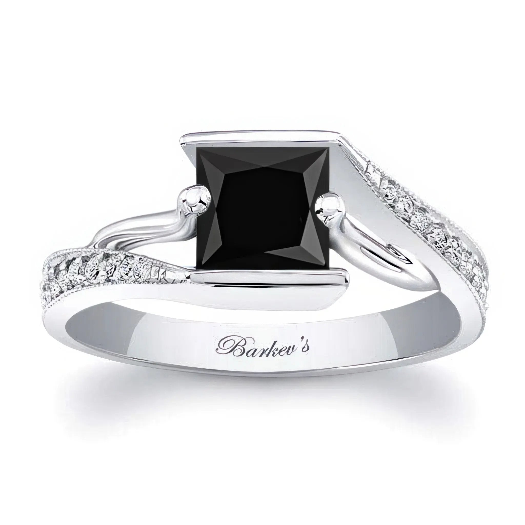 This channel set princess cut black and white diamond ring features a half prong, half channel set center captured by a split cathedral shank with pave set diamonds on the ridges.