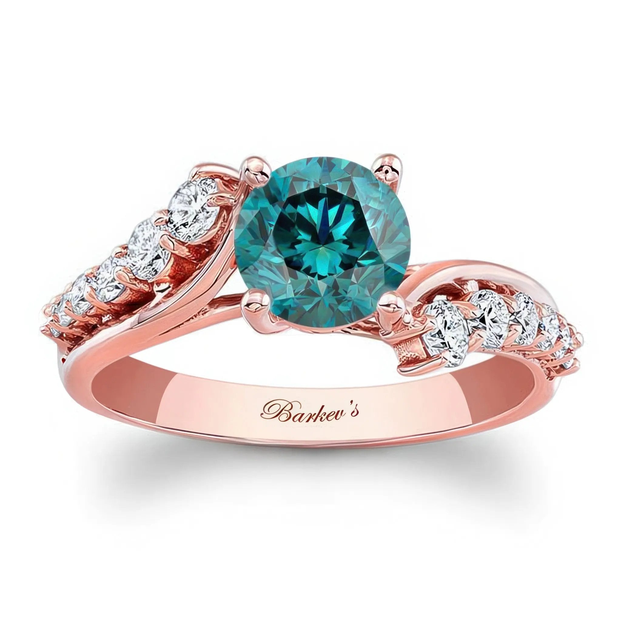 This classic blue and white diamond ring sports a prong set round center with a curving shank adorned with shared prong set diamonds cascading down opposing shoulders for a sophisticated look.