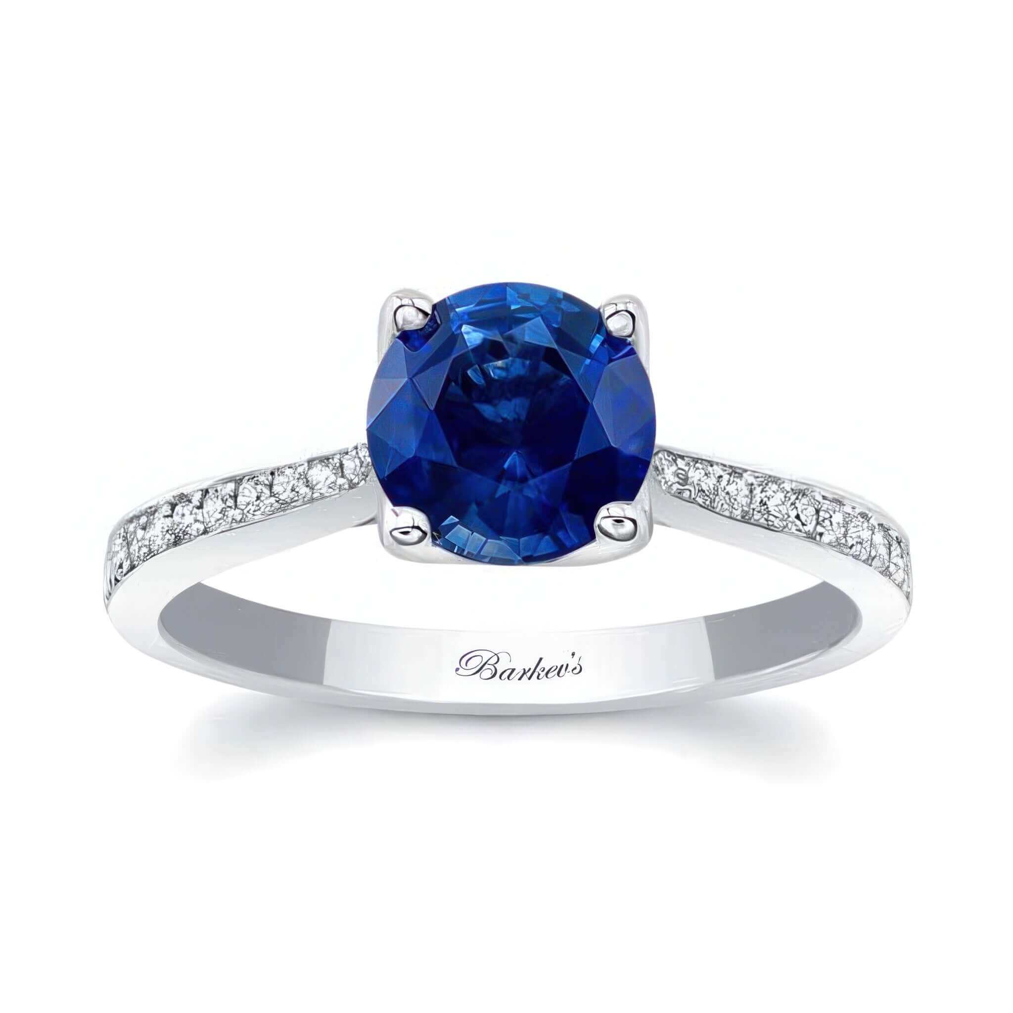 This classic blue sapphire and diamond engagement ring is graced with a delicate shank that meets the prong set round center with glamorous pave set diamonds on the sides adding a final touch of brilliance.